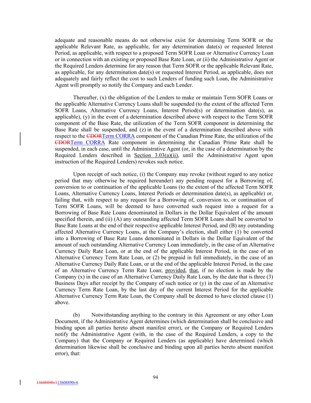 adequate and reasonable means do not otherwise exist for determining Term SOFR or the applicable Relevant Rate, as applicable, for any determination date(s) or requested Interest Period, as applicable, with respect to a proposed Term SOFR Loan or Alternative Currency Loan or in connection with an existing or proposed Base Rate Loan, or (ii) the Administrative Agent or the Required Lenders determine for any reason that Term SOFR or the applicable Relevant Rate, as applicable, for any determination date(s) or requested Interest Period, as applicable, does not adequately and fairly reflect the cost to such Lenders of funding such Loan, the Administrative Agent will promptly so notify the Company and each Lender. Thereafter, (x) the obligation of the Lenders to make or maintain Term SOFR Loans or the applicable Alternative Currency Loans shall be suspended (to the extent of the affected Term SOFR Loans, Alternative Currency Loans, Interest Period(s) or determination date(s), as applicable), (y) in the event of a determination described above with respect to the Term SOFR component of the Base Rate, the utilization of the Term SOFR component in determining the Base Rate shall be suspended, and (z) in the event of a determination described above with respect to the CDORTerm CORRA component of the Canadian Prime Rate, the utilization of the CDORTerm CORRA Rate component in determining the Canadian Prime Rate shall be suspended, in each case, until the Administrative Agent (or, in the case of a determination by the Required Lenders described in Section 3.03(a)(ii), until the Administrative Agent upon instruction of the Required Lenders) revokes such notice. Upon receipt of such notice, (i) the Company may revoke (without regard to any notice period that may otherwise be required hereunder) any pending request for a Borrowing of, conversion to or continuation of the applicable Loans (to the extent of the affected Term SOFR Loans, Alternative Currency Loans, Interest Periods or determination date(s), as applicable) or, failing that, with respect to any request for a Borrowing of, conversion to, or continuation of Term SOFR Loans, will be deemed to have converted such request into a request for a Borrowing of Base Rate Loans denominated in Dollars in the Dollar Equivalent of the amount specified therein, and (ii) (A) any outstanding affected Term SOFR Loans shall be converted to Base Rate Loans at the end of their respective applicable Interest Period, and (B) any outstanding affected Alternative Currency Loans, at the Company’s election, shall either (1) be converted into a Borrowing of Base Rate Loans denominated in Dollars in the Dollar Equivalent of the amount of such outstanding Alternative Currency Loan immediately, in the case of an Alternative Currency Daily Rate Loan, or at the end of the applicable Interest Period, in the case of an Alternative Currency Term Rate Loan, or (2) be prepaid in full immediately, in the case of an Alternative Currency Daily Rate Loan, or at the end of the applicable Interest Period, in the case of an Alternative Currency Term Rate Loan; provided, that, if no election is made by the Company (x) in the case of an Alternative Currency Daily Rate Loan, by the date that is three (3) Business Days after receipt by the Company of such notice or (y) in the case of an Alternative Currency Term Rate Loan, by the last day of the current Interest Period for the applicable Alternative Currency Term Rate Loan, the Company shall be deemed to have elected clause (1) above. (b) Notwithstanding anything to the contrary in this Agreement or any other Loan Document, if the Administrative Agent determines (which determination shall be conclusive and binding upon all parties hereto absent manifest error), or the Company or Required Lenders notify the Administrative Agent (with, in the case of the Required Lenders, a copy to the Company) that the Company or Required Lenders (as applicable) have determined (which determination likewise shall be conclusive and binding upon all parties hereto absent manifest error), that: 94 13608890v113608890v4