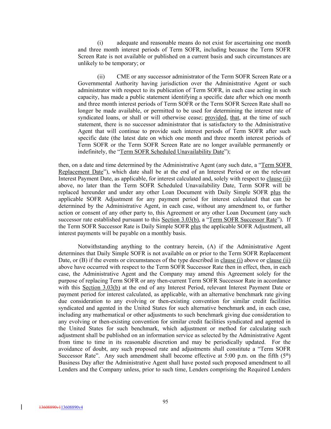 (i) adequate and reasonable means do not exist for ascertaining one month and three month interest periods of Term SOFR, including because the Term SOFR Screen Rate is not available or published on a current basis and such circumstances are unlikely to be temporary; or (ii) CME or any successor administrator of the Term SOFR Screen Rate or a Governmental Authority having jurisdiction over the Administrative Agent or such administrator with respect to its publication of Term SOFR, in each case acting in such capacity, has made a public statement identifying a specific date after which one month and three month interest periods of Term SOFR or the Term SOFR Screen Rate shall no longer be made available, or permitted to be used for determining the interest rate of syndicated loans, or shall or will otherwise cease; provided, that, at the time of such statement, there is no successor administrator that is satisfactory to the Administrative Agent that will continue to provide such interest periods of Term SOFR after such specific date (the latest date on which one month and three month interest periods of Term SOFR or the Term SOFR Screen Rate are no longer available permanently or indefinitely, the “Term SOFR Scheduled Unavailability Date”); then, on a date and time determined by the Administrative Agent (any such date, a “Term SOFR Replacement Date”), which date shall be at the end of an Interest Period or on the relevant Interest Payment Date, as applicable, for interest calculated and, solely with respect to clause (ii) above, no later than the Term SOFR Scheduled Unavailability Date, Term SOFR will be replaced hereunder and under any other Loan Document with Daily Simple SOFR plus the applicable SOFR Adjustment for any payment period for interest calculated that can be determined by the Administrative Agent, in each case, without any amendment to, or further action or consent of any other party to, this Agreement or any other Loan Document (any such successor rate established pursuant to this Section 3.03(b), a “Term SOFR Successor Rate”). If the Term SOFR Successor Rate is Daily Simple SOFR plus the applicable SOFR Adjustment, all interest payments will be payable on a monthly basis. Notwithstanding anything to the contrary herein, (A) if the Administrative Agent determines that Daily Simple SOFR is not available on or prior to the Term SOFR Replacement Date, or (B) if the events or circumstances of the type described in clause (i) above or clause (ii) above have occurred with respect to the Term SOFR Successor Rate then in effect, then, in each case, the Administrative Agent and the Company may amend this Agreement solely for the purpose of replacing Term SOFR or any then-current Term SOFR Successor Rate in accordance with this Section 3.03(b) at the end of any Interest Period, relevant Interest Payment Date or payment period for interest calculated, as applicable, with an alternative benchmark rate giving due consideration to any evolving or then-existing convention for similar credit facilities syndicated and agented in the United States for such alternative benchmark and, in each case, including any mathematical or other adjustments to such benchmark giving due consideration to any evolving or then-existing convention for similar credit facilities syndicated and agented in the United States for such benchmark, which adjustment or method for calculating such adjustment shall be published on an information service as selected by the Administrative Agent from time to time in its reasonable discretion and may be periodically updated. For the avoidance of doubt, any such proposed rate and adjustments shall constitute a “Term SOFR Successor Rate”. Any such amendment shall become effective at 5:00 p.m. on the fifth (5th) Business Day after the Administrative Agent shall have posted such proposed amendment to all Lenders and the Company unless, prior to such time, Lenders comprising the Required Lenders 95 13608890v113608890v4