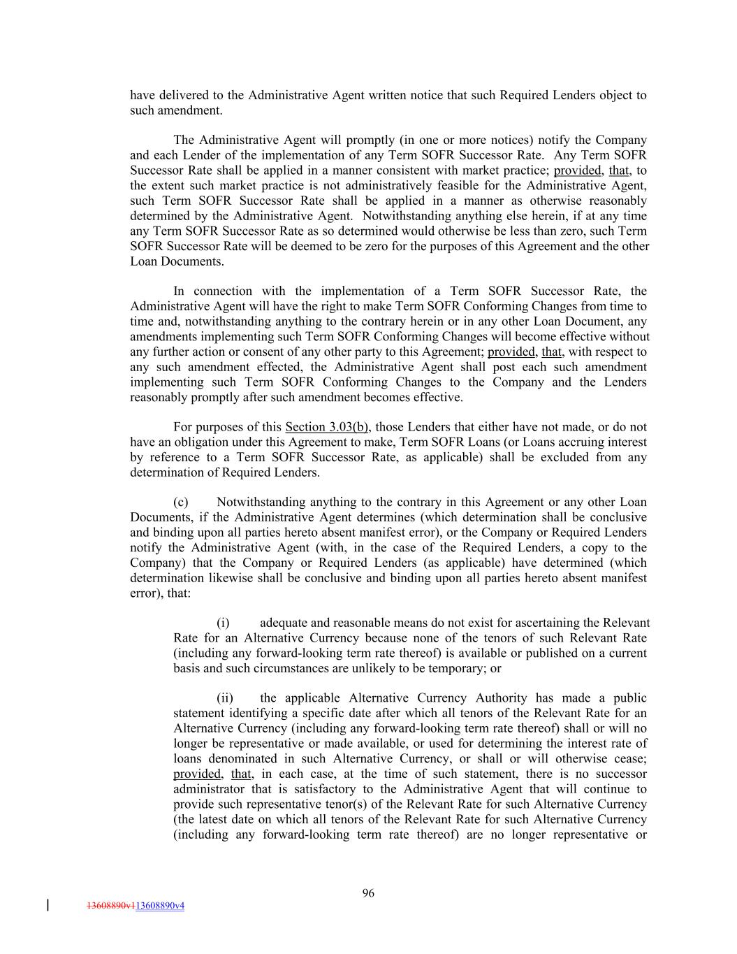 have delivered to the Administrative Agent written notice that such Required Lenders object to such amendment. The Administrative Agent will promptly (in one or more notices) notify the Company and each Lender of the implementation of any Term SOFR Successor Rate. Any Term SOFR Successor Rate shall be applied in a manner consistent with market practice; provided, that, to the extent such market practice is not administratively feasible for the Administrative Agent, such Term SOFR Successor Rate shall be applied in a manner as otherwise reasonably determined by the Administrative Agent. Notwithstanding anything else herein, if at any time any Term SOFR Successor Rate as so determined would otherwise be less than zero, such Term SOFR Successor Rate will be deemed to be zero for the purposes of this Agreement and the other Loan Documents. In connection with the implementation of a Term SOFR Successor Rate, the Administrative Agent will have the right to make Term SOFR Conforming Changes from time to time and, notwithstanding anything to the contrary herein or in any other Loan Document, any amendments implementing such Term SOFR Conforming Changes will become effective without any further action or consent of any other party to this Agreement; provided, that, with respect to any such amendment effected, the Administrative Agent shall post each such amendment implementing such Term SOFR Conforming Changes to the Company and the Lenders reasonably promptly after such amendment becomes effective. For purposes of this Section 3.03(b), those Lenders that either have not made, or do not have an obligation under this Agreement to make, Term SOFR Loans (or Loans accruing interest by reference to a Term SOFR Successor Rate, as applicable) shall be excluded from any determination of Required Lenders. (c) Notwithstanding anything to the contrary in this Agreement or any other Loan Documents, if the Administrative Agent determines (which determination shall be conclusive and binding upon all parties hereto absent manifest error), or the Company or Required Lenders notify the Administrative Agent (with, in the case of the Required Lenders, a copy to the Company) that the Company or Required Lenders (as applicable) have determined (which determination likewise shall be conclusive and binding upon all parties hereto absent manifest error), that: (i) adequate and reasonable means do not exist for ascertaining the Relevant Rate for an Alternative Currency because none of the tenors of such Relevant Rate (including any forward-looking term rate thereof) is available or published on a current basis and such circumstances are unlikely to be temporary; or (ii) the applicable Alternative Currency Authority has made a public statement identifying a specific date after which all tenors of the Relevant Rate for an Alternative Currency (including any forward-looking term rate thereof) shall or will no longer be representative or made available, or used for determining the interest rate of loans denominated in such Alternative Currency, or shall or will otherwise cease; provided, that, in each case, at the time of such statement, there is no successor administrator that is satisfactory to the Administrative Agent that will continue to provide such representative tenor(s) of the Relevant Rate for such Alternative Currency (the latest date on which all tenors of the Relevant Rate for such Alternative Currency (including any forward-looking term rate thereof) are no longer representative or 96 13608890v113608890v4