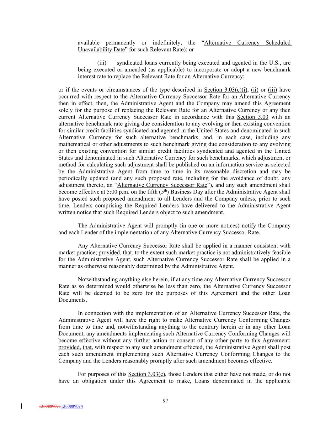 available permanently or indefinitely, the “Alternative Currency Scheduled Unavailability Date” for such Relevant Rate); or (iii) syndicated loans currently being executed and agented in the U.S., are being executed or amended (as applicable) to incorporate or adopt a new benchmark interest rate to replace the Relevant Rate for an Alternative Currency; or if the events or circumstances of the type described in Section 3.03(c)(i), (ii) or (iii) have occurred with respect to the Alternative Currency Successor Rate for an Alternative Currency then in effect, then, the Administrative Agent and the Company may amend this Agreement solely for the purpose of replacing the Relevant Rate for an Alternative Currency or any then current Alternative Currency Successor Rate in accordance with this Section 3.03 with an alternative benchmark rate giving due consideration to any evolving or then existing convention for similar credit facilities syndicated and agented in the United States and denominated in such Alternative Currency for such alternative benchmarks, and, in each case, including any mathematical or other adjustments to such benchmark giving due consideration to any evolving or then existing convention for similar credit facilities syndicated and agented in the United States and denominated in such Alternative Currency for such benchmarks, which adjustment or method for calculating such adjustment shall be published on an information service as selected by the Administrative Agent from time to time in its reasonable discretion and may be periodically updated (and any such proposed rate, including for the avoidance of doubt, any adjustment thereto, an “Alternative Currency Successor Rate”), and any such amendment shall become effective at 5:00 p.m. on the fifth (5th) Business Day after the Administrative Agent shall have posted such proposed amendment to all Lenders and the Company unless, prior to such time, Lenders comprising the Required Lenders have delivered to the Administrative Agent written notice that such Required Lenders object to such amendment. The Administrative Agent will promptly (in one or more notices) notify the Company and each Lender of the implementation of any Alternative Currency Successor Rate. Any Alternative Currency Successor Rate shall be applied in a manner consistent with market practice; provided, that, to the extent such market practice is not administratively feasible for the Administrative Agent, such Alternative Currency Successor Rate shall be applied in a manner as otherwise reasonably determined by the Administrative Agent. Notwithstanding anything else herein, if at any time any Alternative Currency Successor Rate as so determined would otherwise be less than zero, the Alternative Currency Successor Rate will be deemed to be zero for the purposes of this Agreement and the other Loan Documents. In connection with the implementation of an Alternative Currency Successor Rate, the Administrative Agent will have the right to make Alternative Currency Conforming Changes from time to time and, notwithstanding anything to the contrary herein or in any other Loan Document, any amendments implementing such Alternative Currency Conforming Changes will become effective without any further action or consent of any other party to this Agreement; provided, that, with respect to any such amendment effected, the Administrative Agent shall post each such amendment implementing such Alternative Currency Conforming Changes to the Company and the Lenders reasonably promptly after such amendment becomes effective. For purposes of this Section 3.03(c), those Lenders that either have not made, or do not have an obligation under this Agreement to make, Loans denominated in the applicable 97 13608890v113608890v4