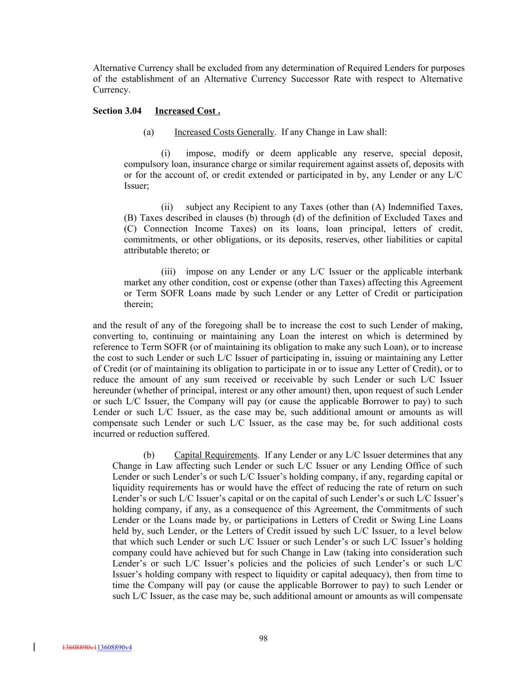 Alternative Currency shall be excluded from any determination of Required Lenders for purposes of the establishment of an Alternative Currency Successor Rate with respect to Alternative Currency. Section 3.04 Increased Cost . (a) Increased Costs Generally. If any Change in Law shall: (i) impose, modify or deem applicable any reserve, special deposit, compulsory loan, insurance charge or similar requirement against assets of, deposits with or for the account of, or credit extended or participated in by, any Lender or any L/C Issuer; (ii) subject any Recipient to any Taxes (other than (A) Indemnified Taxes, (B) Taxes described in clauses (b) through (d) of the definition of Excluded Taxes and (C) Connection Income Taxes) on its loans, loan principal, letters of credit, commitments, or other obligations, or its deposits, reserves, other liabilities or capital attributable thereto; or (iii) impose on any Lender or any L/C Issuer or the applicable interbank market any other condition, cost or expense (other than Taxes) affecting this Agreement or Term SOFR Loans made by such Lender or any Letter of Credit or participation therein; and the result of any of the foregoing shall be to increase the cost to such Lender of making, converting to, continuing or maintaining any Loan the interest on which is determined by reference to Term SOFR (or of maintaining its obligation to make any such Loan), or to increase the cost to such Lender or such L/C Issuer of participating in, issuing or maintaining any Letter of Credit (or of maintaining its obligation to participate in or to issue any Letter of Credit), or to reduce the amount of any sum received or receivable by such Lender or such L/C Issuer hereunder (whether of principal, interest or any other amount) then, upon request of such Lender or such L/C Issuer, the Company will pay (or cause the applicable Borrower to pay) to such Lender or such L/C Issuer, as the case may be, such additional amount or amounts as will compensate such Lender or such L/C Issuer, as the case may be, for such additional costs incurred or reduction suffered. (b) Capital Requirements. If any Lender or any L/C Issuer determines that any Change in Law affecting such Lender or such L/C Issuer or any Lending Office of such Lender or such Lender’s or such L/C Issuer’s holding company, if any, regarding capital or liquidity requirements has or would have the effect of reducing the rate of return on such Lender’s or such L/C Issuer’s capital or on the capital of such Lender’s or such L/C Issuer’s holding company, if any, as a consequence of this Agreement, the Commitments of such Lender or the Loans made by, or participations in Letters of Credit or Swing Line Loans held by, such Lender, or the Letters of Credit issued by such L/C Issuer, to a level below that which such Lender or such L/C Issuer or such Lender’s or such L/C Issuer’s holding company could have achieved but for such Change in Law (taking into consideration such Lender’s or such L/C Issuer’s policies and the policies of such Lender’s or such L/C Issuer’s holding company with respect to liquidity or capital adequacy), then from time to time the Company will pay (or cause the applicable Borrower to pay) to such Lender or such L/C Issuer, as the case may be, such additional amount or amounts as will compensate 98 13608890v113608890v4