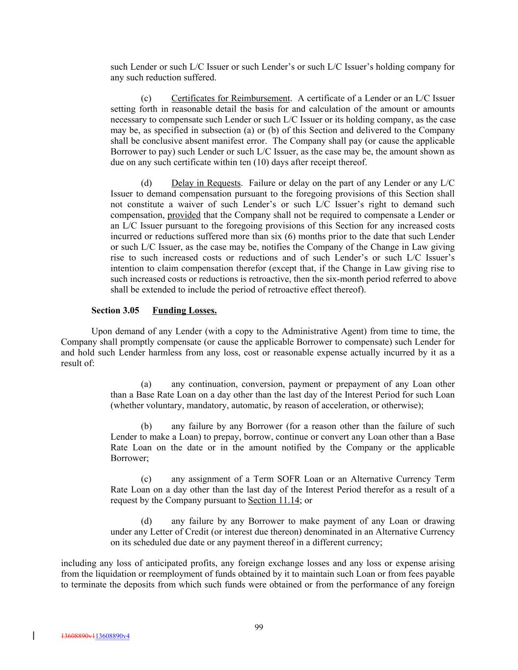 such Lender or such L/C Issuer or such Lender’s or such L/C Issuer’s holding company for any such reduction suffered. (c) Certificates for Reimbursement. A certificate of a Lender or an L/C Issuer setting forth in reasonable detail the basis for and calculation of the amount or amounts necessary to compensate such Lender or such L/C Issuer or its holding company, as the case may be, as specified in subsection (a) or (b) of this Section and delivered to the Company shall be conclusive absent manifest error. The Company shall pay (or cause the applicable Borrower to pay) such Lender or such L/C Issuer, as the case may be, the amount shown as due on any such certificate within ten (10) days after receipt thereof. (d) Delay in Requests. Failure or delay on the part of any Lender or any L/C Issuer to demand compensation pursuant to the foregoing provisions of this Section shall not constitute a waiver of such Lender’s or such L/C Issuer’s right to demand such compensation, provided that the Company shall not be required to compensate a Lender or an L/C Issuer pursuant to the foregoing provisions of this Section for any increased costs incurred or reductions suffered more than six (6) months prior to the date that such Lender or such L/C Issuer, as the case may be, notifies the Company of the Change in Law giving rise to such increased costs or reductions and of such Lender’s or such L/C Issuer’s intention to claim compensation therefor (except that, if the Change in Law giving rise to such increased costs or reductions is retroactive, then the six-month period referred to above shall be extended to include the period of retroactive effect thereof). Section 3.05 Funding Losses. Upon demand of any Lender (with a copy to the Administrative Agent) from time to time, the Company shall promptly compensate (or cause the applicable Borrower to compensate) such Lender for and hold such Lender harmless from any loss, cost or reasonable expense actually incurred by it as a result of: (a) any continuation, conversion, payment or prepayment of any Loan other than a Base Rate Loan on a day other than the last day of the Interest Period for such Loan (whether voluntary, mandatory, automatic, by reason of acceleration, or otherwise); (b) any failure by any Borrower (for a reason other than the failure of such Lender to make a Loan) to prepay, borrow, continue or convert any Loan other than a Base Rate Loan on the date or in the amount notified by the Company or the applicable Borrower; (c) any assignment of a Term SOFR Loan or an Alternative Currency Term Rate Loan on a day other than the last day of the Interest Period therefor as a result of a request by the Company pursuant to Section 11.14; or (d) any failure by any Borrower to make payment of any Loan or drawing under any Letter of Credit (or interest due thereon) denominated in an Alternative Currency on its scheduled due date or any payment thereof in a different currency; including any loss of anticipated profits, any foreign exchange losses and any loss or expense arising from the liquidation or reemployment of funds obtained by it to maintain such Loan or from fees payable to terminate the deposits from which such funds were obtained or from the performance of any foreign 99 13608890v113608890v4