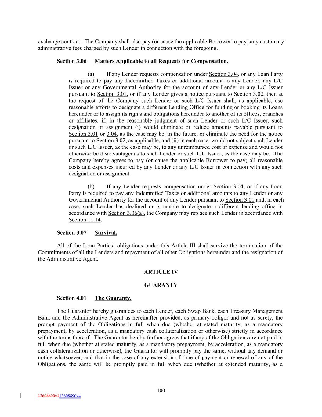 exchange contract. The Company shall also pay (or cause the applicable Borrower to pay) any customary administrative fees charged by such Lender in connection with the foregoing. Section 3.06 Matters Applicable to all Requests for Compensation. (a) If any Lender requests compensation under Section 3.04, or any Loan Party is required to pay any Indemnified Taxes or additional amount to any Lender, any L/C Issuer or any Governmental Authority for the account of any Lender or any L/C Issuer pursuant to Section 3.01, or if any Lender gives a notice pursuant to Section 3.02, then at the request of the Company such Lender or such L/C Issuer shall, as applicable, use reasonable efforts to designate a different Lending Office for funding or booking its Loans hereunder or to assign its rights and obligations hereunder to another of its offices, branches or affiliates, if, in the reasonable judgment of such Lender or such L/C Issuer, such designation or assignment (i) would eliminate or reduce amounts payable pursuant to Section 3.01 or 3.04, as the case may be, in the future, or eliminate the need for the notice pursuant to Section 3.02, as applicable, and (ii) in each case, would not subject such Lender or such L/C Issuer, as the case may be, to any unreimbursed cost or expense and would not otherwise be disadvantageous to such Lender or such L/C Issuer, as the case may be. The Company hereby agrees to pay (or cause the applicable Borrower to pay) all reasonable costs and expenses incurred by any Lender or any L/C Issuer in connection with any such designation or assignment. (b) If any Lender requests compensation under Section 3.04, or if any Loan Party is required to pay any Indemnified Taxes or additional amounts to any Lender or any Governmental Authority for the account of any Lender pursuant to Section 3.01 and, in each case, such Lender has declined or is unable to designate a different lending office in accordance with Section 3.06(a), the Company may replace such Lender in accordance with Section 11.14. Section 3.07 Survival. All of the Loan Parties’ obligations under this Article III shall survive the termination of the Commitments of all the Lenders and repayment of all other Obligations hereunder and the resignation of the Administrative Agent. ARTICLE IV GUARANTY Section 4.01 The Guaranty. The Guarantor hereby guarantees to each Lender, each Swap Bank, each Treasury Management Bank and the Administrative Agent as hereinafter provided, as primary obligor and not as surety, the prompt payment of the Obligations in full when due (whether at stated maturity, as a mandatory prepayment, by acceleration, as a mandatory cash collateralization or otherwise) strictly in accordance with the terms thereof. The Guarantor hereby further agrees that if any of the Obligations are not paid in full when due (whether at stated maturity, as a mandatory prepayment, by acceleration, as a mandatory cash collateralization or otherwise), the Guarantor will promptly pay the same, without any demand or notice whatsoever, and that in the case of any extension of time of payment or renewal of any of the Obligations, the same will be promptly paid in full when due (whether at extended maturity, as a 100 13608890v113608890v4