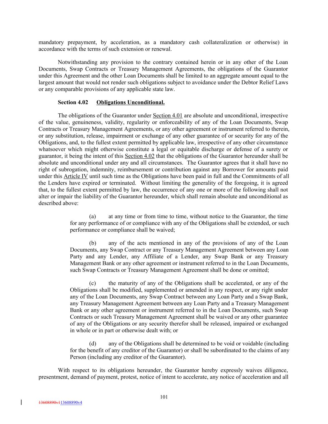 mandatory prepayment, by acceleration, as a mandatory cash collateralization or otherwise) in accordance with the terms of such extension or renewal. Notwithstanding any provision to the contrary contained herein or in any other of the Loan Documents, Swap Contracts or Treasury Management Agreements, the obligations of the Guarantor under this Agreement and the other Loan Documents shall be limited to an aggregate amount equal to the largest amount that would not render such obligations subject to avoidance under the Debtor Relief Laws or any comparable provisions of any applicable state law. Section 4.02 Obligations Unconditional. The obligations of the Guarantor under Section 4.01 are absolute and unconditional, irrespective of the value, genuineness, validity, regularity or enforceability of any of the Loan Documents, Swap Contracts or Treasury Management Agreements, or any other agreement or instrument referred to therein, or any substitution, release, impairment or exchange of any other guarantee of or security for any of the Obligations, and, to the fullest extent permitted by applicable law, irrespective of any other circumstance whatsoever which might otherwise constitute a legal or equitable discharge or defense of a surety or guarantor, it being the intent of this Section 4.02 that the obligations of the Guarantor hereunder shall be absolute and unconditional under any and all circumstances. The Guarantor agrees that it shall have no right of subrogation, indemnity, reimbursement or contribution against any Borrower for amounts paid under this Article IV until such time as the Obligations have been paid in full and the Commitments of all the Lenders have expired or terminated. Without limiting the generality of the foregoing, it is agreed that, to the fullest extent permitted by law, the occurrence of any one or more of the following shall not alter or impair the liability of the Guarantor hereunder, which shall remain absolute and unconditional as described above: (a) at any time or from time to time, without notice to the Guarantor, the time for any performance of or compliance with any of the Obligations shall be extended, or such performance or compliance shall be waived; (b) any of the acts mentioned in any of the provisions of any of the Loan Documents, any Swap Contract or any Treasury Management Agreement between any Loan Party and any Lender, any Affiliate of a Lender, any Swap Bank or any Treasury Management Bank or any other agreement or instrument referred to in the Loan Documents, such Swap Contracts or Treasury Management Agreement shall be done or omitted; (c) the maturity of any of the Obligations shall be accelerated, or any of the Obligations shall be modified, supplemented or amended in any respect, or any right under any of the Loan Documents, any Swap Contract between any Loan Party and a Swap Bank, any Treasury Management Agreement between any Loan Party and a Treasury Management Bank or any other agreement or instrument referred to in the Loan Documents, such Swap Contracts or such Treasury Management Agreement shall be waived or any other guarantee of any of the Obligations or any security therefor shall be released, impaired or exchanged in whole or in part or otherwise dealt with; or (d) any of the Obligations shall be determined to be void or voidable (including for the benefit of any creditor of the Guarantor) or shall be subordinated to the claims of any Person (including any creditor of the Guarantor). With respect to its obligations hereunder, the Guarantor hereby expressly waives diligence, presentment, demand of payment, protest, notice of intent to accelerate, any notice of acceleration and all 101 13608890v113608890v4