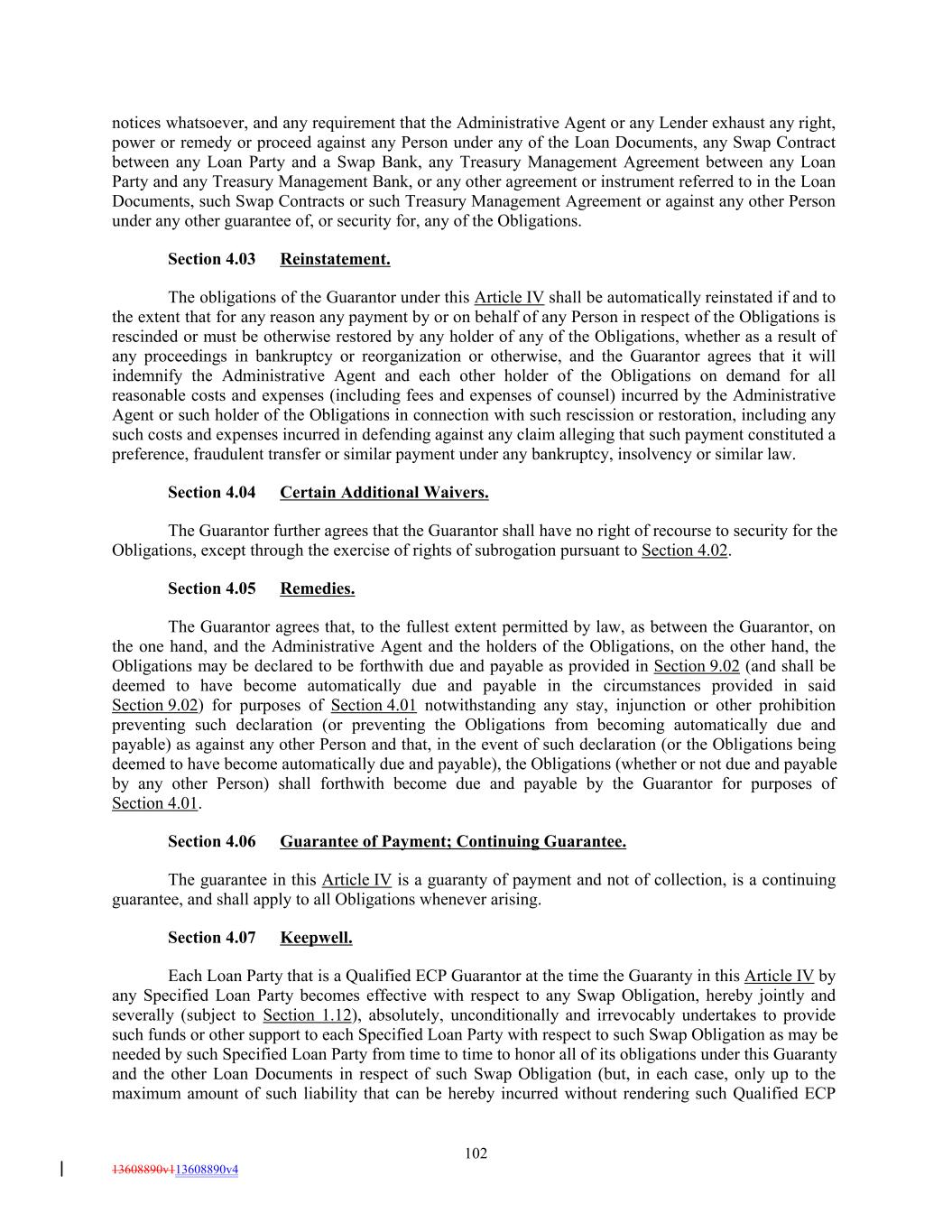 notices whatsoever, and any requirement that the Administrative Agent or any Lender exhaust any right, power or remedy or proceed against any Person under any of the Loan Documents, any Swap Contract between any Loan Party and a Swap Bank, any Treasury Management Agreement between any Loan Party and any Treasury Management Bank, or any other agreement or instrument referred to in the Loan Documents, such Swap Contracts or such Treasury Management Agreement or against any other Person under any other guarantee of, or security for, any of the Obligations. Section 4.03 Reinstatement. The obligations of the Guarantor under this Article IV shall be automatically reinstated if and to the extent that for any reason any payment by or on behalf of any Person in respect of the Obligations is rescinded or must be otherwise restored by any holder of any of the Obligations, whether as a result of any proceedings in bankruptcy or reorganization or otherwise, and the Guarantor agrees that it will indemnify the Administrative Agent and each other holder of the Obligations on demand for all reasonable costs and expenses (including fees and expenses of counsel) incurred by the Administrative Agent or such holder of the Obligations in connection with such rescission or restoration, including any such costs and expenses incurred in defending against any claim alleging that such payment constituted a preference, fraudulent transfer or similar payment under any bankruptcy, insolvency or similar law. Section 4.04 Certain Additional Waivers. The Guarantor further agrees that the Guarantor shall have no right of recourse to security for the Obligations, except through the exercise of rights of subrogation pursuant to Section 4.02. Section 4.05 Remedies. The Guarantor agrees that, to the fullest extent permitted by law, as between the Guarantor, on the one hand, and the Administrative Agent and the holders of the Obligations, on the other hand, the Obligations may be declared to be forthwith due and payable as provided in Section 9.02 (and shall be deemed to have become automatically due and payable in the circumstances provided in said Section 9.02) for purposes of Section 4.01 notwithstanding any stay, injunction or other prohibition preventing such declaration (or preventing the Obligations from becoming automatically due and payable) as against any other Person and that, in the event of such declaration (or the Obligations being deemed to have become automatically due and payable), the Obligations (whether or not due and payable by any other Person) shall forthwith become due and payable by the Guarantor for purposes of Section 4.01. Section 4.06 Guarantee of Payment; Continuing Guarantee. The guarantee in this Article IV is a guaranty of payment and not of collection, is a continuing guarantee, and shall apply to all Obligations whenever arising. Section 4.07 Keepwell. Each Loan Party that is a Qualified ECP Guarantor at the time the Guaranty in this Article IV by any Specified Loan Party becomes effective with respect to any Swap Obligation, hereby jointly and severally (subject to Section 1.12), absolutely, unconditionally and irrevocably undertakes to provide such funds or other support to each Specified Loan Party with respect to such Swap Obligation as may be needed by such Specified Loan Party from time to time to honor all of its obligations under this Guaranty and the other Loan Documents in respect of such Swap Obligation (but, in each case, only up to the maximum amount of such liability that can be hereby incurred without rendering such Qualified ECP 102 13608890v113608890v4
