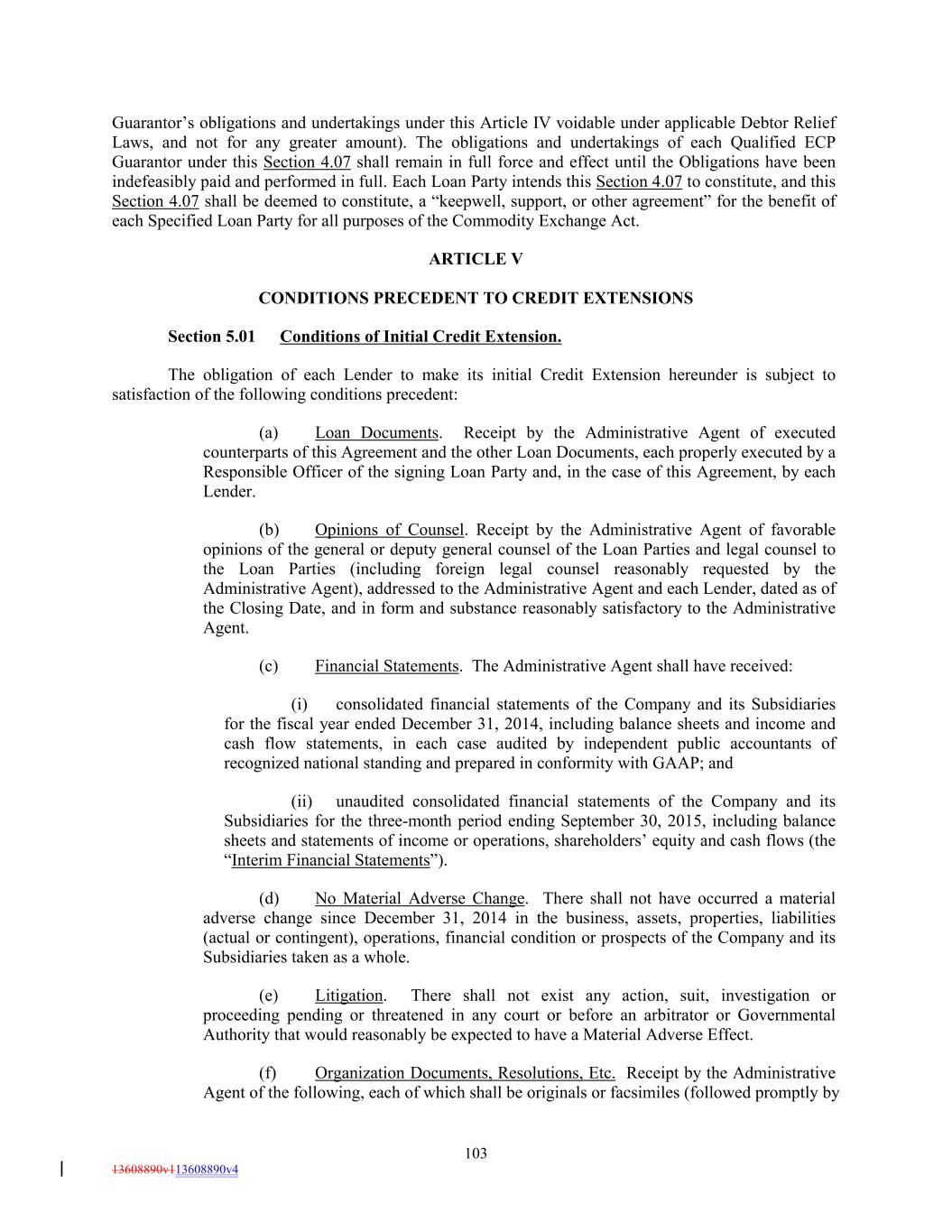 Guarantor’s obligations and undertakings under this Article IV voidable under applicable Debtor Relief Laws, and not for any greater amount). The obligations and undertakings of each Qualified ECP Guarantor under this Section 4.07 shall remain in full force and effect until the Obligations have been indefeasibly paid and performed in full. Each Loan Party intends this Section 4.07 to constitute, and this Section 4.07 shall be deemed to constitute, a “keepwell, support, or other agreement” for the benefit of each Specified Loan Party for all purposes of the Commodity Exchange Act. ARTICLE V CONDITIONS PRECEDENT TO CREDIT EXTENSIONS Section 5.01 Conditions of Initial Credit Extension. The obligation of each Lender to make its initial Credit Extension hereunder is subject to satisfaction of the following conditions precedent: (a) Loan Documents. Receipt by the Administrative Agent of executed counterparts of this Agreement and the other Loan Documents, each properly executed by a Responsible Officer of the signing Loan Party and, in the case of this Agreement, by each Lender. (b) Opinions of Counsel. Receipt by the Administrative Agent of favorable opinions of the general or deputy general counsel of the Loan Parties and legal counsel to the Loan Parties (including foreign legal counsel reasonably requested by the Administrative Agent), addressed to the Administrative Agent and each Lender, dated as of the Closing Date, and in form and substance reasonably satisfactory to the Administrative Agent. (c) Financial Statements. The Administrative Agent shall have received: (i) consolidated financial statements of the Company and its Subsidiaries for the fiscal year ended December 31, 2014, including balance sheets and income and cash flow statements, in each case audited by independent public accountants of recognized national standing and prepared in conformity with GAAP; and (ii) unaudited consolidated financial statements of the Company and its Subsidiaries for the three-month period ending September 30, 2015, including balance sheets and statements of income or operations, shareholders’ equity and cash flows (the “Interim Financial Statements”). (d) No Material Adverse Change. There shall not have occurred a material adverse change since December 31, 2014 in the business, assets, properties, liabilities (actual or contingent), operations, financial condition or prospects of the Company and its Subsidiaries taken as a whole. (e) Litigation. There shall not exist any action, suit, investigation or proceeding pending or threatened in any court or before an arbitrator or Governmental Authority that would reasonably be expected to have a Material Adverse Effect. (f) Organization Documents, Resolutions, Etc. Receipt by the Administrative Agent of the following, each of which shall be originals or facsimiles (followed promptly by 103 13608890v113608890v4