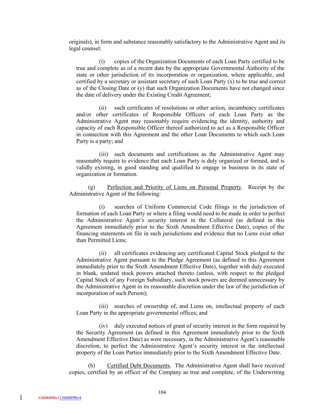 originals), in form and substance reasonably satisfactory to the Administrative Agent and its legal counsel: (i) copies of the Organization Documents of each Loan Party certified to be true and complete as of a recent date by the appropriate Governmental Authority of the state or other jurisdiction of its incorporation or organization, where applicable, and certified by a secretary or assistant secretary of such Loan Party (x) to be true and correct as of the Closing Date or (y) that such Organization Documents have not changed since the date of delivery under the Existing Credit Agreement; (ii) such certificates of resolutions or other action, incumbency certificates and/or other certificates of Responsible Officers of each Loan Party as the Administrative Agent may reasonably require evidencing the identity, authority and capacity of each Responsible Officer thereof authorized to act as a Responsible Officer in connection with this Agreement and the other Loan Documents to which such Loan Party is a party; and (iii) such documents and certifications as the Administrative Agent may reasonably require to evidence that each Loan Party is duly organized or formed, and is validly existing, in good standing and qualified to engage in business in its state of organization or formation. (g) Perfection and Priority of Liens on Personal Property. Receipt by the Administrative Agent of the following: (i) searches of Uniform Commercial Code filings in the jurisdiction of formation of each Loan Party or where a filing would need to be made in order to perfect the Administrative Agent’s security interest in the Collateral (as defined in this Agreement immediately prior to the Sixth Amendment Effective Date), copies of the financing statements on file in such jurisdictions and evidence that no Liens exist other than Permitted Liens; (ii) all certificates evidencing any certificated Capital Stock pledged to the Administrative Agent pursuant to the Pledge Agreement (as defined in this Agreement immediately prior to the Sixth Amendment Effective Date), together with duly executed in blank, undated stock powers attached thereto (unless, with respect to the pledged Capital Stock of any Foreign Subsidiary, such stock powers are deemed unnecessary by the Administrative Agent in its reasonable discretion under the law of the jurisdiction of incorporation of such Person); (iii) searches of ownership of, and Liens on, intellectual property of each Loan Party in the appropriate governmental offices; and (iv) duly executed notices of grant of security interest in the form required by the Security Agreement (as defined in this Agreement immediately prior to the Sixth Amendment Effective Date) as were necessary, in the Administrative Agent’s reasonable discretion, to perfect the Administrative Agent’s security interest in the intellectual property of the Loan Parties immediately prior to the Sixth Amendment Effective Date. (h) Certified Debt Documents. The Administrative Agent shall have received copies, certified by an officer of the Company as true and complete, of the Underwriting 104 13608890v113608890v4