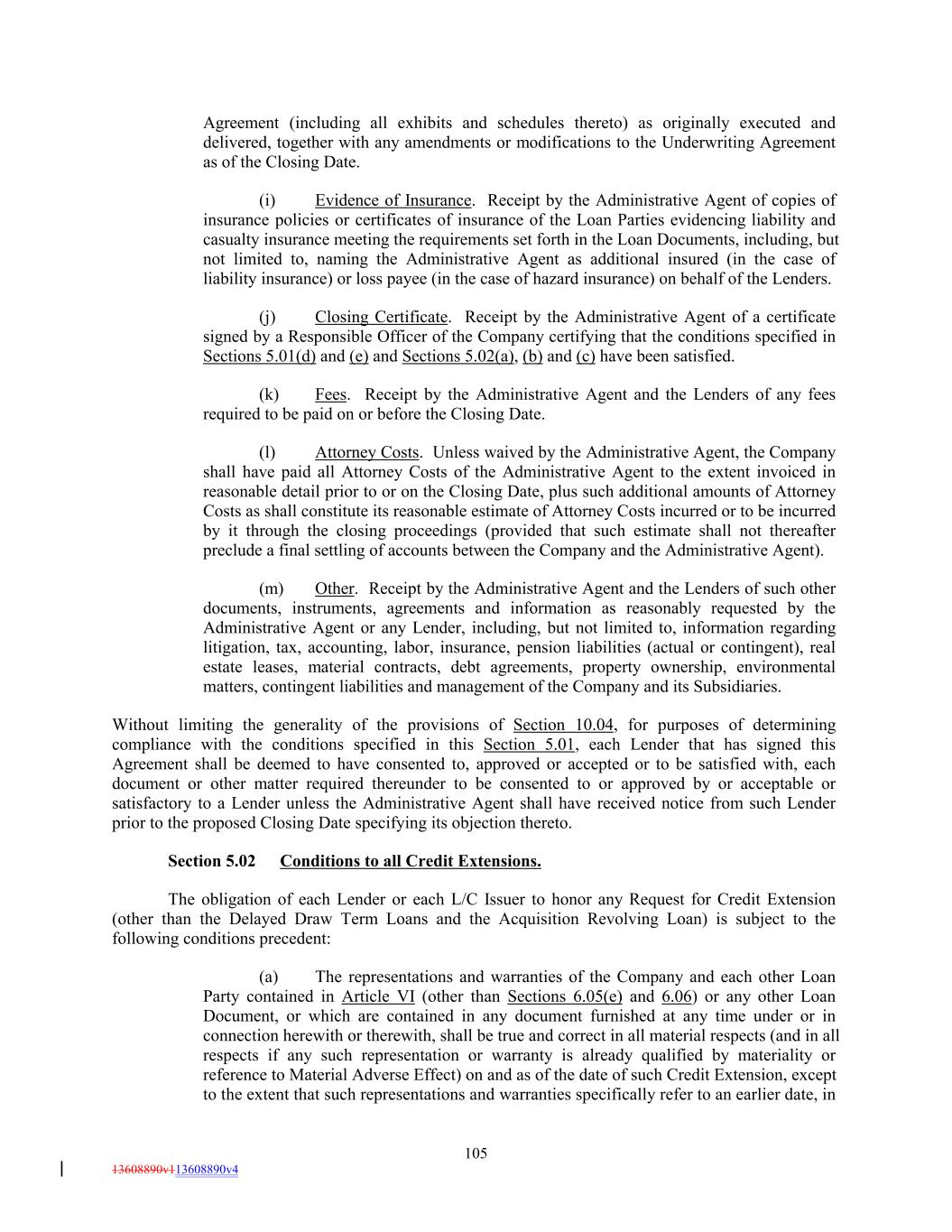 Agreement (including all exhibits and schedules thereto) as originally executed and delivered, together with any amendments or modifications to the Underwriting Agreement as of the Closing Date. (i) Evidence of Insurance. Receipt by the Administrative Agent of copies of insurance policies or certificates of insurance of the Loan Parties evidencing liability and casualty insurance meeting the requirements set forth in the Loan Documents, including, but not limited to, naming the Administrative Agent as additional insured (in the case of liability insurance) or loss payee (in the case of hazard insurance) on behalf of the Lenders. (j) Closing Certificate. Receipt by the Administrative Agent of a certificate signed by a Responsible Officer of the Company certifying that the conditions specified in Sections 5.01(d) and (e) and Sections 5.02(a), (b) and (c) have been satisfied. (k) Fees. Receipt by the Administrative Agent and the Lenders of any fees required to be paid on or before the Closing Date. (l) Attorney Costs. Unless waived by the Administrative Agent, the Company shall have paid all Attorney Costs of the Administrative Agent to the extent invoiced in reasonable detail prior to or on the Closing Date, plus such additional amounts of Attorney Costs as shall constitute its reasonable estimate of Attorney Costs incurred or to be incurred by it through the closing proceedings (provided that such estimate shall not thereafter preclude a final settling of accounts between the Company and the Administrative Agent). (m) Other. Receipt by the Administrative Agent and the Lenders of such other documents, instruments, agreements and information as reasonably requested by the Administrative Agent or any Lender, including, but not limited to, information regarding litigation, tax, accounting, labor, insurance, pension liabilities (actual or contingent), real estate leases, material contracts, debt agreements, property ownership, environmental matters, contingent liabilities and management of the Company and its Subsidiaries. Without limiting the generality of the provisions of Section 10.04, for purposes of determining compliance with the conditions specified in this Section 5.01, each Lender that has signed this Agreement shall be deemed to have consented to, approved or accepted or to be satisfied with, each document or other matter required thereunder to be consented to or approved by or acceptable or satisfactory to a Lender unless the Administrative Agent shall have received notice from such Lender prior to the proposed Closing Date specifying its objection thereto. Section 5.02 Conditions to all Credit Extensions. The obligation of each Lender or each L/C Issuer to honor any Request for Credit Extension (other than the Delayed Draw Term Loans and the Acquisition Revolving Loan) is subject to the following conditions precedent: (a) The representations and warranties of the Company and each other Loan Party contained in Article VI (other than Sections 6.05(e) and 6.06) or any other Loan Document, or which are contained in any document furnished at any time under or in connection herewith or therewith, shall be true and correct in all material respects (and in all respects if any such representation or warranty is already qualified by materiality or reference to Material Adverse Effect) on and as of the date of such Credit Extension, except to the extent that such representations and warranties specifically refer to an earlier date, in 105 13608890v113608890v4