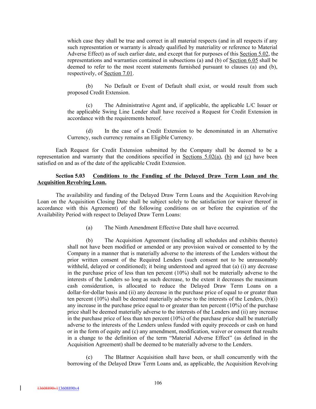 which case they shall be true and correct in all material respects (and in all respects if any such representation or warranty is already qualified by materiality or reference to Material Adverse Effect) as of such earlier date, and except that for purposes of this Section 5.02, the representations and warranties contained in subsections (a) and (b) of Section 6.05 shall be deemed to refer to the most recent statements furnished pursuant to clauses (a) and (b), respectively, of Section 7.01. (b) No Default or Event of Default shall exist, or would result from such proposed Credit Extension. (c) The Administrative Agent and, if applicable, the applicable L/C Issuer or the applicable Swing Line Lender shall have received a Request for Credit Extension in accordance with the requirements hereof. (d) In the case of a Credit Extension to be denominated in an Alternative Currency, such currency remains an Eligible Currency. Each Request for Credit Extension submitted by the Company shall be deemed to be a representation and warranty that the conditions specified in Sections 5.02(a), (b) and (c) have been satisfied on and as of the date of the applicable Credit Extension. Section 5.03 Conditions to the Funding of the Delayed Draw Term Loan and the Acquisition Revolving Loan. The availability and funding of the Delayed Draw Term Loans and the Acquisition Revolving Loan on the Acquisition Closing Date shall be subject solely to the satisfaction (or waiver thereof in accordance with this Agreement) of the following conditions on or before the expiration of the Availability Period with respect to Delayed Draw Term Loans: (a) The Ninth Amendment Effective Date shall have occurred. (b) The Acquisition Agreement (including all schedules and exhibits thereto) shall not have been modified or amended or any provision waived or consented to by the Company in a manner that is materially adverse to the interests of the Lenders without the prior written consent of the Required Lenders (such consent not to be unreasonably withheld, delayed or conditioned); it being understood and agreed that (a) (i) any decrease in the purchase price of less than ten percent (10%) shall not be materially adverse to the interests of the Lenders so long as such decrease, to the extent it decreases the maximum cash consideration, is allocated to reduce the Delayed Draw Term Loans on a dollar-for-dollar basis and (ii) any decrease in the purchase price of equal to or greater than ten percent (10%) shall be deemed materially adverse to the interests of the Lenders, (b)(i) any increase in the purchase price equal to or greater than ten percent (10%) of the purchase price shall be deemed materially adverse to the interests of the Lenders and (ii) any increase in the purchase price of less than ten percent (10%) of the purchase price shall be materially adverse to the interests of the Lenders unless funded with equity proceeds or cash on hand or in the form of equity and (c) any amendment, modification, waiver or consent that results in a change to the definition of the term “Material Adverse Effect” (as defined in the Acquisition Agreement) shall be deemed to be materially adverse to the Lenders. (c) The Blattner Acquisition shall have been, or shall concurrently with the borrowing of the Delayed Draw Term Loans and, as applicable, the Acquisition Revolving 106 13608890v113608890v4