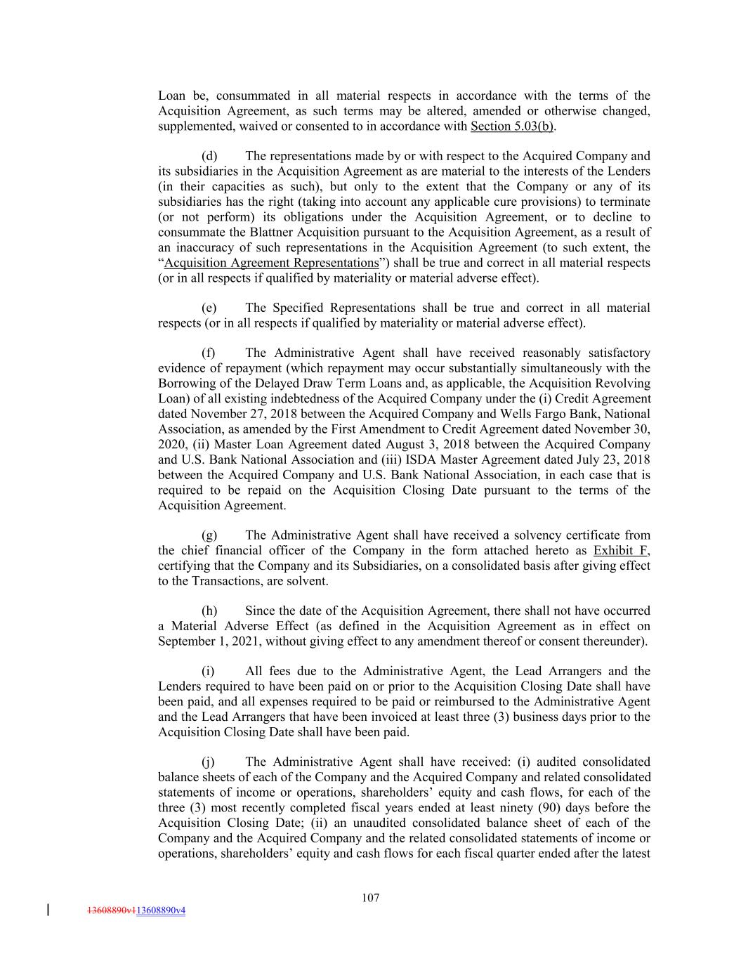 Loan be, consummated in all material respects in accordance with the terms of the Acquisition Agreement, as such terms may be altered, amended or otherwise changed, supplemented, waived or consented to in accordance with Section 5.03(b). (d) The representations made by or with respect to the Acquired Company and its subsidiaries in the Acquisition Agreement as are material to the interests of the Lenders (in their capacities as such), but only to the extent that the Company or any of its subsidiaries has the right (taking into account any applicable cure provisions) to terminate (or not perform) its obligations under the Acquisition Agreement, or to decline to consummate the Blattner Acquisition pursuant to the Acquisition Agreement, as a result of an inaccuracy of such representations in the Acquisition Agreement (to such extent, the “Acquisition Agreement Representations”) shall be true and correct in all material respects (or in all respects if qualified by materiality or material adverse effect). (e) The Specified Representations shall be true and correct in all material respects (or in all respects if qualified by materiality or material adverse effect). (f) The Administrative Agent shall have received reasonably satisfactory evidence of repayment (which repayment may occur substantially simultaneously with the Borrowing of the Delayed Draw Term Loans and, as applicable, the Acquisition Revolving Loan) of all existing indebtedness of the Acquired Company under the (i) Credit Agreement dated November 27, 2018 between the Acquired Company and Wells Fargo Bank, National Association, as amended by the First Amendment to Credit Agreement dated November 30, 2020, (ii) Master Loan Agreement dated August 3, 2018 between the Acquired Company and U.S. Bank National Association and (iii) ISDA Master Agreement dated July 23, 2018 between the Acquired Company and U.S. Bank National Association, in each case that is required to be repaid on the Acquisition Closing Date pursuant to the terms of the Acquisition Agreement. (g) The Administrative Agent shall have received a solvency certificate from the chief financial officer of the Company in the form attached hereto as Exhibit F, certifying that the Company and its Subsidiaries, on a consolidated basis after giving effect to the Transactions, are solvent. (h) Since the date of the Acquisition Agreement, there shall not have occurred a Material Adverse Effect (as defined in the Acquisition Agreement as in effect on September 1, 2021, without giving effect to any amendment thereof or consent thereunder). (i) All fees due to the Administrative Agent, the Lead Arrangers and the Lenders required to have been paid on or prior to the Acquisition Closing Date shall have been paid, and all expenses required to be paid or reimbursed to the Administrative Agent and the Lead Arrangers that have been invoiced at least three (3) business days prior to the Acquisition Closing Date shall have been paid. (j) The Administrative Agent shall have received: (i) audited consolidated balance sheets of each of the Company and the Acquired Company and related consolidated statements of income or operations, shareholders’ equity and cash flows, for each of the three (3) most recently completed fiscal years ended at least ninety (90) days before the Acquisition Closing Date; (ii) an unaudited consolidated balance sheet of each of the Company and the Acquired Company and the related consolidated statements of income or operations, shareholders’ equity and cash flows for each fiscal quarter ended after the latest 107 13608890v113608890v4