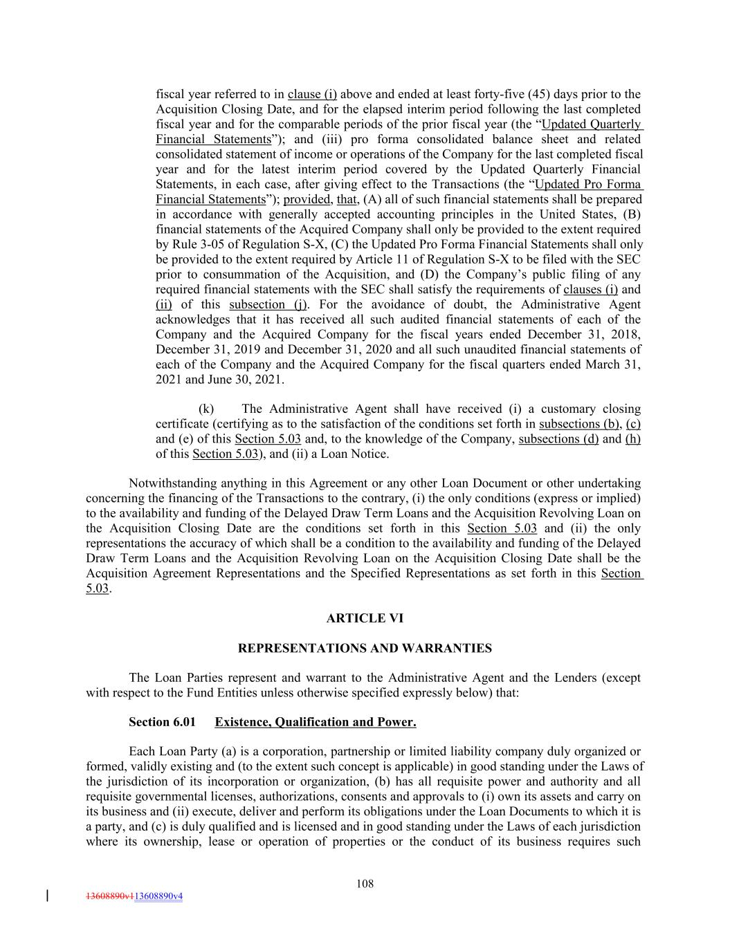 fiscal year referred to in clause (i) above and ended at least forty-five (45) days prior to the Acquisition Closing Date, and for the elapsed interim period following the last completed fiscal year and for the comparable periods of the prior fiscal year (the “Updated Quarterly Financial Statements”); and (iii) pro forma consolidated balance sheet and related consolidated statement of income or operations of the Company for the last completed fiscal year and for the latest interim period covered by the Updated Quarterly Financial Statements, in each case, after giving effect to the Transactions (the “Updated Pro Forma Financial Statements”); provided, that, (A) all of such financial statements shall be prepared in accordance with generally accepted accounting principles in the United States, (B) financial statements of the Acquired Company shall only be provided to the extent required by Rule 3-05 of Regulation S-X, (C) the Updated Pro Forma Financial Statements shall only be provided to the extent required by Article 11 of Regulation S-X to be filed with the SEC prior to consummation of the Acquisition, and (D) the Company’s public filing of any required financial statements with the SEC shall satisfy the requirements of clauses (i) and (ii) of this subsection (j). For the avoidance of doubt, the Administrative Agent acknowledges that it has received all such audited financial statements of each of the Company and the Acquired Company for the fiscal years ended December 31, 2018, December 31, 2019 and December 31, 2020 and all such unaudited financial statements of each of the Company and the Acquired Company for the fiscal quarters ended March 31, 2021 and June 30, 2021. (k) The Administrative Agent shall have received (i) a customary closing certificate (certifying as to the satisfaction of the conditions set forth in subsections (b), (c) and (e) of this Section 5.03 and, to the knowledge of the Company, subsections (d) and (h) of this Section 5.03), and (ii) a Loan Notice. Notwithstanding anything in this Agreement or any other Loan Document or other undertaking concerning the financing of the Transactions to the contrary, (i) the only conditions (express or implied) to the availability and funding of the Delayed Draw Term Loans and the Acquisition Revolving Loan on the Acquisition Closing Date are the conditions set forth in this Section 5.03 and (ii) the only representations the accuracy of which shall be a condition to the availability and funding of the Delayed Draw Term Loans and the Acquisition Revolving Loan on the Acquisition Closing Date shall be the Acquisition Agreement Representations and the Specified Representations as set forth in this Section 5.03. ARTICLE VI REPRESENTATIONS AND WARRANTIES The Loan Parties represent and warrant to the Administrative Agent and the Lenders (except with respect to the Fund Entities unless otherwise specified expressly below) that: Section 6.01 Existence, Qualification and Power. Each Loan Party (a) is a corporation, partnership or limited liability company duly organized or formed, validly existing and (to the extent such concept is applicable) in good standing under the Laws of the jurisdiction of its incorporation or organization, (b) has all requisite power and authority and all requisite governmental licenses, authorizations, consents and approvals to (i) own its assets and carry on its business and (ii) execute, deliver and perform its obligations under the Loan Documents to which it is a party, and (c) is duly qualified and is licensed and in good standing under the Laws of each jurisdiction where its ownership, lease or operation of properties or the conduct of its business requires such 108 13608890v113608890v4