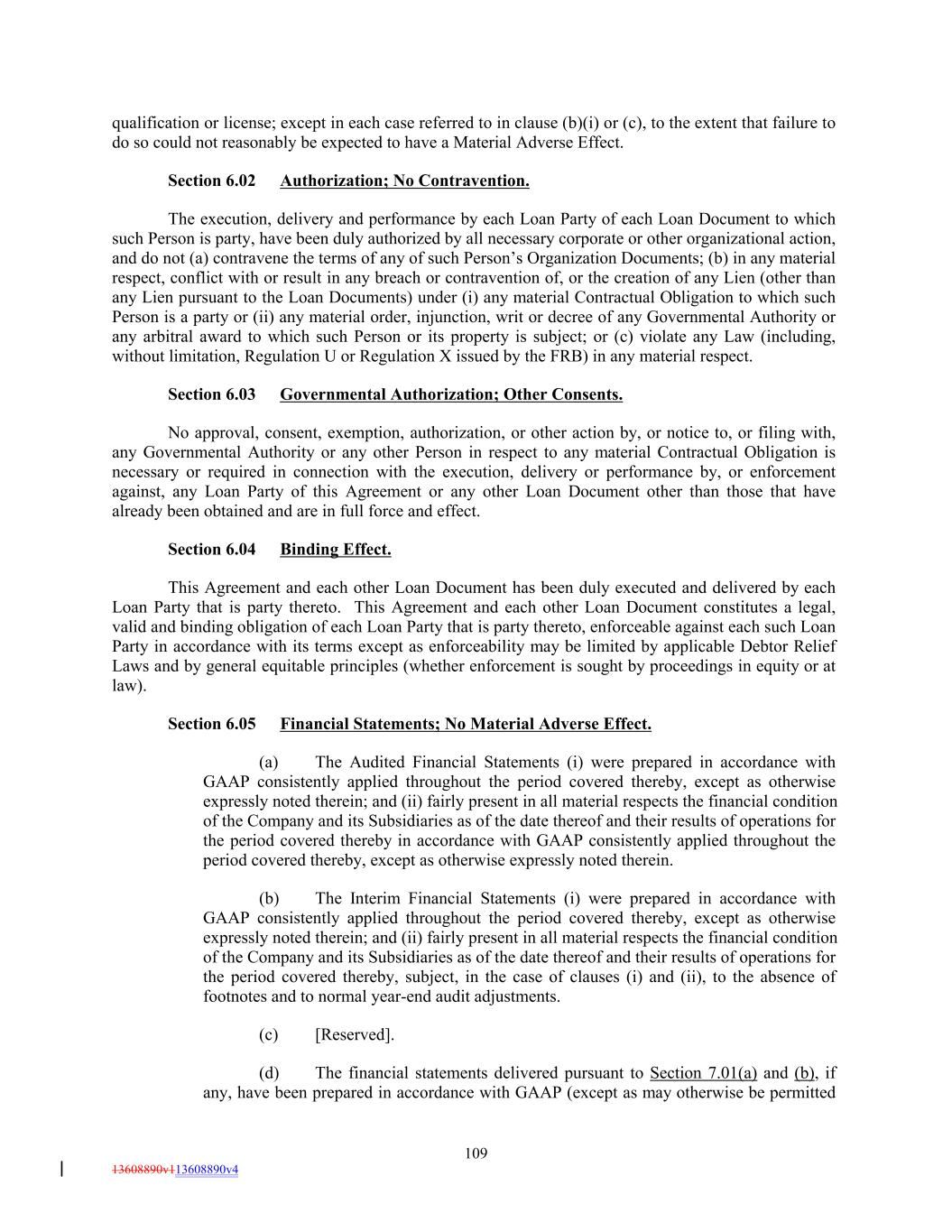 qualification or license; except in each case referred to in clause (b)(i) or (c), to the extent that failure to do so could not reasonably be expected to have a Material Adverse Effect. Section 6.02 Authorization; No Contravention. The execution, delivery and performance by each Loan Party of each Loan Document to which such Person is party, have been duly authorized by all necessary corporate or other organizational action, and do not (a) contravene the terms of any of such Person’s Organization Documents; (b) in any material respect, conflict with or result in any breach or contravention of, or the creation of any Lien (other than any Lien pursuant to the Loan Documents) under (i) any material Contractual Obligation to which such Person is a party or (ii) any material order, injunction, writ or decree of any Governmental Authority or any arbitral award to which such Person or its property is subject; or (c) violate any Law (including, without limitation, Regulation U or Regulation X issued by the FRB) in any material respect. Section 6.03 Governmental Authorization; Other Consents. No approval, consent, exemption, authorization, or other action by, or notice to, or filing with, any Governmental Authority or any other Person in respect to any material Contractual Obligation is necessary or required in connection with the execution, delivery or performance by, or enforcement against, any Loan Party of this Agreement or any other Loan Document other than those that have already been obtained and are in full force and effect. Section 6.04 Binding Effect. This Agreement and each other Loan Document has been duly executed and delivered by each Loan Party that is party thereto. This Agreement and each other Loan Document constitutes a legal, valid and binding obligation of each Loan Party that is party thereto, enforceable against each such Loan Party in accordance with its terms except as enforceability may be limited by applicable Debtor Relief Laws and by general equitable principles (whether enforcement is sought by proceedings in equity or at law). Section 6.05 Financial Statements; No Material Adverse Effect. (a) The Audited Financial Statements (i) were prepared in accordance with GAAP consistently applied throughout the period covered thereby, except as otherwise expressly noted therein; and (ii) fairly present in all material respects the financial condition of the Company and its Subsidiaries as of the date thereof and their results of operations for the period covered thereby in accordance with GAAP consistently applied throughout the period covered thereby, except as otherwise expressly noted therein. (b) The Interim Financial Statements (i) were prepared in accordance with GAAP consistently applied throughout the period covered thereby, except as otherwise expressly noted therein; and (ii) fairly present in all material respects the financial condition of the Company and its Subsidiaries as of the date thereof and their results of operations for the period covered thereby, subject, in the case of clauses (i) and (ii), to the absence of footnotes and to normal year-end audit adjustments. (c) [Reserved]. (d) The financial statements delivered pursuant to Section 7.01(a) and (b), if any, have been prepared in accordance with GAAP (except as may otherwise be permitted 109 13608890v113608890v4