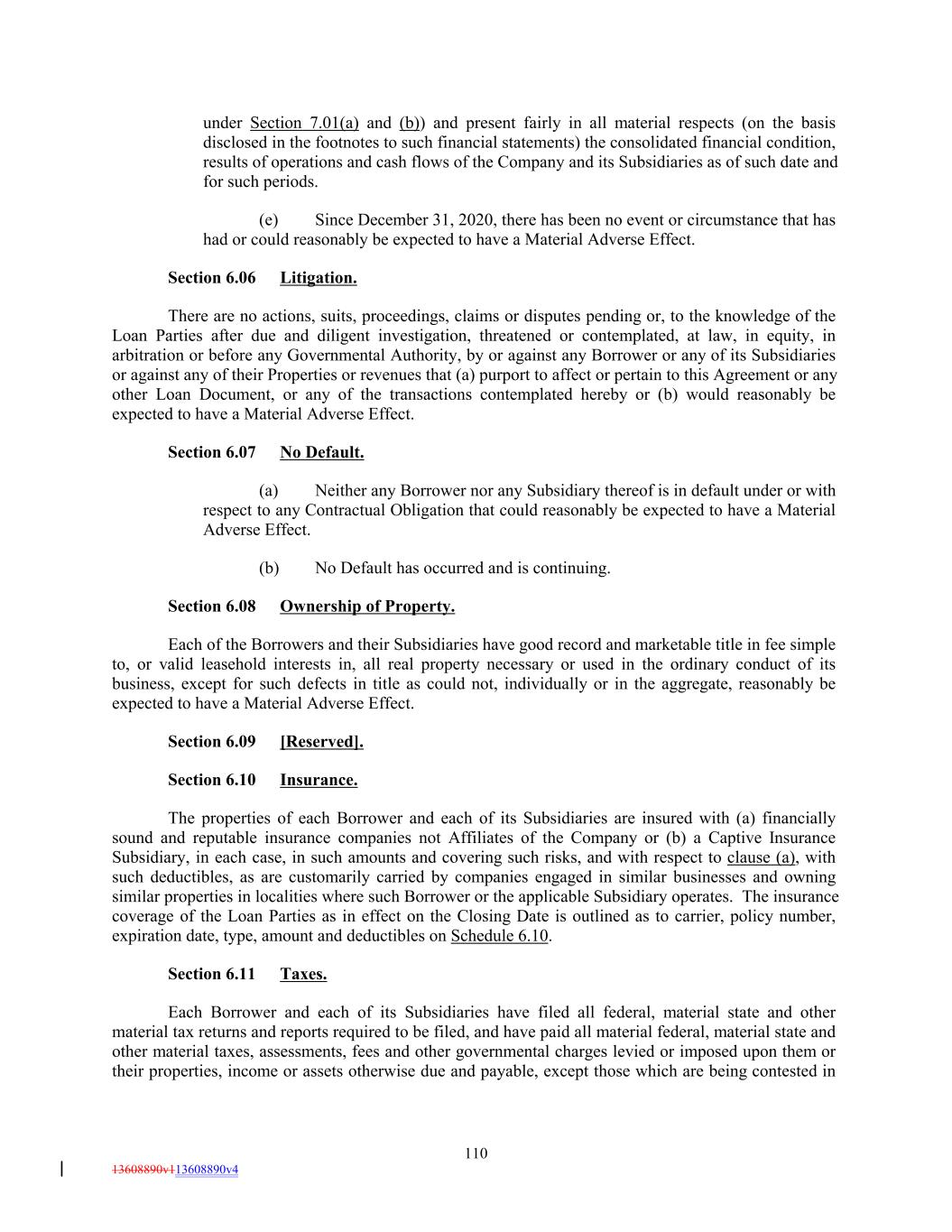 under Section 7.01(a) and (b)) and present fairly in all material respects (on the basis disclosed in the footnotes to such financial statements) the consolidated financial condition, results of operations and cash flows of the Company and its Subsidiaries as of such date and for such periods. (e) Since December 31, 2020, there has been no event or circumstance that has had or could reasonably be expected to have a Material Adverse Effect. Section 6.06 Litigation. There are no actions, suits, proceedings, claims or disputes pending or, to the knowledge of the Loan Parties after due and diligent investigation, threatened or contemplated, at law, in equity, in arbitration or before any Governmental Authority, by or against any Borrower or any of its Subsidiaries or against any of their Properties or revenues that (a) purport to affect or pertain to this Agreement or any other Loan Document, or any of the transactions contemplated hereby or (b) would reasonably be expected to have a Material Adverse Effect. Section 6.07 No Default. (a) Neither any Borrower nor any Subsidiary thereof is in default under or with respect to any Contractual Obligation that could reasonably be expected to have a Material Adverse Effect. (b) No Default has occurred and is continuing. Section 6.08 Ownership of Property. Each of the Borrowers and their Subsidiaries have good record and marketable title in fee simple to, or valid leasehold interests in, all real property necessary or used in the ordinary conduct of its business, except for such defects in title as could not, individually or in the aggregate, reasonably be expected to have a Material Adverse Effect. Section 6.09 [Reserved]. Section 6.10 Insurance. The properties of each Borrower and each of its Subsidiaries are insured with (a) financially sound and reputable insurance companies not Affiliates of the Company or (b) a Captive Insurance Subsidiary, in each case, in such amounts and covering such risks, and with respect to clause (a), with such deductibles, as are customarily carried by companies engaged in similar businesses and owning similar properties in localities where such Borrower or the applicable Subsidiary operates. The insurance coverage of the Loan Parties as in effect on the Closing Date is outlined as to carrier, policy number, expiration date, type, amount and deductibles on Schedule 6.10. Section 6.11 Taxes. Each Borrower and each of its Subsidiaries have filed all federal, material state and other material tax returns and reports required to be filed, and have paid all material federal, material state and other material taxes, assessments, fees and other governmental charges levied or imposed upon them or their properties, income or assets otherwise due and payable, except those which are being contested in 110 13608890v113608890v4
