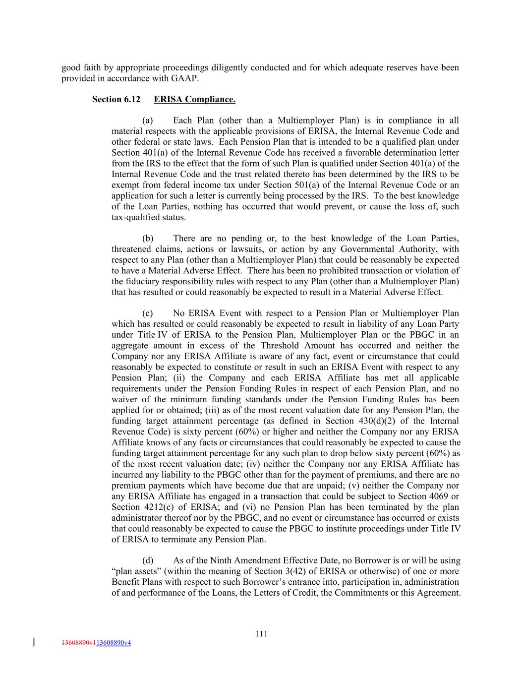 good faith by appropriate proceedings diligently conducted and for which adequate reserves have been provided in accordance with GAAP. Section 6.12 ERISA Compliance. (a) Each Plan (other than a Multiemployer Plan) is in compliance in all material respects with the applicable provisions of ERISA, the Internal Revenue Code and other federal or state laws. Each Pension Plan that is intended to be a qualified plan under Section 401(a) of the Internal Revenue Code has received a favorable determination letter from the IRS to the effect that the form of such Plan is qualified under Section 401(a) of the Internal Revenue Code and the trust related thereto has been determined by the IRS to be exempt from federal income tax under Section 501(a) of the Internal Revenue Code or an application for such a letter is currently being processed by the IRS. To the best knowledge of the Loan Parties, nothing has occurred that would prevent, or cause the loss of, such tax-qualified status. (b) There are no pending or, to the best knowledge of the Loan Parties, threatened claims, actions or lawsuits, or action by any Governmental Authority, with respect to any Plan (other than a Multiemployer Plan) that could be reasonably be expected to have a Material Adverse Effect. There has been no prohibited transaction or violation of the fiduciary responsibility rules with respect to any Plan (other than a Multiemployer Plan) that has resulted or could reasonably be expected to result in a Material Adverse Effect. (c) No ERISA Event with respect to a Pension Plan or Multiemployer Plan which has resulted or could reasonably be expected to result in liability of any Loan Party under Title IV of ERISA to the Pension Plan, Multiemployer Plan or the PBGC in an aggregate amount in excess of the Threshold Amount has occurred and neither the Company nor any ERISA Affiliate is aware of any fact, event or circumstance that could reasonably be expected to constitute or result in such an ERISA Event with respect to any Pension Plan; (ii) the Company and each ERISA Affiliate has met all applicable requirements under the Pension Funding Rules in respect of each Pension Plan, and no waiver of the minimum funding standards under the Pension Funding Rules has been applied for or obtained; (iii) as of the most recent valuation date for any Pension Plan, the funding target attainment percentage (as defined in Section 430(d)(2) of the Internal Revenue Code) is sixty percent (60%) or higher and neither the Company nor any ERISA Affiliate knows of any facts or circumstances that could reasonably be expected to cause the funding target attainment percentage for any such plan to drop below sixty percent (60%) as of the most recent valuation date; (iv) neither the Company nor any ERISA Affiliate has incurred any liability to the PBGC other than for the payment of premiums, and there are no premium payments which have become due that are unpaid; (v) neither the Company nor any ERISA Affiliate has engaged in a transaction that could be subject to Section 4069 or Section 4212(c) of ERISA; and (vi) no Pension Plan has been terminated by the plan administrator thereof nor by the PBGC, and no event or circumstance has occurred or exists that could reasonably be expected to cause the PBGC to institute proceedings under Title IV of ERISA to terminate any Pension Plan. (d) As of the Ninth Amendment Effective Date, no Borrower is or will be using “plan assets” (within the meaning of Section 3(42) of ERISA or otherwise) of one or more Benefit Plans with respect to such Borrower’s entrance into, participation in, administration of and performance of the Loans, the Letters of Credit, the Commitments or this Agreement. 111 13608890v113608890v4