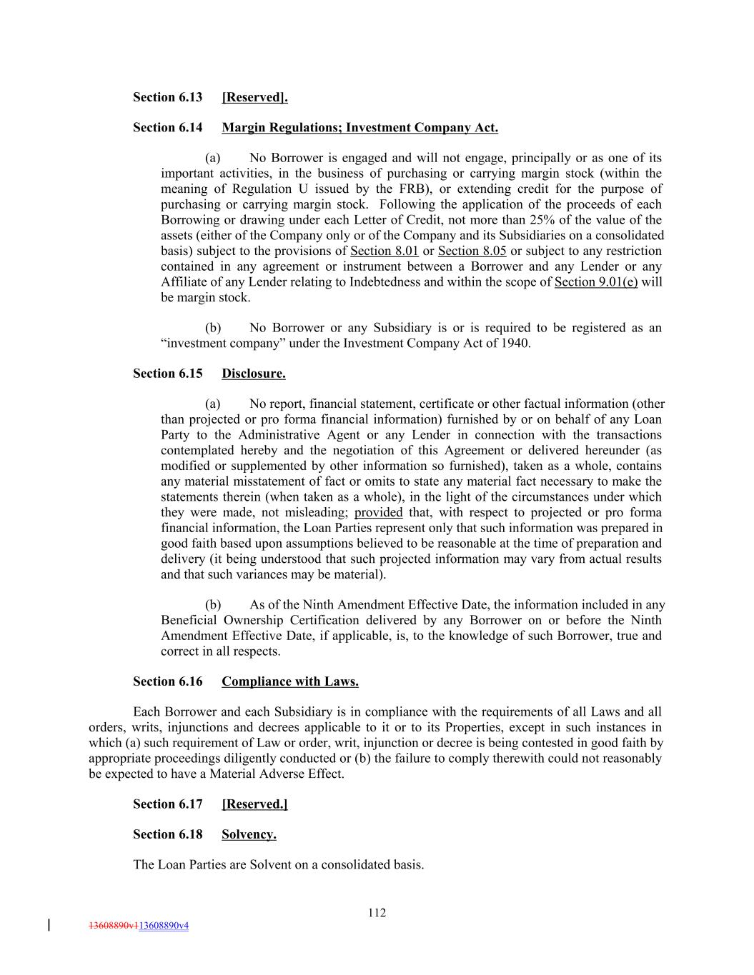Section 6.13 [Reserved]. Section 6.14 Margin Regulations; Investment Company Act. (a) No Borrower is engaged and will not engage, principally or as one of its important activities, in the business of purchasing or carrying margin stock (within the meaning of Regulation U issued by the FRB), or extending credit for the purpose of purchasing or carrying margin stock. Following the application of the proceeds of each Borrowing or drawing under each Letter of Credit, not more than 25% of the value of the assets (either of the Company only or of the Company and its Subsidiaries on a consolidated basis) subject to the provisions of Section 8.01 or Section 8.05 or subject to any restriction contained in any agreement or instrument between a Borrower and any Lender or any Affiliate of any Lender relating to Indebtedness and within the scope of Section 9.01(e) will be margin stock. (b) No Borrower or any Subsidiary is or is required to be registered as an “investment company” under the Investment Company Act of 1940. Section 6.15 Disclosure. (a) No report, financial statement, certificate or other factual information (other than projected or pro forma financial information) furnished by or on behalf of any Loan Party to the Administrative Agent or any Lender in connection with the transactions contemplated hereby and the negotiation of this Agreement or delivered hereunder (as modified or supplemented by other information so furnished), taken as a whole, contains any material misstatement of fact or omits to state any material fact necessary to make the statements therein (when taken as a whole), in the light of the circumstances under which they were made, not misleading; provided that, with respect to projected or pro forma financial information, the Loan Parties represent only that such information was prepared in good faith based upon assumptions believed to be reasonable at the time of preparation and delivery (it being understood that such projected information may vary from actual results and that such variances may be material). (b) As of the Ninth Amendment Effective Date, the information included in any Beneficial Ownership Certification delivered by any Borrower on or before the Ninth Amendment Effective Date, if applicable, is, to the knowledge of such Borrower, true and correct in all respects. Section 6.16 Compliance with Laws. Each Borrower and each Subsidiary is in compliance with the requirements of all Laws and all orders, writs, injunctions and decrees applicable to it or to its Properties, except in such instances in which (a) such requirement of Law or order, writ, injunction or decree is being contested in good faith by appropriate proceedings diligently conducted or (b) the failure to comply therewith could not reasonably be expected to have a Material Adverse Effect. Section 6.17 [Reserved.] Section 6.18 Solvency. The Loan Parties are Solvent on a consolidated basis. 112 13608890v113608890v4