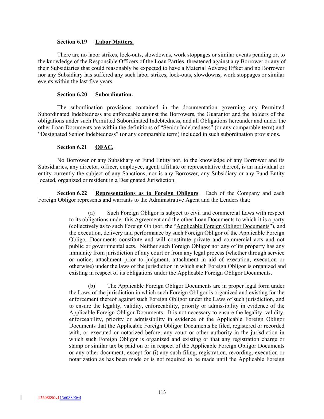 Section 6.19 Labor Matters. There are no labor strikes, lock-outs, slowdowns, work stoppages or similar events pending or, to the knowledge of the Responsible Officers of the Loan Parties, threatened against any Borrower or any of their Subsidiaries that could reasonably be expected to have a Material Adverse Effect and no Borrower nor any Subsidiary has suffered any such labor strikes, lock-outs, slowdowns, work stoppages or similar events within the last five years. Section 6.20 Subordination. The subordination provisions contained in the documentation governing any Permitted Subordinated Indebtedness are enforceable against the Borrowers, the Guarantor and the holders of the obligations under such Permitted Subordinated Indebtedness, and all Obligations hereunder and under the other Loan Documents are within the definitions of “Senior Indebtedness” (or any comparable term) and “Designated Senior Indebtedness” (or any comparable term) included in such subordination provisions. Section 6.21 OFAC. No Borrower or any Subsidiary or Fund Entity nor, to the knowledge of any Borrower and its Subsidiaries, any director, officer, employee, agent, affiliate or representative thereof, is an individual or entity currently the subject of any Sanctions, nor is any Borrower, any Subsidiary or any Fund Entity located, organized or resident in a Designated Jurisdiction. Section 6.22 Representations as to Foreign Obligors. Each of the Company and each Foreign Obligor represents and warrants to the Administrative Agent and the Lenders that: (a) Such Foreign Obligor is subject to civil and commercial Laws with respect to its obligations under this Agreement and the other Loan Documents to which it is a party (collectively as to such Foreign Obligor, the “Applicable Foreign Obligor Documents”), and the execution, delivery and performance by such Foreign Obligor of the Applicable Foreign Obligor Documents constitute and will constitute private and commercial acts and not public or governmental acts. Neither such Foreign Obligor nor any of its property has any immunity from jurisdiction of any court or from any legal process (whether through service or notice, attachment prior to judgment, attachment in aid of execution, execution or otherwise) under the laws of the jurisdiction in which such Foreign Obligor is organized and existing in respect of its obligations under the Applicable Foreign Obligor Documents. (b) The Applicable Foreign Obligor Documents are in proper legal form under the Laws of the jurisdiction in which such Foreign Obligor is organized and existing for the enforcement thereof against such Foreign Obligor under the Laws of such jurisdiction, and to ensure the legality, validity, enforceability, priority or admissibility in evidence of the Applicable Foreign Obligor Documents. It is not necessary to ensure the legality, validity, enforceability, priority or admissibility in evidence of the Applicable Foreign Obligor Documents that the Applicable Foreign Obligor Documents be filed, registered or recorded with, or executed or notarized before, any court or other authority in the jurisdiction in which such Foreign Obligor is organized and existing or that any registration charge or stamp or similar tax be paid on or in respect of the Applicable Foreign Obligor Documents or any other document, except for (i) any such filing, registration, recording, execution or notarization as has been made or is not required to be made until the Applicable Foreign 113 13608890v113608890v4
