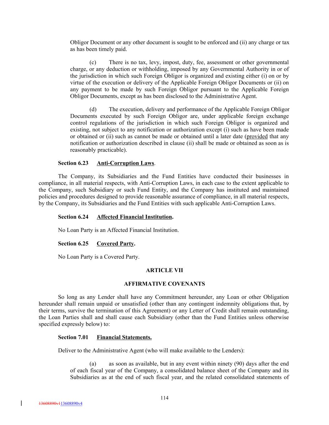 Obligor Document or any other document is sought to be enforced and (ii) any charge or tax as has been timely paid. (c) There is no tax, levy, impost, duty, fee, assessment or other governmental charge, or any deduction or withholding, imposed by any Governmental Authority in or of the jurisdiction in which such Foreign Obligor is organized and existing either (i) on or by virtue of the execution or delivery of the Applicable Foreign Obligor Documents or (ii) on any payment to be made by such Foreign Obligor pursuant to the Applicable Foreign Obligor Documents, except as has been disclosed to the Administrative Agent. (d) The execution, delivery and performance of the Applicable Foreign Obligor Documents executed by such Foreign Obligor are, under applicable foreign exchange control regulations of the jurisdiction in which such Foreign Obligor is organized and existing, not subject to any notification or authorization except (i) such as have been made or obtained or (ii) such as cannot be made or obtained until a later date (provided that any notification or authorization described in clause (ii) shall be made or obtained as soon as is reasonably practicable). Section 6.23 Anti-Corruption Laws. The Company, its Subsidiaries and the Fund Entities have conducted their businesses in compliance, in all material respects, with Anti-Corruption Laws, in each case to the extent applicable to the Company, such Subsidiary or such Fund Entity, and the Company has instituted and maintained policies and procedures designed to provide reasonable assurance of compliance, in all material respects, by the Company, its Subsidiaries and the Fund Entities with such applicable Anti-Corruption Laws. Section 6.24 Affected Financial Institution. No Loan Party is an Affected Financial Institution. Section 6.25 Covered Party. No Loan Party is a Covered Party. ARTICLE VII AFFIRMATIVE COVENANTS So long as any Lender shall have any Commitment hereunder, any Loan or other Obligation hereunder shall remain unpaid or unsatisfied (other than any contingent indemnity obligations that, by their terms, survive the termination of this Agreement) or any Letter of Credit shall remain outstanding, the Loan Parties shall and shall cause each Subsidiary (other than the Fund Entities unless otherwise specified expressly below) to: Section 7.01 Financial Statements. Deliver to the Administrative Agent (who will make available to the Lenders): (a) as soon as available, but in any event within ninety (90) days after the end of each fiscal year of the Company, a consolidated balance sheet of the Company and its Subsidiaries as at the end of such fiscal year, and the related consolidated statements of 114 13608890v113608890v4