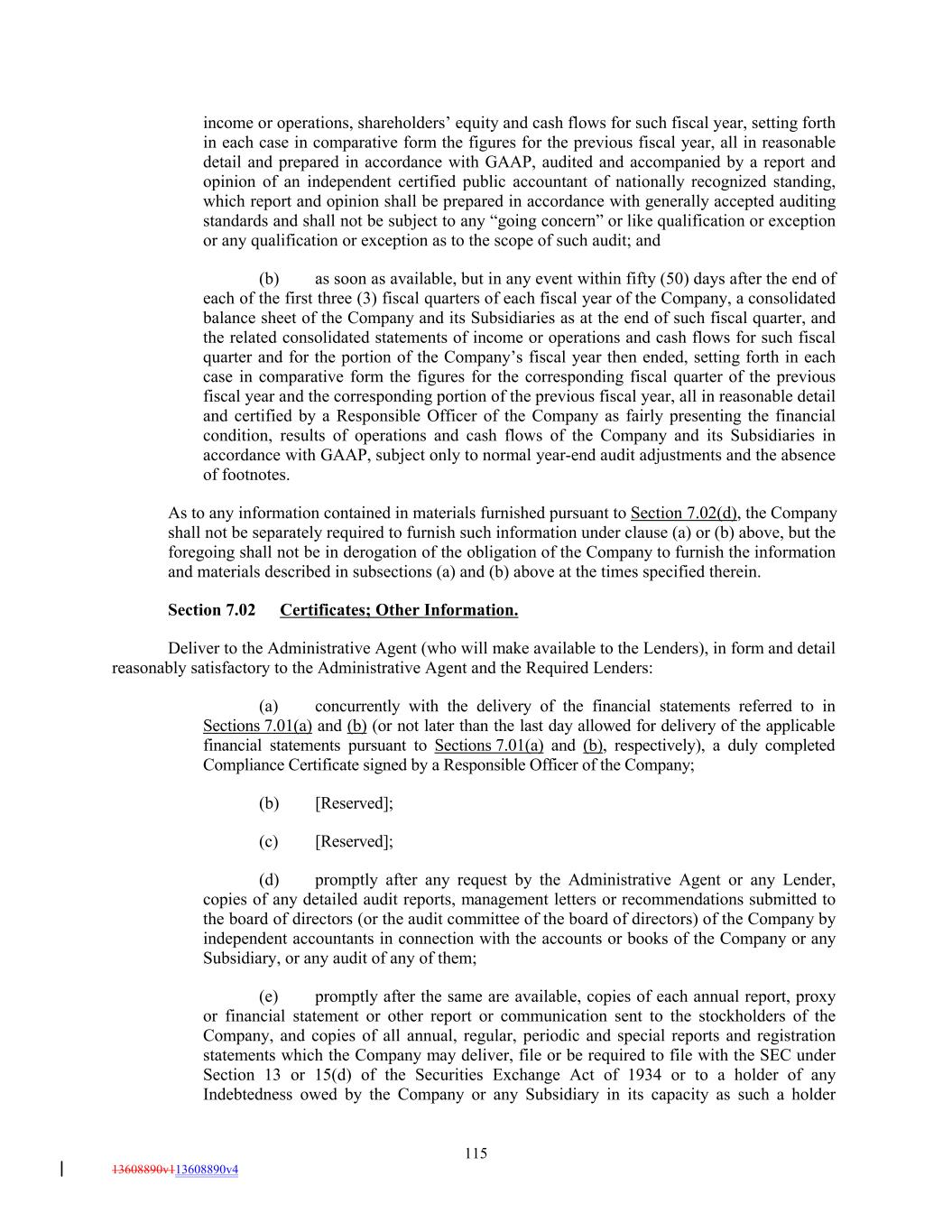 income or operations, shareholders’ equity and cash flows for such fiscal year, setting forth in each case in comparative form the figures for the previous fiscal year, all in reasonable detail and prepared in accordance with GAAP, audited and accompanied by a report and opinion of an independent certified public accountant of nationally recognized standing, which report and opinion shall be prepared in accordance with generally accepted auditing standards and shall not be subject to any “going concern” or like qualification or exception or any qualification or exception as to the scope of such audit; and (b) as soon as available, but in any event within fifty (50) days after the end of each of the first three (3) fiscal quarters of each fiscal year of the Company, a consolidated balance sheet of the Company and its Subsidiaries as at the end of such fiscal quarter, and the related consolidated statements of income or operations and cash flows for such fiscal quarter and for the portion of the Company’s fiscal year then ended, setting forth in each case in comparative form the figures for the corresponding fiscal quarter of the previous fiscal year and the corresponding portion of the previous fiscal year, all in reasonable detail and certified by a Responsible Officer of the Company as fairly presenting the financial condition, results of operations and cash flows of the Company and its Subsidiaries in accordance with GAAP, subject only to normal year-end audit adjustments and the absence of footnotes. As to any information contained in materials furnished pursuant to Section 7.02(d), the Company shall not be separately required to furnish such information under clause (a) or (b) above, but the foregoing shall not be in derogation of the obligation of the Company to furnish the information and materials described in subsections (a) and (b) above at the times specified therein. Section 7.02 Certificates; Other Information. Deliver to the Administrative Agent (who will make available to the Lenders), in form and detail reasonably satisfactory to the Administrative Agent and the Required Lenders: (a) concurrently with the delivery of the financial statements referred to in Sections 7.01(a) and (b) (or not later than the last day allowed for delivery of the applicable financial statements pursuant to Sections 7.01(a) and (b), respectively), a duly completed Compliance Certificate signed by a Responsible Officer of the Company; (b) [Reserved]; (c) [Reserved]; (d) promptly after any request by the Administrative Agent or any Lender, copies of any detailed audit reports, management letters or recommendations submitted to the board of directors (or the audit committee of the board of directors) of the Company by independent accountants in connection with the accounts or books of the Company or any Subsidiary, or any audit of any of them; (e) promptly after the same are available, copies of each annual report, proxy or financial statement or other report or communication sent to the stockholders of the Company, and copies of all annual, regular, periodic and special reports and registration statements which the Company may deliver, file or be required to file with the SEC under Section 13 or 15(d) of the Securities Exchange Act of 1934 or to a holder of any Indebtedness owed by the Company or any Subsidiary in its capacity as such a holder 115 13608890v113608890v4