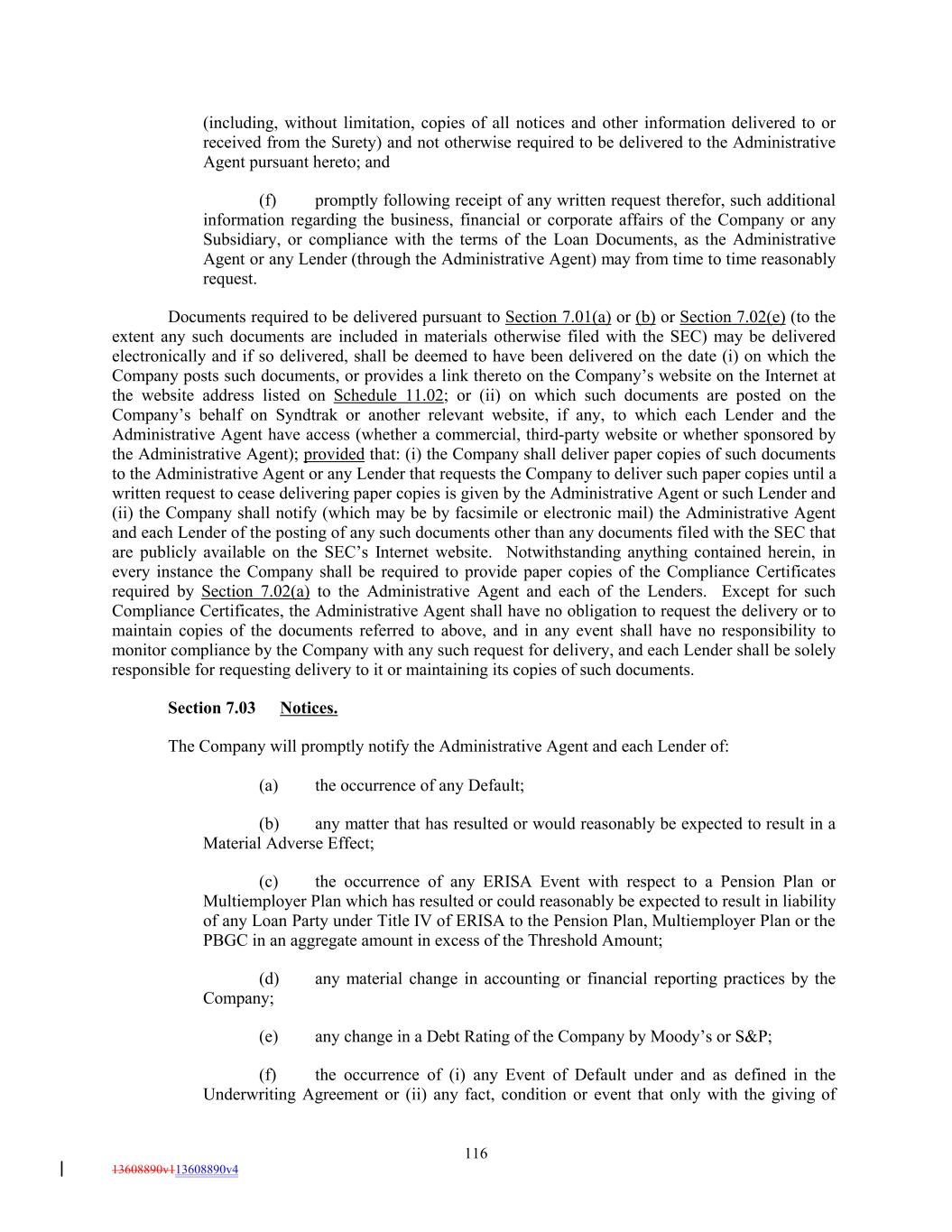 (including, without limitation, copies of all notices and other information delivered to or received from the Surety) and not otherwise required to be delivered to the Administrative Agent pursuant hereto; and (f) promptly following receipt of any written request therefor, such additional information regarding the business, financial or corporate affairs of the Company or any Subsidiary, or compliance with the terms of the Loan Documents, as the Administrative Agent or any Lender (through the Administrative Agent) may from time to time reasonably request. Documents required to be delivered pursuant to Section 7.01(a) or (b) or Section 7.02(e) (to the extent any such documents are included in materials otherwise filed with the SEC) may be delivered electronically and if so delivered, shall be deemed to have been delivered on the date (i) on which the Company posts such documents, or provides a link thereto on the Company’s website on the Internet at the website address listed on Schedule 11.02; or (ii) on which such documents are posted on the Company’s behalf on Syndtrak or another relevant website, if any, to which each Lender and the Administrative Agent have access (whether a commercial, third-party website or whether sponsored by the Administrative Agent); provided that: (i) the Company shall deliver paper copies of such documents to the Administrative Agent or any Lender that requests the Company to deliver such paper copies until a written request to cease delivering paper copies is given by the Administrative Agent or such Lender and (ii) the Company shall notify (which may be by facsimile or electronic mail) the Administrative Agent and each Lender of the posting of any such documents other than any documents filed with the SEC that are publicly available on the SEC’s Internet website. Notwithstanding anything contained herein, in every instance the Company shall be required to provide paper copies of the Compliance Certificates required by Section 7.02(a) to the Administrative Agent and each of the Lenders. Except for such Compliance Certificates, the Administrative Agent shall have no obligation to request the delivery or to maintain copies of the documents referred to above, and in any event shall have no responsibility to monitor compliance by the Company with any such request for delivery, and each Lender shall be solely responsible for requesting delivery to it or maintaining its copies of such documents. Section 7.03 Notices. The Company will promptly notify the Administrative Agent and each Lender of: (a) the occurrence of any Default; (b) any matter that has resulted or would reasonably be expected to result in a Material Adverse Effect; (c) the occurrence of any ERISA Event with respect to a Pension Plan or Multiemployer Plan which has resulted or could reasonably be expected to result in liability of any Loan Party under Title IV of ERISA to the Pension Plan, Multiemployer Plan or the PBGC in an aggregate amount in excess of the Threshold Amount; (d) any material change in accounting or financial reporting practices by the Company; (e) any change in a Debt Rating of the Company by Moody’s or S&P; (f) the occurrence of (i) any Event of Default under and as defined in the Underwriting Agreement or (ii) any fact, condition or event that only with the giving of 116 13608890v113608890v4