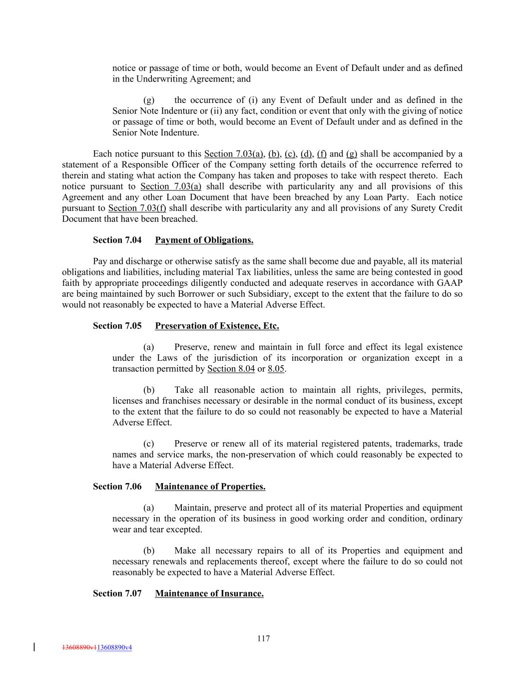 notice or passage of time or both, would become an Event of Default under and as defined in the Underwriting Agreement; and (g) the occurrence of (i) any Event of Default under and as defined in the Senior Note Indenture or (ii) any fact, condition or event that only with the giving of notice or passage of time or both, would become an Event of Default under and as defined in the Senior Note Indenture. Each notice pursuant to this Section 7.03(a), (b), (c), (d), (f) and (g) shall be accompanied by a statement of a Responsible Officer of the Company setting forth details of the occurrence referred to therein and stating what action the Company has taken and proposes to take with respect thereto. Each notice pursuant to Section 7.03(a) shall describe with particularity any and all provisions of this Agreement and any other Loan Document that have been breached by any Loan Party. Each notice pursuant to Section 7.03(f) shall describe with particularity any and all provisions of any Surety Credit Document that have been breached. Section 7.04 Payment of Obligations. Pay and discharge or otherwise satisfy as the same shall become due and payable, all its material obligations and liabilities, including material Tax liabilities, unless the same are being contested in good faith by appropriate proceedings diligently conducted and adequate reserves in accordance with GAAP are being maintained by such Borrower or such Subsidiary, except to the extent that the failure to do so would not reasonably be expected to have a Material Adverse Effect. Section 7.05 Preservation of Existence, Etc. (a) Preserve, renew and maintain in full force and effect its legal existence under the Laws of the jurisdiction of its incorporation or organization except in a transaction permitted by Section 8.04 or 8.05. (b) Take all reasonable action to maintain all rights, privileges, permits, licenses and franchises necessary or desirable in the normal conduct of its business, except to the extent that the failure to do so could not reasonably be expected to have a Material Adverse Effect. (c) Preserve or renew all of its material registered patents, trademarks, trade names and service marks, the non-preservation of which could reasonably be expected to have a Material Adverse Effect. Section 7.06 Maintenance of Properties. (a) Maintain, preserve and protect all of its material Properties and equipment necessary in the operation of its business in good working order and condition, ordinary wear and tear excepted. (b) Make all necessary repairs to all of its Properties and equipment and necessary renewals and replacements thereof, except where the failure to do so could not reasonably be expected to have a Material Adverse Effect. Section 7.07 Maintenance of Insurance. 117 13608890v113608890v4