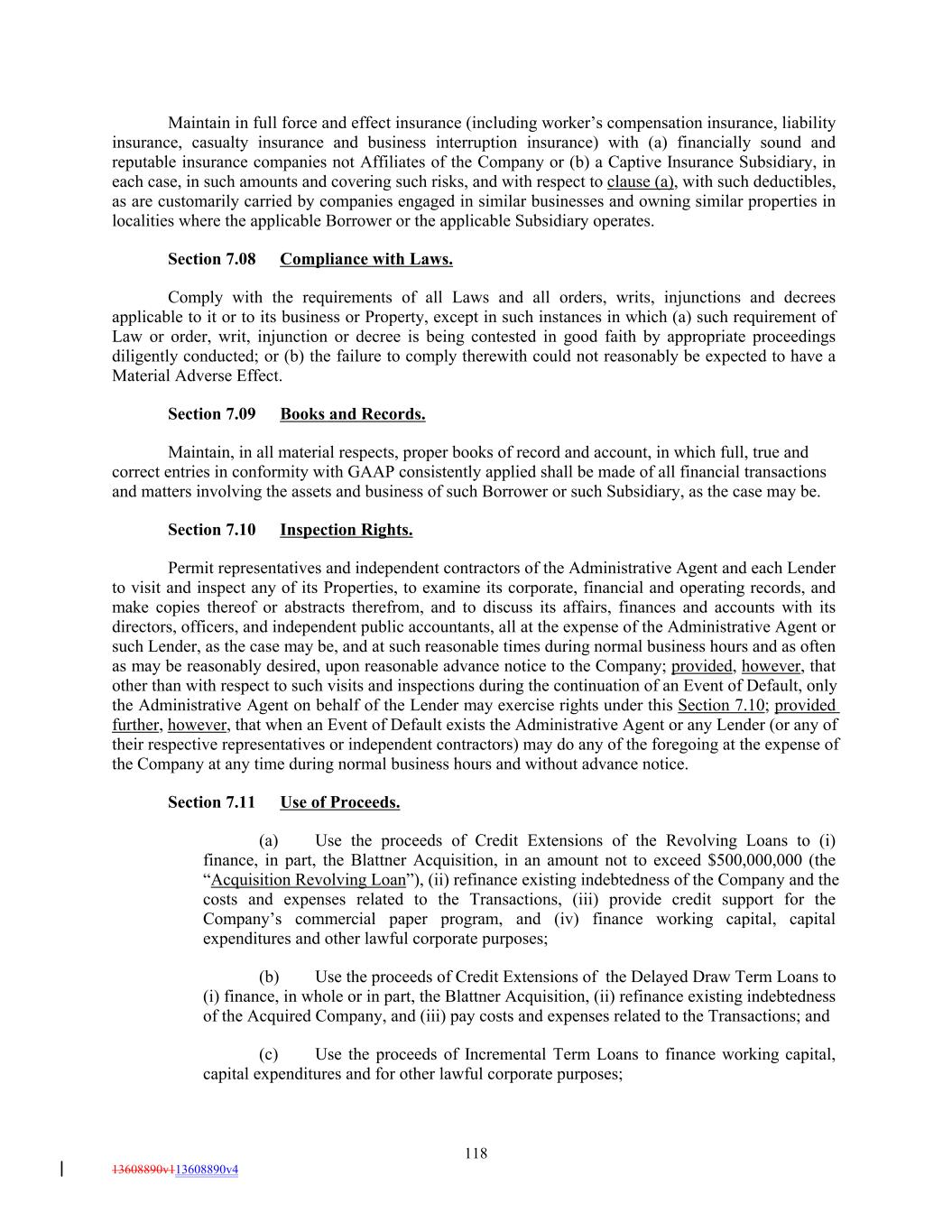Maintain in full force and effect insurance (including worker’s compensation insurance, liability insurance, casualty insurance and business interruption insurance) with (a) financially sound and reputable insurance companies not Affiliates of the Company or (b) a Captive Insurance Subsidiary, in each case, in such amounts and covering such risks, and with respect to clause (a), with such deductibles, as are customarily carried by companies engaged in similar businesses and owning similar properties in localities where the applicable Borrower or the applicable Subsidiary operates. Section 7.08 Compliance with Laws. Comply with the requirements of all Laws and all orders, writs, injunctions and decrees applicable to it or to its business or Property, except in such instances in which (a) such requirement of Law or order, writ, injunction or decree is being contested in good faith by appropriate proceedings diligently conducted; or (b) the failure to comply therewith could not reasonably be expected to have a Material Adverse Effect. Section 7.09 Books and Records. Maintain, in all material respects, proper books of record and account, in which full, true and correct entries in conformity with GAAP consistently applied shall be made of all financial transactions and matters involving the assets and business of such Borrower or such Subsidiary, as the case may be. Section 7.10 Inspection Rights. Permit representatives and independent contractors of the Administrative Agent and each Lender to visit and inspect any of its Properties, to examine its corporate, financial and operating records, and make copies thereof or abstracts therefrom, and to discuss its affairs, finances and accounts with its directors, officers, and independent public accountants, all at the expense of the Administrative Agent or such Lender, as the case may be, and at such reasonable times during normal business hours and as often as may be reasonably desired, upon reasonable advance notice to the Company; provided, however, that other than with respect to such visits and inspections during the continuation of an Event of Default, only the Administrative Agent on behalf of the Lender may exercise rights under this Section 7.10; provided further, however, that when an Event of Default exists the Administrative Agent or any Lender (or any of their respective representatives or independent contractors) may do any of the foregoing at the expense of the Company at any time during normal business hours and without advance notice. Section 7.11 Use of Proceeds. (a) Use the proceeds of Credit Extensions of the Revolving Loans to (i) finance, in part, the Blattner Acquisition, in an amount not to exceed $500,000,000 (the “Acquisition Revolving Loan”), (ii) refinance existing indebtedness of the Company and the costs and expenses related to the Transactions, (iii) provide credit support for the Company’s commercial paper program, and (iv) finance working capital, capital expenditures and other lawful corporate purposes; (b) Use the proceeds of Credit Extensions of the Delayed Draw Term Loans to (i) finance, in whole or in part, the Blattner Acquisition, (ii) refinance existing indebtedness of the Acquired Company, and (iii) pay costs and expenses related to the Transactions; and (c) Use the proceeds of Incremental Term Loans to finance working capital, capital expenditures and for other lawful corporate purposes; 118 13608890v113608890v4