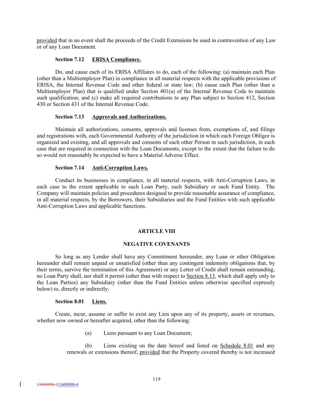 provided that in no event shall the proceeds of the Credit Extensions be used in contravention of any Law or of any Loan Document. Section 7.12 ERISA Compliance. Do, and cause each of its ERISA Affiliates to do, each of the following: (a) maintain each Plan (other than a Multiemployer Plan) in compliance in all material respects with the applicable provisions of ERISA, the Internal Revenue Code and other federal or state law; (b) cause each Plan (other than a Multiemployer Plan) that is qualified under Section 401(a) of the Internal Revenue Code to maintain such qualification; and (c) make all required contributions to any Plan subject to Section 412, Section 430 or Section 431 of the Internal Revenue Code. Section 7.13 Approvals and Authorizations. Maintain all authorizations, consents, approvals and licenses from, exemptions of, and filings and registrations with, each Governmental Authority of the jurisdiction in which each Foreign Obligor is organized and existing, and all approvals and consents of each other Person in such jurisdiction, in each case that are required in connection with the Loan Documents, except to the extent that the failure to do so would not reasonably be expected to have a Material Adverse Effect. Section 7.14 Anti-Corruption Laws. Conduct its businesses in compliance, in all material respects, with Anti-Corruption Laws, in each case to the extent applicable to such Loan Party, such Subsidiary or such Fund Entity. The Company will maintain policies and procedures designed to provide reasonable assurance of compliance, in all material respects, by the Borrowers, their Subsidiaries and the Fund Entities with such applicable Anti-Corruption Laws and applicable Sanctions. ARTICLE VIII NEGATIVE COVENANTS So long as any Lender shall have any Commitment hereunder, any Loan or other Obligation hereunder shall remain unpaid or unsatisfied (other than any contingent indemnity obligations that, by their terms, survive the termination of this Agreement) or any Letter of Credit shall remain outstanding, no Loan Party shall, nor shall it permit (other than with respect to Section 8.13, which shall apply only to the Loan Parties) any Subsidiary (other than the Fund Entities unless otherwise specified expressly below) to, directly or indirectly: Section 8.01 Liens. Create, incur, assume or suffer to exist any Lien upon any of its property, assets or revenues, whether now owned or hereafter acquired, other than the following: (a) Liens pursuant to any Loan Document; (b) Liens existing on the date hereof and listed on Schedule 8.01 and any renewals or extensions thereof, provided that the Property covered thereby is not increased 119 13608890v113608890v4