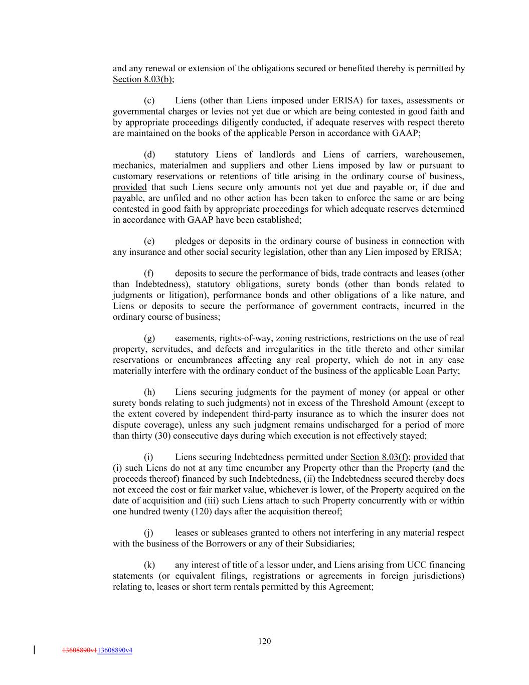 and any renewal or extension of the obligations secured or benefited thereby is permitted by Section 8.03(b); (c) Liens (other than Liens imposed under ERISA) for taxes, assessments or governmental charges or levies not yet due or which are being contested in good faith and by appropriate proceedings diligently conducted, if adequate reserves with respect thereto are maintained on the books of the applicable Person in accordance with GAAP; (d) statutory Liens of landlords and Liens of carriers, warehousemen, mechanics, materialmen and suppliers and other Liens imposed by law or pursuant to customary reservations or retentions of title arising in the ordinary course of business, provided that such Liens secure only amounts not yet due and payable or, if due and payable, are unfiled and no other action has been taken to enforce the same or are being contested in good faith by appropriate proceedings for which adequate reserves determined in accordance with GAAP have been established; (e) pledges or deposits in the ordinary course of business in connection with any insurance and other social security legislation, other than any Lien imposed by ERISA; (f) deposits to secure the performance of bids, trade contracts and leases (other than Indebtedness), statutory obligations, surety bonds (other than bonds related to judgments or litigation), performance bonds and other obligations of a like nature, and Liens or deposits to secure the performance of government contracts, incurred in the ordinary course of business; (g) easements, rights-of-way, zoning restrictions, restrictions on the use of real property, servitudes, and defects and irregularities in the title thereto and other similar reservations or encumbrances affecting any real property, which do not in any case materially interfere with the ordinary conduct of the business of the applicable Loan Party; (h) Liens securing judgments for the payment of money (or appeal or other surety bonds relating to such judgments) not in excess of the Threshold Amount (except to the extent covered by independent third-party insurance as to which the insurer does not dispute coverage), unless any such judgment remains undischarged for a period of more than thirty (30) consecutive days during which execution is not effectively stayed; (i) Liens securing Indebtedness permitted under Section 8.03(f); provided that (i) such Liens do not at any time encumber any Property other than the Property (and the proceeds thereof) financed by such Indebtedness, (ii) the Indebtedness secured thereby does not exceed the cost or fair market value, whichever is lower, of the Property acquired on the date of acquisition and (iii) such Liens attach to such Property concurrently with or within one hundred twenty (120) days after the acquisition thereof; (j) leases or subleases granted to others not interfering in any material respect with the business of the Borrowers or any of their Subsidiaries; (k) any interest of title of a lessor under, and Liens arising from UCC financing statements (or equivalent filings, registrations or agreements in foreign jurisdictions) relating to, leases or short term rentals permitted by this Agreement; 120 13608890v113608890v4