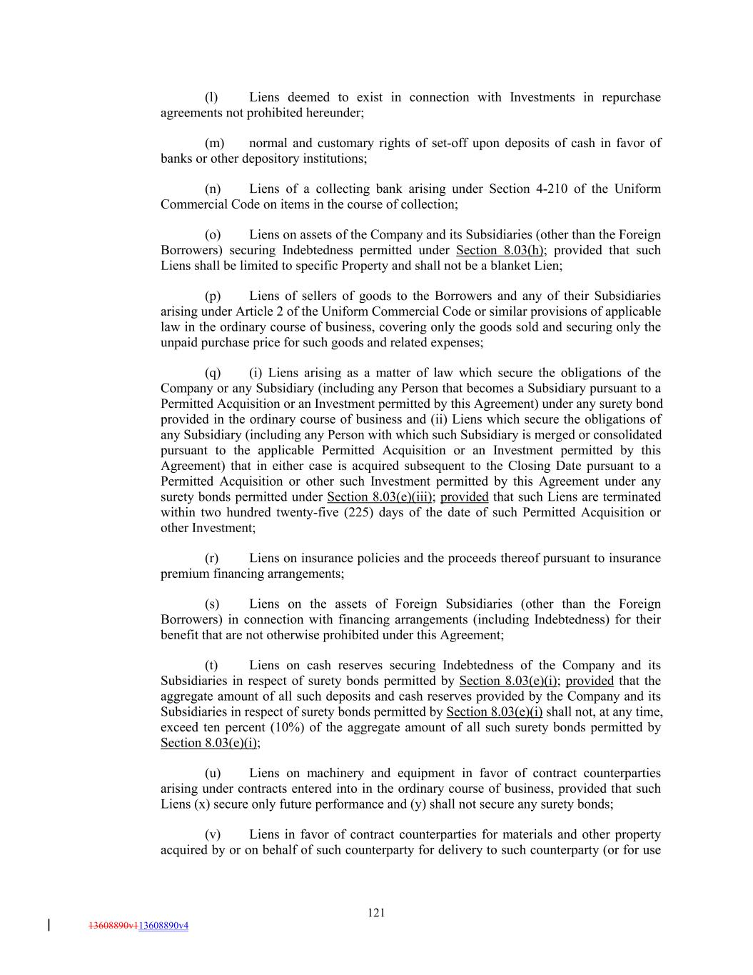 (l) Liens deemed to exist in connection with Investments in repurchase agreements not prohibited hereunder; (m) normal and customary rights of set-off upon deposits of cash in favor of banks or other depository institutions; (n) Liens of a collecting bank arising under Section 4-210 of the Uniform Commercial Code on items in the course of collection; (o) Liens on assets of the Company and its Subsidiaries (other than the Foreign Borrowers) securing Indebtedness permitted under Section 8.03(h); provided that such Liens shall be limited to specific Property and shall not be a blanket Lien; (p) Liens of sellers of goods to the Borrowers and any of their Subsidiaries arising under Article 2 of the Uniform Commercial Code or similar provisions of applicable law in the ordinary course of business, covering only the goods sold and securing only the unpaid purchase price for such goods and related expenses; (q) (i) Liens arising as a matter of law which secure the obligations of the Company or any Subsidiary (including any Person that becomes a Subsidiary pursuant to a Permitted Acquisition or an Investment permitted by this Agreement) under any surety bond provided in the ordinary course of business and (ii) Liens which secure the obligations of any Subsidiary (including any Person with which such Subsidiary is merged or consolidated pursuant to the applicable Permitted Acquisition or an Investment permitted by this Agreement) that in either case is acquired subsequent to the Closing Date pursuant to a Permitted Acquisition or other such Investment permitted by this Agreement under any surety bonds permitted under Section 8.03(e)(iii); provided that such Liens are terminated within two hundred twenty-five (225) days of the date of such Permitted Acquisition or other Investment; (r) Liens on insurance policies and the proceeds thereof pursuant to insurance premium financing arrangements; (s) Liens on the assets of Foreign Subsidiaries (other than the Foreign Borrowers) in connection with financing arrangements (including Indebtedness) for their benefit that are not otherwise prohibited under this Agreement; (t) Liens on cash reserves securing Indebtedness of the Company and its Subsidiaries in respect of surety bonds permitted by Section 8.03(e)(i); provided that the aggregate amount of all such deposits and cash reserves provided by the Company and its Subsidiaries in respect of surety bonds permitted by Section 8.03(e)(i) shall not, at any time, exceed ten percent (10%) of the aggregate amount of all such surety bonds permitted by Section 8.03(e)(i); (u) Liens on machinery and equipment in favor of contract counterparties arising under contracts entered into in the ordinary course of business, provided that such Liens (x) secure only future performance and (y) shall not secure any surety bonds; (v) Liens in favor of contract counterparties for materials and other property acquired by or on behalf of such counterparty for delivery to such counterparty (or for use 121 13608890v113608890v4