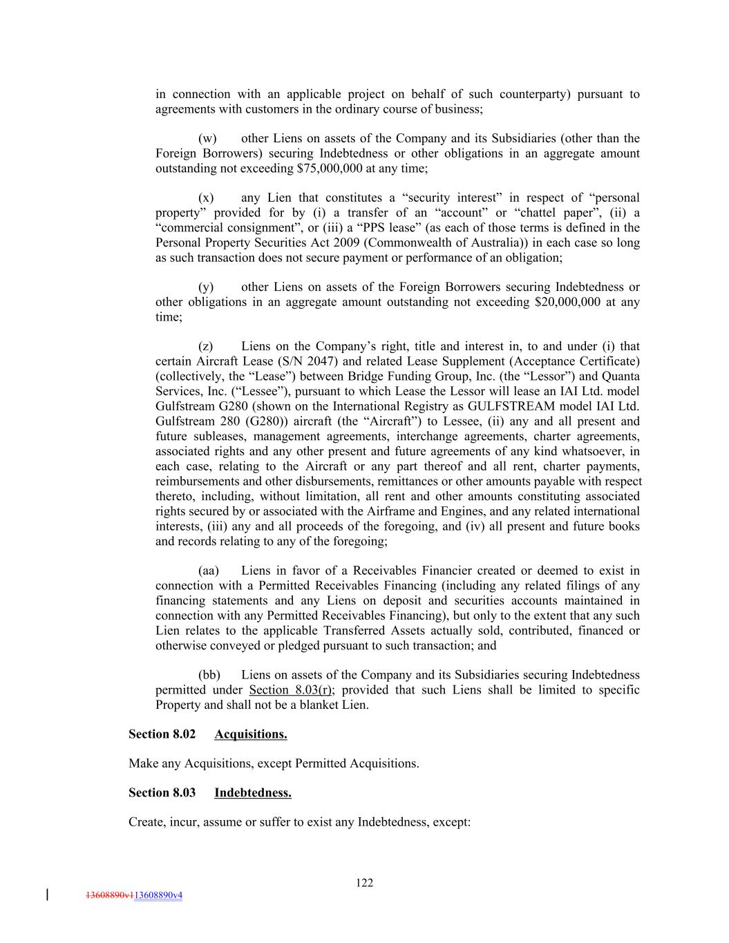 in connection with an applicable project on behalf of such counterparty) pursuant to agreements with customers in the ordinary course of business; (w) other Liens on assets of the Company and its Subsidiaries (other than the Foreign Borrowers) securing Indebtedness or other obligations in an aggregate amount outstanding not exceeding $75,000,000 at any time; (x) any Lien that constitutes a “security interest” in respect of “personal property” provided for by (i) a transfer of an “account” or “chattel paper”, (ii) a “commercial consignment”, or (iii) a “PPS lease” (as each of those terms is defined in the Personal Property Securities Act 2009 (Commonwealth of Australia)) in each case so long as such transaction does not secure payment or performance of an obligation; (y) other Liens on assets of the Foreign Borrowers securing Indebtedness or other obligations in an aggregate amount outstanding not exceeding $20,000,000 at any time; (z) Liens on the Company’s right, title and interest in, to and under (i) that certain Aircraft Lease (S/N 2047) and related Lease Supplement (Acceptance Certificate) (collectively, the “Lease”) between Bridge Funding Group, Inc. (the “Lessor”) and Quanta Services, Inc. (“Lessee”), pursuant to which Lease the Lessor will lease an IAI Ltd. model Gulfstream G280 (shown on the International Registry as GULFSTREAM model IAI Ltd. Gulfstream 280 (G280)) aircraft (the “Aircraft”) to Lessee, (ii) any and all present and future subleases, management agreements, interchange agreements, charter agreements, associated rights and any other present and future agreements of any kind whatsoever, in each case, relating to the Aircraft or any part thereof and all rent, charter payments, reimbursements and other disbursements, remittances or other amounts payable with respect thereto, including, without limitation, all rent and other amounts constituting associated rights secured by or associated with the Airframe and Engines, and any related international interests, (iii) any and all proceeds of the foregoing, and (iv) all present and future books and records relating to any of the foregoing; (aa) Liens in favor of a Receivables Financier created or deemed to exist in connection with a Permitted Receivables Financing (including any related filings of any financing statements and any Liens on deposit and securities accounts maintained in connection with any Permitted Receivables Financing), but only to the extent that any such Lien relates to the applicable Transferred Assets actually sold, contributed, financed or otherwise conveyed or pledged pursuant to such transaction; and (bb) Liens on assets of the Company and its Subsidiaries securing Indebtedness permitted under Section 8.03(r); provided that such Liens shall be limited to specific Property and shall not be a blanket Lien. Section 8.02 Acquisitions. Make any Acquisitions, except Permitted Acquisitions. Section 8.03 Indebtedness. Create, incur, assume or suffer to exist any Indebtedness, except: 122 13608890v113608890v4