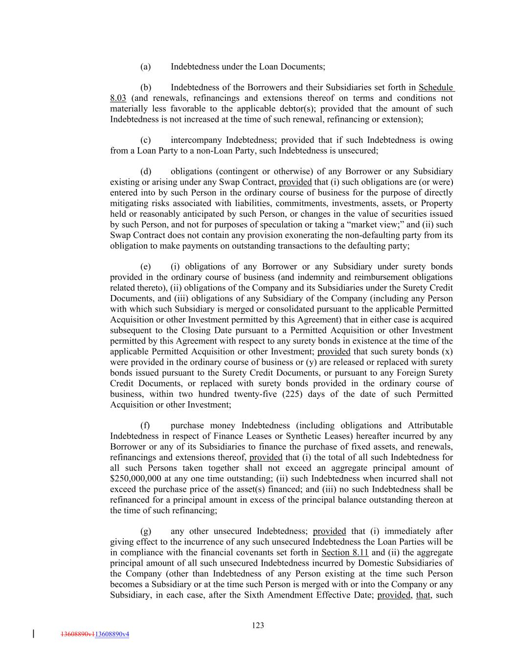 (a) Indebtedness under the Loan Documents; (b) Indebtedness of the Borrowers and their Subsidiaries set forth in Schedule 8.03 (and renewals, refinancings and extensions thereof on terms and conditions not materially less favorable to the applicable debtor(s); provided that the amount of such Indebtedness is not increased at the time of such renewal, refinancing or extension); (c) intercompany Indebtedness; provided that if such Indebtedness is owing from a Loan Party to a non-Loan Party, such Indebtedness is unsecured; (d) obligations (contingent or otherwise) of any Borrower or any Subsidiary existing or arising under any Swap Contract, provided that (i) such obligations are (or were) entered into by such Person in the ordinary course of business for the purpose of directly mitigating risks associated with liabilities, commitments, investments, assets, or Property held or reasonably anticipated by such Person, or changes in the value of securities issued by such Person, and not for purposes of speculation or taking a “market view;” and (ii) such Swap Contract does not contain any provision exonerating the non-defaulting party from its obligation to make payments on outstanding transactions to the defaulting party; (e) (i) obligations of any Borrower or any Subsidiary under surety bonds provided in the ordinary course of business (and indemnity and reimbursement obligations related thereto), (ii) obligations of the Company and its Subsidiaries under the Surety Credit Documents, and (iii) obligations of any Subsidiary of the Company (including any Person with which such Subsidiary is merged or consolidated pursuant to the applicable Permitted Acquisition or other Investment permitted by this Agreement) that in either case is acquired subsequent to the Closing Date pursuant to a Permitted Acquisition or other Investment permitted by this Agreement with respect to any surety bonds in existence at the time of the applicable Permitted Acquisition or other Investment; provided that such surety bonds (x) were provided in the ordinary course of business or (y) are released or replaced with surety bonds issued pursuant to the Surety Credit Documents, or pursuant to any Foreign Surety Credit Documents, or replaced with surety bonds provided in the ordinary course of business, within two hundred twenty-five (225) days of the date of such Permitted Acquisition or other Investment; (f) purchase money Indebtedness (including obligations and Attributable Indebtedness in respect of Finance Leases or Synthetic Leases) hereafter incurred by any Borrower or any of its Subsidiaries to finance the purchase of fixed assets, and renewals, refinancings and extensions thereof, provided that (i) the total of all such Indebtedness for all such Persons taken together shall not exceed an aggregate principal amount of $250,000,000 at any one time outstanding; (ii) such Indebtedness when incurred shall not exceed the purchase price of the asset(s) financed; and (iii) no such Indebtedness shall be refinanced for a principal amount in excess of the principal balance outstanding thereon at the time of such refinancing; (g) any other unsecured Indebtedness; provided that (i) immediately after giving effect to the incurrence of any such unsecured Indebtedness the Loan Parties will be in compliance with the financial covenants set forth in Section 8.11 and (ii) the aggregate principal amount of all such unsecured Indebtedness incurred by Domestic Subsidiaries of the Company (other than Indebtedness of any Person existing at the time such Person becomes a Subsidiary or at the time such Person is merged with or into the Company or any Subsidiary, in each case, after the Sixth Amendment Effective Date; provided, that, such 123 13608890v113608890v4