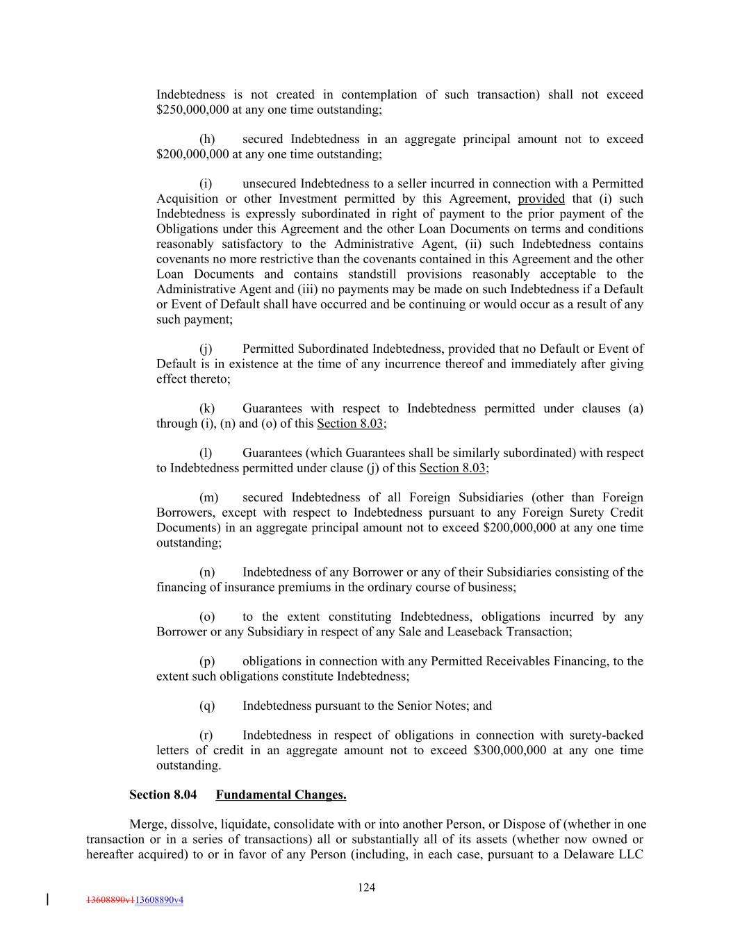 Indebtedness is not created in contemplation of such transaction) shall not exceed $250,000,000 at any one time outstanding; (h) secured Indebtedness in an aggregate principal amount not to exceed $200,000,000 at any one time outstanding; (i) unsecured Indebtedness to a seller incurred in connection with a Permitted Acquisition or other Investment permitted by this Agreement, provided that (i) such Indebtedness is expressly subordinated in right of payment to the prior payment of the Obligations under this Agreement and the other Loan Documents on terms and conditions reasonably satisfactory to the Administrative Agent, (ii) such Indebtedness contains covenants no more restrictive than the covenants contained in this Agreement and the other Loan Documents and contains standstill provisions reasonably acceptable to the Administrative Agent and (iii) no payments may be made on such Indebtedness if a Default or Event of Default shall have occurred and be continuing or would occur as a result of any such payment; (j) Permitted Subordinated Indebtedness, provided that no Default or Event of Default is in existence at the time of any incurrence thereof and immediately after giving effect thereto; (k) Guarantees with respect to Indebtedness permitted under clauses (a) through (i), (n) and (o) of this Section 8.03; (l) Guarantees (which Guarantees shall be similarly subordinated) with respect to Indebtedness permitted under clause (j) of this Section 8.03; (m) secured Indebtedness of all Foreign Subsidiaries (other than Foreign Borrowers, except with respect to Indebtedness pursuant to any Foreign Surety Credit Documents) in an aggregate principal amount not to exceed $200,000,000 at any one time outstanding; (n) Indebtedness of any Borrower or any of their Subsidiaries consisting of the financing of insurance premiums in the ordinary course of business; (o) to the extent constituting Indebtedness, obligations incurred by any Borrower or any Subsidiary in respect of any Sale and Leaseback Transaction; (p) obligations in connection with any Permitted Receivables Financing, to the extent such obligations constitute Indebtedness; (q) Indebtedness pursuant to the Senior Notes; and (r) Indebtedness in respect of obligations in connection with surety-backed letters of credit in an aggregate amount not to exceed $300,000,000 at any one time outstanding. Section 8.04 Fundamental Changes. Merge, dissolve, liquidate, consolidate with or into another Person, or Dispose of (whether in one transaction or in a series of transactions) all or substantially all of its assets (whether now owned or hereafter acquired) to or in favor of any Person (including, in each case, pursuant to a Delaware LLC 124 13608890v113608890v4