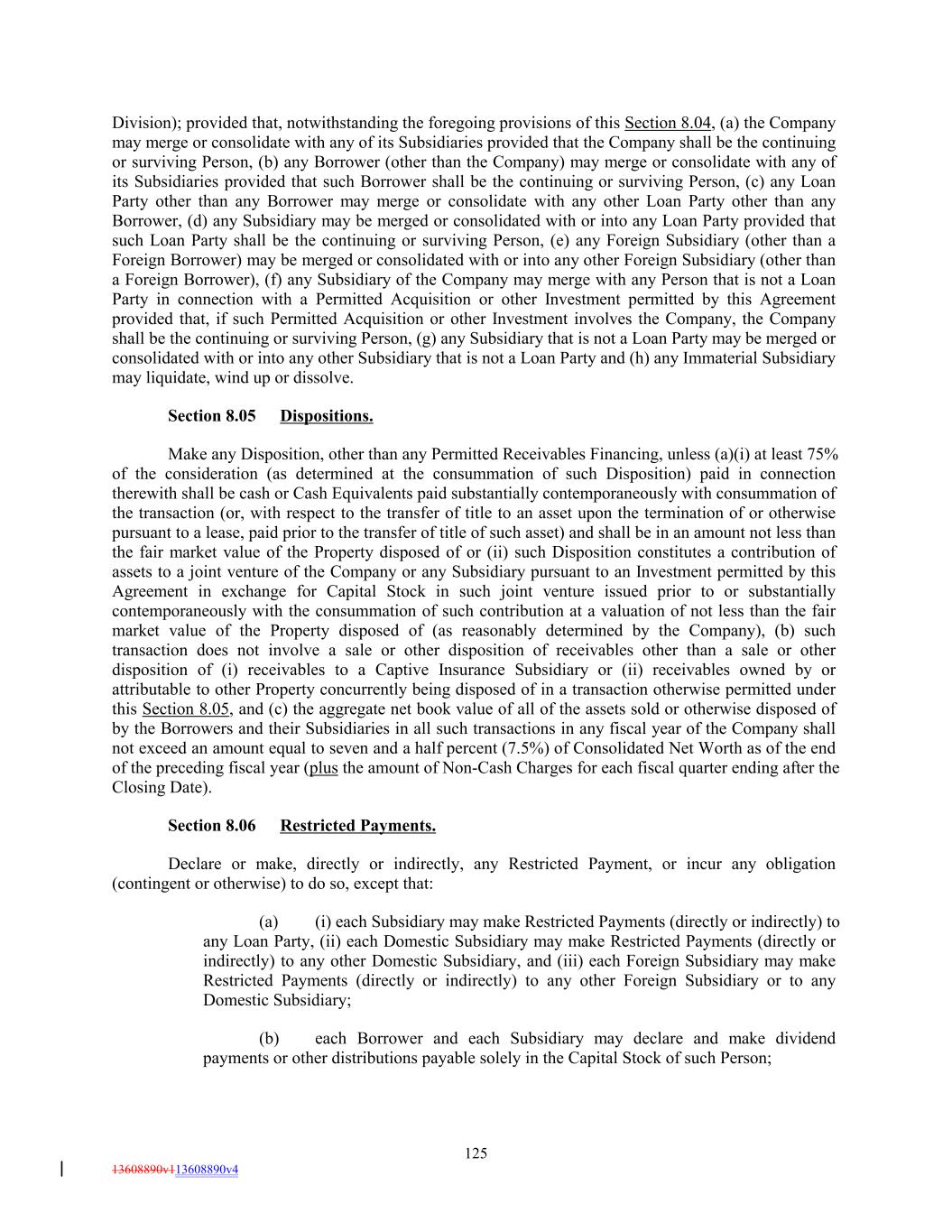 Division); provided that, notwithstanding the foregoing provisions of this Section 8.04, (a) the Company may merge or consolidate with any of its Subsidiaries provided that the Company shall be the continuing or surviving Person, (b) any Borrower (other than the Company) may merge or consolidate with any of its Subsidiaries provided that such Borrower shall be the continuing or surviving Person, (c) any Loan Party other than any Borrower may merge or consolidate with any other Loan Party other than any Borrower, (d) any Subsidiary may be merged or consolidated with or into any Loan Party provided that such Loan Party shall be the continuing or surviving Person, (e) any Foreign Subsidiary (other than a Foreign Borrower) may be merged or consolidated with or into any other Foreign Subsidiary (other than a Foreign Borrower), (f) any Subsidiary of the Company may merge with any Person that is not a Loan Party in connection with a Permitted Acquisition or other Investment permitted by this Agreement provided that, if such Permitted Acquisition or other Investment involves the Company, the Company shall be the continuing or surviving Person, (g) any Subsidiary that is not a Loan Party may be merged or consolidated with or into any other Subsidiary that is not a Loan Party and (h) any Immaterial Subsidiary may liquidate, wind up or dissolve. Section 8.05 Dispositions. Make any Disposition, other than any Permitted Receivables Financing, unless (a)(i) at least 75% of the consideration (as determined at the consummation of such Disposition) paid in connection therewith shall be cash or Cash Equivalents paid substantially contemporaneously with consummation of the transaction (or, with respect to the transfer of title to an asset upon the termination of or otherwise pursuant to a lease, paid prior to the transfer of title of such asset) and shall be in an amount not less than the fair market value of the Property disposed of or (ii) such Disposition constitutes a contribution of assets to a joint venture of the Company or any Subsidiary pursuant to an Investment permitted by this Agreement in exchange for Capital Stock in such joint venture issued prior to or substantially contemporaneously with the consummation of such contribution at a valuation of not less than the fair market value of the Property disposed of (as reasonably determined by the Company), (b) such transaction does not involve a sale or other disposition of receivables other than a sale or other disposition of (i) receivables to a Captive Insurance Subsidiary or (ii) receivables owned by or attributable to other Property concurrently being disposed of in a transaction otherwise permitted under this Section 8.05, and (c) the aggregate net book value of all of the assets sold or otherwise disposed of by the Borrowers and their Subsidiaries in all such transactions in any fiscal year of the Company shall not exceed an amount equal to seven and a half percent (7.5%) of Consolidated Net Worth as of the end of the preceding fiscal year (plus the amount of Non-Cash Charges for each fiscal quarter ending after the Closing Date). Section 8.06 Restricted Payments. Declare or make, directly or indirectly, any Restricted Payment, or incur any obligation (contingent or otherwise) to do so, except that: (a) (i) each Subsidiary may make Restricted Payments (directly or indirectly) to any Loan Party, (ii) each Domestic Subsidiary may make Restricted Payments (directly or indirectly) to any other Domestic Subsidiary, and (iii) each Foreign Subsidiary may make Restricted Payments (directly or indirectly) to any other Foreign Subsidiary or to any Domestic Subsidiary; (b) each Borrower and each Subsidiary may declare and make dividend payments or other distributions payable solely in the Capital Stock of such Person; 125 13608890v113608890v4