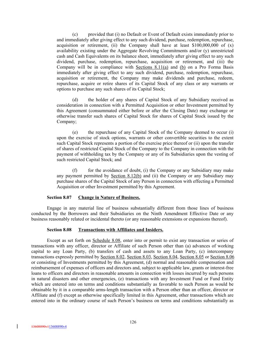 (c) provided that (i) no Default or Event of Default exists immediately prior to and immediately after giving effect to any such dividend, purchase, redemption, repurchase, acquisition or retirement, (ii) the Company shall have at least $100,000,000 of (x) availability existing under the Aggregate Revolving Commitments and/or (y) unrestricted cash and Cash Equivalents on its balance sheet, immediately after giving effect to any such dividend, purchase, redemption, repurchase, acquisition or retirement, and (iii) the Company will be in compliance with Sections 8.11(a) and (b) on a Pro Forma Basis immediately after giving effect to any such dividend, purchase, redemption, repurchase, acquisition or retirement, the Company may make dividends and purchase, redeem, repurchase, acquire or retire shares of its Capital Stock of any class or any warrants or options to purchase any such shares of its Capital Stock; (d) the holder of any shares of Capital Stock of any Subsidiary received as consideration in connection with a Permitted Acquisition or other Investment permitted by this Agreement (consummated either before or after the Closing Date) may exchange or otherwise transfer such shares of Capital Stock for shares of Capital Stock issued by the Company; (e) the repurchase of any Capital Stock of the Company deemed to occur (i) upon the exercise of stock options, warrants or other convertible securities to the extent such Capital Stock represents a portion of the exercise price thereof or (ii) upon the transfer of shares of restricted Capital Stock of the Company to the Company in connection with the payment of withholding tax by the Company or any of its Subsidiaries upon the vesting of such restricted Capital Stock; and (f) for the avoidance of doubt, (i) the Company or any Subsidiary may make any payment permitted by Section 8.12(b) and (ii) the Company or any Subsidiary may purchase shares of the Capital Stock of any Person in connection with effecting a Permitted Acquisition or other Investment permitted by this Agreement. Section 8.07 Change in Nature of Business. Engage in any material line of business substantially different from those lines of business conducted by the Borrowers and their Subsidiaries on the Ninth Amendment Effective Date or any business reasonably related or incidental thereto (or any reasonable extensions or expansions thereof). Section 8.08 Transactions with Affiliates and Insiders. Except as set forth on Schedule 8.08, enter into or permit to exist any transaction or series of transactions with any officer, director or Affiliate of such Person other than (a) advances of working capital to any Loan Party, (b) transfers of cash and assets to any Loan Party, (c) intercompany transactions expressly permitted by Section 8.02, Section 8.03, Section 8.04, Section 8.05 or Section 8.06 or consisting of Investments permitted by this Agreement, (d) normal and reasonable compensation and reimbursement of expenses of officers and directors and, subject to applicable law, grants or interest-free loans to officers and directors in reasonable amounts in connection with losses incurred by such persons in natural disasters and other emergencies, (e) transactions with any Investment Fund or Fund Entity which are entered into on terms and conditions substantially as favorable to such Person as would be obtainable by it in a comparable arms-length transaction with a Person other than an officer, director or Affiliate and (f) except as otherwise specifically limited in this Agreement, other transactions which are entered into in the ordinary course of such Person’s business on terms and conditions substantially as 126 13608890v113608890v4