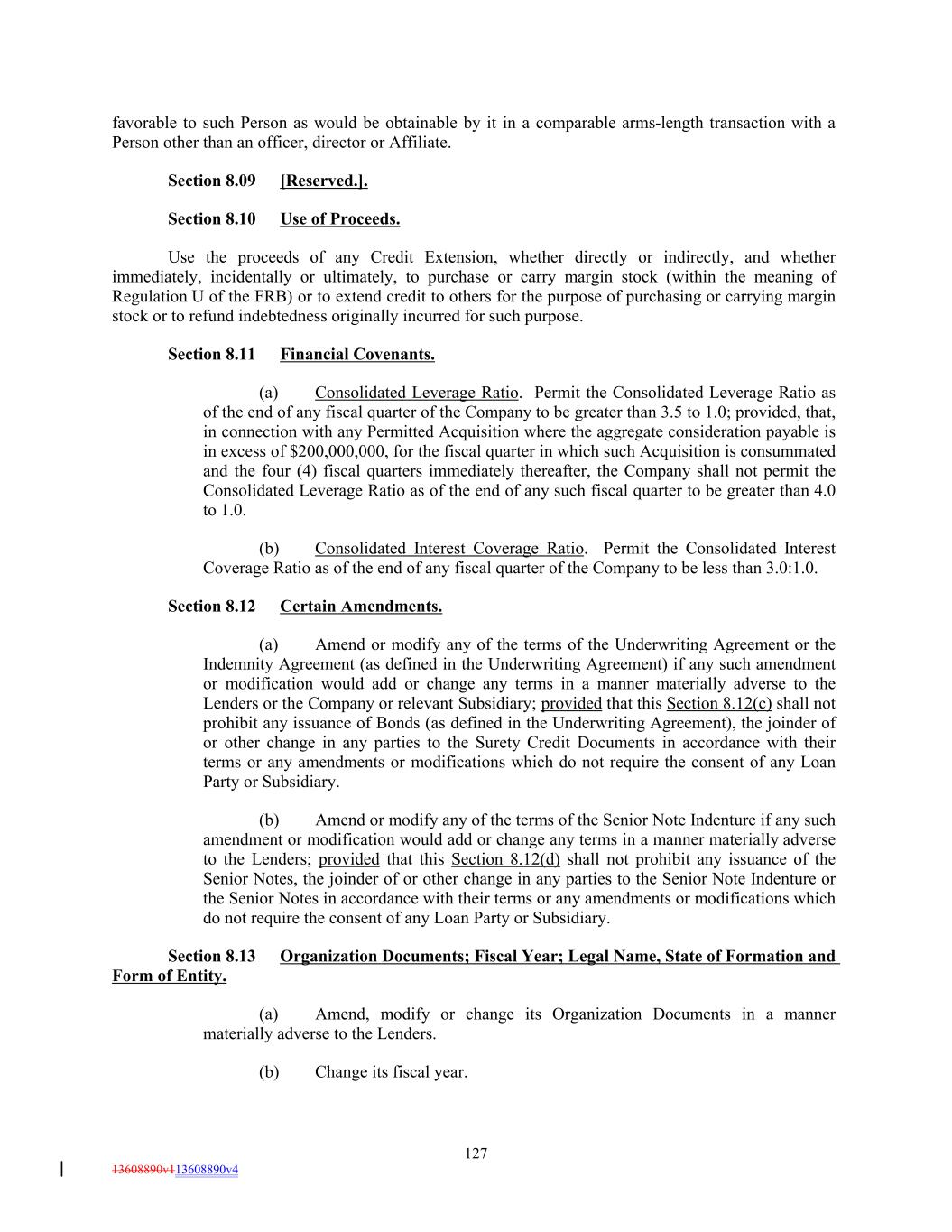 favorable to such Person as would be obtainable by it in a comparable arms-length transaction with a Person other than an officer, director or Affiliate. Section 8.09 [Reserved.]. Section 8.10 Use of Proceeds. Use the proceeds of any Credit Extension, whether directly or indirectly, and whether immediately, incidentally or ultimately, to purchase or carry margin stock (within the meaning of Regulation U of the FRB) or to extend credit to others for the purpose of purchasing or carrying margin stock or to refund indebtedness originally incurred for such purpose. Section 8.11 Financial Covenants. (a) Consolidated Leverage Ratio. Permit the Consolidated Leverage Ratio as of the end of any fiscal quarter of the Company to be greater than 3.5 to 1.0; provided, that, in connection with any Permitted Acquisition where the aggregate consideration payable is in excess of $200,000,000, for the fiscal quarter in which such Acquisition is consummated and the four (4) fiscal quarters immediately thereafter, the Company shall not permit the Consolidated Leverage Ratio as of the end of any such fiscal quarter to be greater than 4.0 to 1.0. (b) Consolidated Interest Coverage Ratio. Permit the Consolidated Interest Coverage Ratio as of the end of any fiscal quarter of the Company to be less than 3.0:1.0. Section 8.12 Certain Amendments. (a) Amend or modify any of the terms of the Underwriting Agreement or the Indemnity Agreement (as defined in the Underwriting Agreement) if any such amendment or modification would add or change any terms in a manner materially adverse to the Lenders or the Company or relevant Subsidiary; provided that this Section 8.12(c) shall not prohibit any issuance of Bonds (as defined in the Underwriting Agreement), the joinder of or other change in any parties to the Surety Credit Documents in accordance with their terms or any amendments or modifications which do not require the consent of any Loan Party or Subsidiary. (b) Amend or modify any of the terms of the Senior Note Indenture if any such amendment or modification would add or change any terms in a manner materially adverse to the Lenders; provided that this Section 8.12(d) shall not prohibit any issuance of the Senior Notes, the joinder of or other change in any parties to the Senior Note Indenture or the Senior Notes in accordance with their terms or any amendments or modifications which do not require the consent of any Loan Party or Subsidiary. Section 8.13 Organization Documents; Fiscal Year; Legal Name, State of Formation and Form of Entity. (a) Amend, modify or change its Organization Documents in a manner materially adverse to the Lenders. (b) Change its fiscal year. 127 13608890v113608890v4