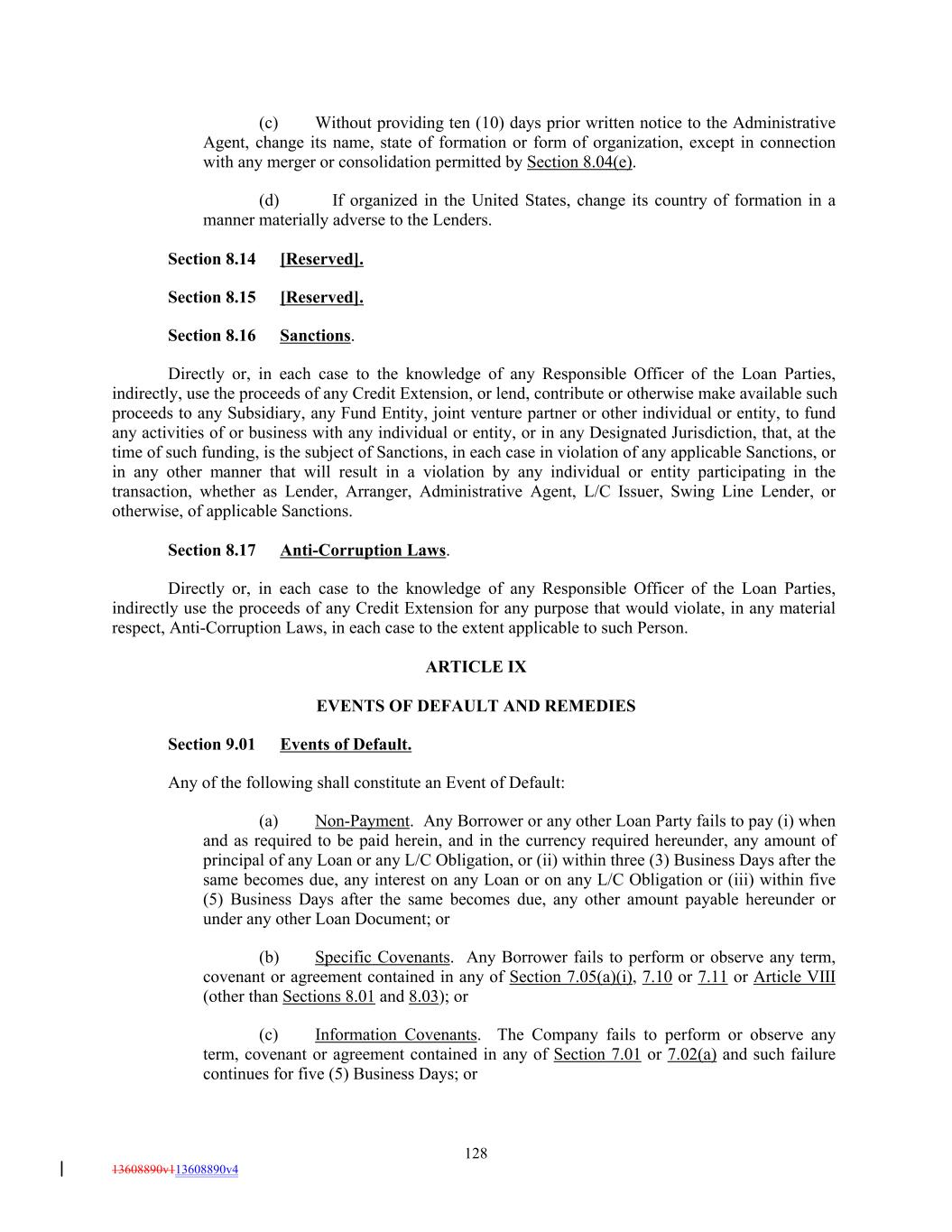 (c) Without providing ten (10) days prior written notice to the Administrative Agent, change its name, state of formation or form of organization, except in connection with any merger or consolidation permitted by Section 8.04(e). (d) If organized in the United States, change its country of formation in a manner materially adverse to the Lenders. Section 8.14 [Reserved]. Section 8.15 [Reserved]. Section 8.16 Sanctions. Directly or, in each case to the knowledge of any Responsible Officer of the Loan Parties, indirectly, use the proceeds of any Credit Extension, or lend, contribute or otherwise make available such proceeds to any Subsidiary, any Fund Entity, joint venture partner or other individual or entity, to fund any activities of or business with any individual or entity, or in any Designated Jurisdiction, that, at the time of such funding, is the subject of Sanctions, in each case in violation of any applicable Sanctions, or in any other manner that will result in a violation by any individual or entity participating in the transaction, whether as Lender, Arranger, Administrative Agent, L/C Issuer, Swing Line Lender, or otherwise, of applicable Sanctions. Section 8.17 Anti-Corruption Laws. Directly or, in each case to the knowledge of any Responsible Officer of the Loan Parties, indirectly use the proceeds of any Credit Extension for any purpose that would violate, in any material respect, Anti-Corruption Laws, in each case to the extent applicable to such Person. ARTICLE IX EVENTS OF DEFAULT AND REMEDIES Section 9.01 Events of Default. Any of the following shall constitute an Event of Default: (a) Non-Payment. Any Borrower or any other Loan Party fails to pay (i) when and as required to be paid herein, and in the currency required hereunder, any amount of principal of any Loan or any L/C Obligation, or (ii) within three (3) Business Days after the same becomes due, any interest on any Loan or on any L/C Obligation or (iii) within five (5) Business Days after the same becomes due, any other amount payable hereunder or under any other Loan Document; or (b) Specific Covenants. Any Borrower fails to perform or observe any term, covenant or agreement contained in any of Section 7.05(a)(i), 7.10 or 7.11 or Article VIII (other than Sections 8.01 and 8.03); or (c) Information Covenants. The Company fails to perform or observe any term, covenant or agreement contained in any of Section 7.01 or 7.02(a) and such failure continues for five (5) Business Days; or 128 13608890v113608890v4