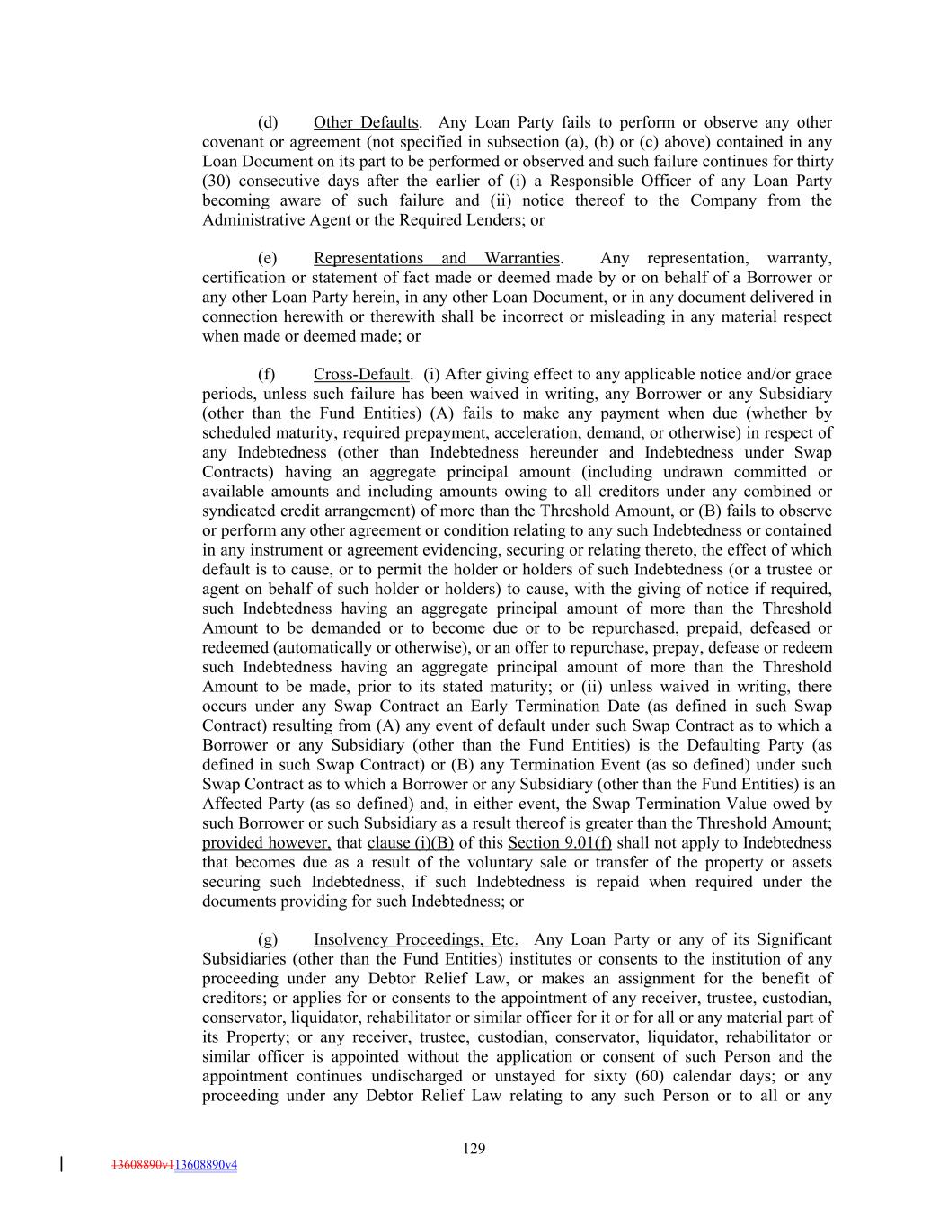 (d) Other Defaults. Any Loan Party fails to perform or observe any other covenant or agreement (not specified in subsection (a), (b) or (c) above) contained in any Loan Document on its part to be performed or observed and such failure continues for thirty (30) consecutive days after the earlier of (i) a Responsible Officer of any Loan Party becoming aware of such failure and (ii) notice thereof to the Company from the Administrative Agent or the Required Lenders; or (e) Representations and Warranties. Any representation, warranty, certification or statement of fact made or deemed made by or on behalf of a Borrower or any other Loan Party herein, in any other Loan Document, or in any document delivered in connection herewith or therewith shall be incorrect or misleading in any material respect when made or deemed made; or (f) Cross-Default. (i) After giving effect to any applicable notice and/or grace periods, unless such failure has been waived in writing, any Borrower or any Subsidiary (other than the Fund Entities) (A) fails to make any payment when due (whether by scheduled maturity, required prepayment, acceleration, demand, or otherwise) in respect of any Indebtedness (other than Indebtedness hereunder and Indebtedness under Swap Contracts) having an aggregate principal amount (including undrawn committed or available amounts and including amounts owing to all creditors under any combined or syndicated credit arrangement) of more than the Threshold Amount, or (B) fails to observe or perform any other agreement or condition relating to any such Indebtedness or contained in any instrument or agreement evidencing, securing or relating thereto, the effect of which default is to cause, or to permit the holder or holders of such Indebtedness (or a trustee or agent on behalf of such holder or holders) to cause, with the giving of notice if required, such Indebtedness having an aggregate principal amount of more than the Threshold Amount to be demanded or to become due or to be repurchased, prepaid, defeased or redeemed (automatically or otherwise), or an offer to repurchase, prepay, defease or redeem such Indebtedness having an aggregate principal amount of more than the Threshold Amount to be made, prior to its stated maturity; or (ii) unless waived in writing, there occurs under any Swap Contract an Early Termination Date (as defined in such Swap Contract) resulting from (A) any event of default under such Swap Contract as to which a Borrower or any Subsidiary (other than the Fund Entities) is the Defaulting Party (as defined in such Swap Contract) or (B) any Termination Event (as so defined) under such Swap Contract as to which a Borrower or any Subsidiary (other than the Fund Entities) is an Affected Party (as so defined) and, in either event, the Swap Termination Value owed by such Borrower or such Subsidiary as a result thereof is greater than the Threshold Amount; provided however, that clause (i)(B) of this Section 9.01(f) shall not apply to Indebtedness that becomes due as a result of the voluntary sale or transfer of the property or assets securing such Indebtedness, if such Indebtedness is repaid when required under the documents providing for such Indebtedness; or (g) Insolvency Proceedings, Etc. Any Loan Party or any of its Significant Subsidiaries (other than the Fund Entities) institutes or consents to the institution of any proceeding under any Debtor Relief Law, or makes an assignment for the benefit of creditors; or applies for or consents to the appointment of any receiver, trustee, custodian, conservator, liquidator, rehabilitator or similar officer for it or for all or any material part of its Property; or any receiver, trustee, custodian, conservator, liquidator, rehabilitator or similar officer is appointed without the application or consent of such Person and the appointment continues undischarged or unstayed for sixty (60) calendar days; or any proceeding under any Debtor Relief Law relating to any such Person or to all or any 129 13608890v113608890v4