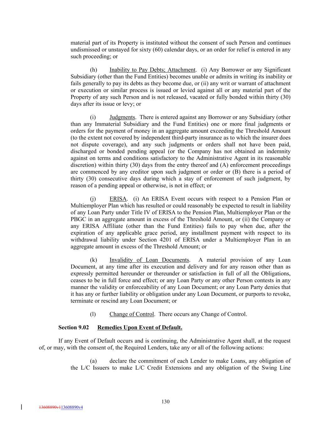material part of its Property is instituted without the consent of such Person and continues undismissed or unstayed for sixty (60) calendar days, or an order for relief is entered in any such proceeding; or (h) Inability to Pay Debts; Attachment. (i) Any Borrower or any Significant Subsidiary (other than the Fund Entities) becomes unable or admits in writing its inability or fails generally to pay its debts as they become due, or (ii) any writ or warrant of attachment or execution or similar process is issued or levied against all or any material part of the Property of any such Person and is not released, vacated or fully bonded within thirty (30) days after its issue or levy; or (i) Judgments. There is entered against any Borrower or any Subsidiary (other than any Immaterial Subsidiary and the Fund Entities) one or more final judgments or orders for the payment of money in an aggregate amount exceeding the Threshold Amount (to the extent not covered by independent third-party insurance as to which the insurer does not dispute coverage), and any such judgments or orders shall not have been paid, discharged or bonded pending appeal (or the Company has not obtained an indemnity against on terms and conditions satisfactory to the Administrative Agent in its reasonable discretion) within thirty (30) days from the entry thereof and (A) enforcement proceedings are commenced by any creditor upon such judgment or order or (B) there is a period of thirty (30) consecutive days during which a stay of enforcement of such judgment, by reason of a pending appeal or otherwise, is not in effect; or (j) ERISA. (i) An ERISA Event occurs with respect to a Pension Plan or Multiemployer Plan which has resulted or could reasonably be expected to result in liability of any Loan Party under Title IV of ERISA to the Pension Plan, Multiemployer Plan or the PBGC in an aggregate amount in excess of the Threshold Amount, or (ii) the Company or any ERISA Affiliate (other than the Fund Entities) fails to pay when due, after the expiration of any applicable grace period, any installment payment with respect to its withdrawal liability under Section 4201 of ERISA under a Multiemployer Plan in an aggregate amount in excess of the Threshold Amount; or (k) Invalidity of Loan Documents. A material provision of any Loan Document, at any time after its execution and delivery and for any reason other than as expressly permitted hereunder or thereunder or satisfaction in full of all the Obligations, ceases to be in full force and effect; or any Loan Party or any other Person contests in any manner the validity or enforceability of any Loan Document; or any Loan Party denies that it has any or further liability or obligation under any Loan Document, or purports to revoke, terminate or rescind any Loan Document; or (l) Change of Control. There occurs any Change of Control. Section 9.02 Remedies Upon Event of Default. If any Event of Default occurs and is continuing, the Administrative Agent shall, at the request of, or may, with the consent of, the Required Lenders, take any or all of the following actions: (a) declare the commitment of each Lender to make Loans, any obligation of the L/C Issuers to make L/C Credit Extensions and any obligation of the Swing Line 130 13608890v113608890v4
