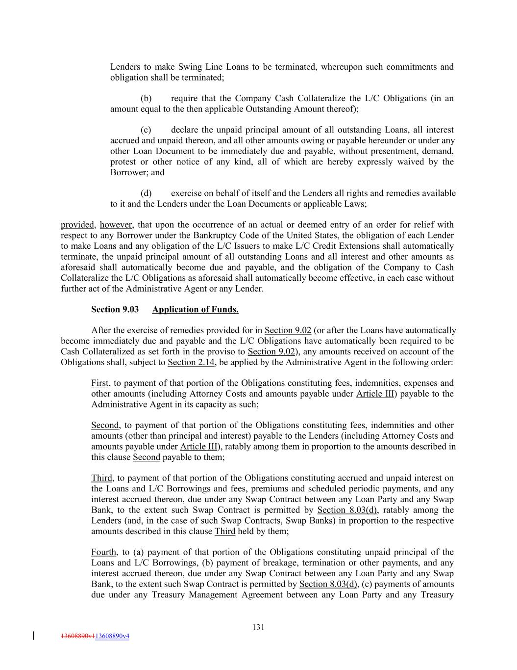Lenders to make Swing Line Loans to be terminated, whereupon such commitments and obligation shall be terminated; (b) require that the Company Cash Collateralize the L/C Obligations (in an amount equal to the then applicable Outstanding Amount thereof); (c) declare the unpaid principal amount of all outstanding Loans, all interest accrued and unpaid thereon, and all other amounts owing or payable hereunder or under any other Loan Document to be immediately due and payable, without presentment, demand, protest or other notice of any kind, all of which are hereby expressly waived by the Borrower; and (d) exercise on behalf of itself and the Lenders all rights and remedies available to it and the Lenders under the Loan Documents or applicable Laws; provided, however, that upon the occurrence of an actual or deemed entry of an order for relief with respect to any Borrower under the Bankruptcy Code of the United States, the obligation of each Lender to make Loans and any obligation of the L/C Issuers to make L/C Credit Extensions shall automatically terminate, the unpaid principal amount of all outstanding Loans and all interest and other amounts as aforesaid shall automatically become due and payable, and the obligation of the Company to Cash Collateralize the L/C Obligations as aforesaid shall automatically become effective, in each case without further act of the Administrative Agent or any Lender. Section 9.03 Application of Funds. After the exercise of remedies provided for in Section 9.02 (or after the Loans have automatically become immediately due and payable and the L/C Obligations have automatically been required to be Cash Collateralized as set forth in the proviso to Section 9.02), any amounts received on account of the Obligations shall, subject to Section 2.14, be applied by the Administrative Agent in the following order: First, to payment of that portion of the Obligations constituting fees, indemnities, expenses and other amounts (including Attorney Costs and amounts payable under Article III) payable to the Administrative Agent in its capacity as such; Second, to payment of that portion of the Obligations constituting fees, indemnities and other amounts (other than principal and interest) payable to the Lenders (including Attorney Costs and amounts payable under Article III), ratably among them in proportion to the amounts described in this clause Second payable to them; Third, to payment of that portion of the Obligations constituting accrued and unpaid interest on the Loans and L/C Borrowings and fees, premiums and scheduled periodic payments, and any interest accrued thereon, due under any Swap Contract between any Loan Party and any Swap Bank, to the extent such Swap Contract is permitted by Section 8.03(d), ratably among the Lenders (and, in the case of such Swap Contracts, Swap Banks) in proportion to the respective amounts described in this clause Third held by them; Fourth, to (a) payment of that portion of the Obligations constituting unpaid principal of the Loans and L/C Borrowings, (b) payment of breakage, termination or other payments, and any interest accrued thereon, due under any Swap Contract between any Loan Party and any Swap Bank, to the extent such Swap Contract is permitted by Section 8.03(d), (c) payments of amounts due under any Treasury Management Agreement between any Loan Party and any Treasury 131 13608890v113608890v4