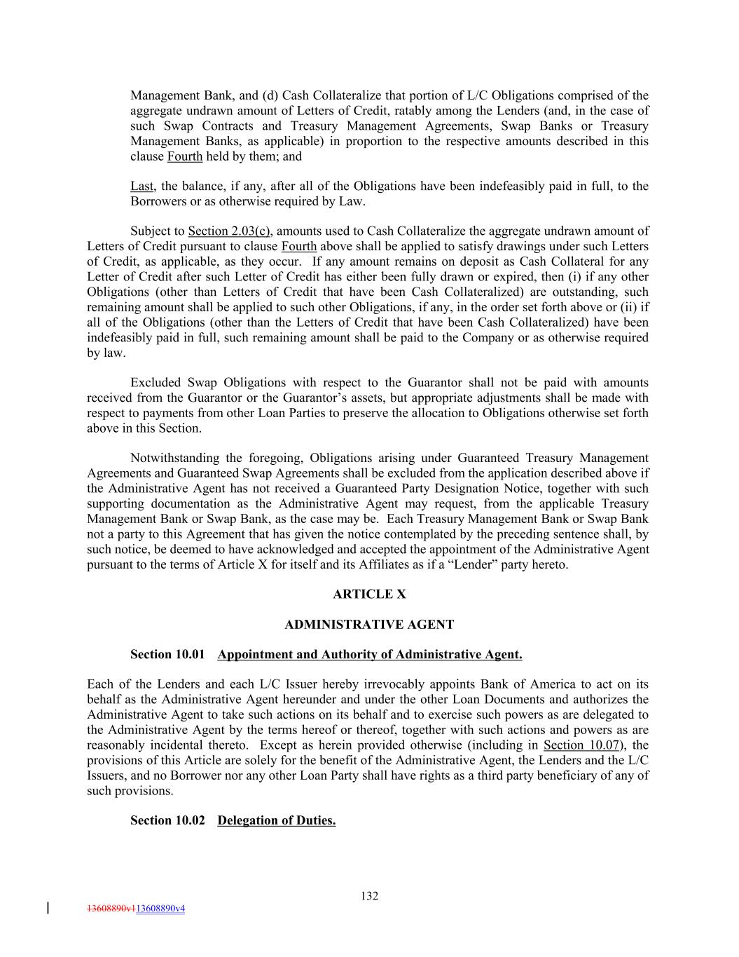 Management Bank, and (d) Cash Collateralize that portion of L/C Obligations comprised of the aggregate undrawn amount of Letters of Credit, ratably among the Lenders (and, in the case of such Swap Contracts and Treasury Management Agreements, Swap Banks or Treasury Management Banks, as applicable) in proportion to the respective amounts described in this clause Fourth held by them; and Last, the balance, if any, after all of the Obligations have been indefeasibly paid in full, to the Borrowers or as otherwise required by Law. Subject to Section 2.03(c), amounts used to Cash Collateralize the aggregate undrawn amount of Letters of Credit pursuant to clause Fourth above shall be applied to satisfy drawings under such Letters of Credit, as applicable, as they occur. If any amount remains on deposit as Cash Collateral for any Letter of Credit after such Letter of Credit has either been fully drawn or expired, then (i) if any other Obligations (other than Letters of Credit that have been Cash Collateralized) are outstanding, such remaining amount shall be applied to such other Obligations, if any, in the order set forth above or (ii) if all of the Obligations (other than the Letters of Credit that have been Cash Collateralized) have been indefeasibly paid in full, such remaining amount shall be paid to the Company or as otherwise required by law. Excluded Swap Obligations with respect to the Guarantor shall not be paid with amounts received from the Guarantor or the Guarantor’s assets, but appropriate adjustments shall be made with respect to payments from other Loan Parties to preserve the allocation to Obligations otherwise set forth above in this Section. Notwithstanding the foregoing, Obligations arising under Guaranteed Treasury Management Agreements and Guaranteed Swap Agreements shall be excluded from the application described above if the Administrative Agent has not received a Guaranteed Party Designation Notice, together with such supporting documentation as the Administrative Agent may request, from the applicable Treasury Management Bank or Swap Bank, as the case may be. Each Treasury Management Bank or Swap Bank not a party to this Agreement that has given the notice contemplated by the preceding sentence shall, by such notice, be deemed to have acknowledged and accepted the appointment of the Administrative Agent pursuant to the terms of Article X for itself and its Affiliates as if a “Lender” party hereto. ARTICLE X ADMINISTRATIVE AGENT Section 10.01 Appointment and Authority of Administrative Agent. Each of the Lenders and each L/C Issuer hereby irrevocably appoints Bank of America to act on its behalf as the Administrative Agent hereunder and under the other Loan Documents and authorizes the Administrative Agent to take such actions on its behalf and to exercise such powers as are delegated to the Administrative Agent by the terms hereof or thereof, together with such actions and powers as are reasonably incidental thereto. Except as herein provided otherwise (including in Section 10.07), the provisions of this Article are solely for the benefit of the Administrative Agent, the Lenders and the L/C Issuers, and no Borrower nor any other Loan Party shall have rights as a third party beneficiary of any of such provisions. Section 10.02 Delegation of Duties. 132 13608890v113608890v4