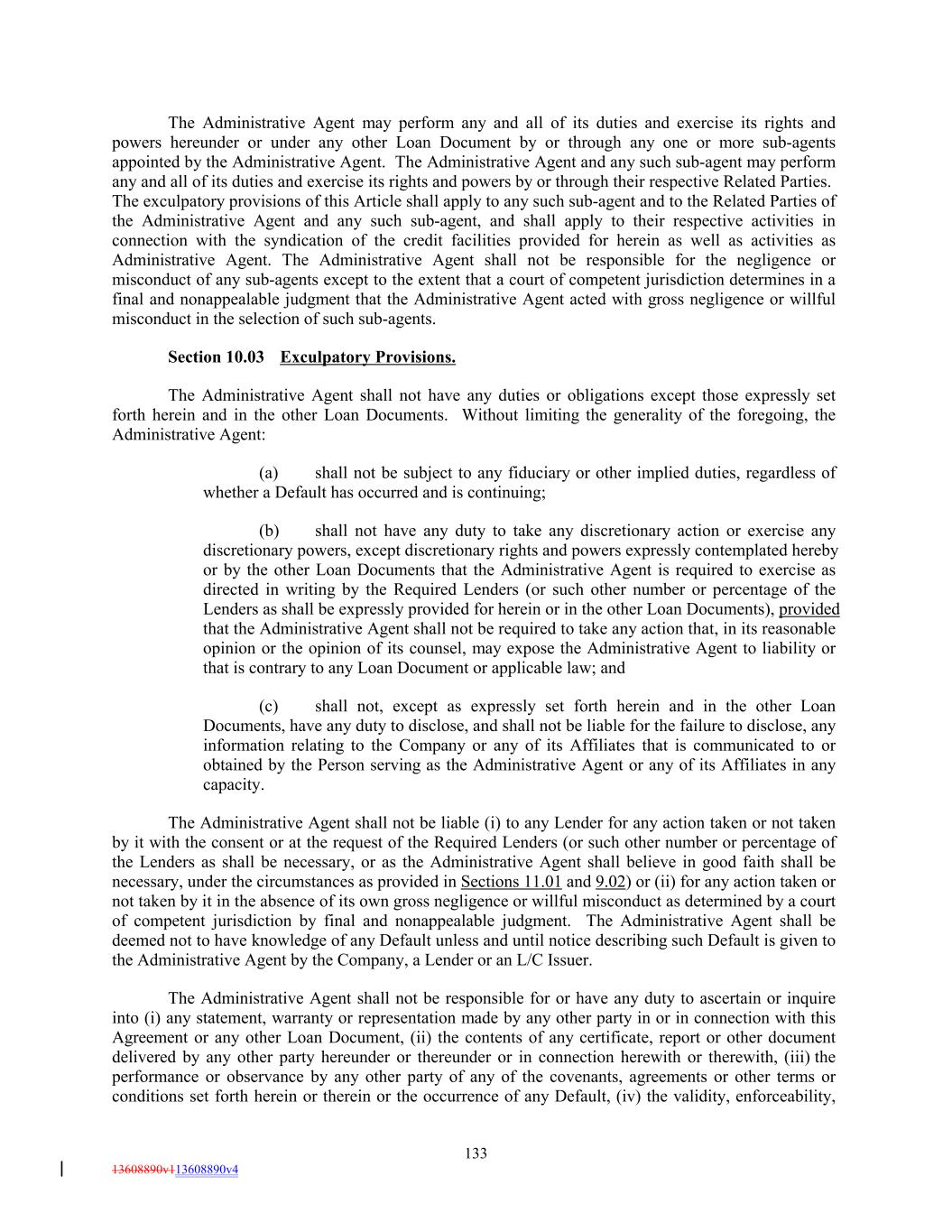 The Administrative Agent may perform any and all of its duties and exercise its rights and powers hereunder or under any other Loan Document by or through any one or more sub-agents appointed by the Administrative Agent. The Administrative Agent and any such sub-agent may perform any and all of its duties and exercise its rights and powers by or through their respective Related Parties. The exculpatory provisions of this Article shall apply to any such sub-agent and to the Related Parties of the Administrative Agent and any such sub-agent, and shall apply to their respective activities in connection with the syndication of the credit facilities provided for herein as well as activities as Administrative Agent. The Administrative Agent shall not be responsible for the negligence or misconduct of any sub-agents except to the extent that a court of competent jurisdiction determines in a final and nonappealable judgment that the Administrative Agent acted with gross negligence or willful misconduct in the selection of such sub-agents. Section 10.03 Exculpatory Provisions. The Administrative Agent shall not have any duties or obligations except those expressly set forth herein and in the other Loan Documents. Without limiting the generality of the foregoing, the Administrative Agent: (a) shall not be subject to any fiduciary or other implied duties, regardless of whether a Default has occurred and is continuing; (b) shall not have any duty to take any discretionary action or exercise any discretionary powers, except discretionary rights and powers expressly contemplated hereby or by the other Loan Documents that the Administrative Agent is required to exercise as directed in writing by the Required Lenders (or such other number or percentage of the Lenders as shall be expressly provided for herein or in the other Loan Documents), provided that the Administrative Agent shall not be required to take any action that, in its reasonable opinion or the opinion of its counsel, may expose the Administrative Agent to liability or that is contrary to any Loan Document or applicable law; and (c) shall not, except as expressly set forth herein and in the other Loan Documents, have any duty to disclose, and shall not be liable for the failure to disclose, any information relating to the Company or any of its Affiliates that is communicated to or obtained by the Person serving as the Administrative Agent or any of its Affiliates in any capacity. The Administrative Agent shall not be liable (i) to any Lender for any action taken or not taken by it with the consent or at the request of the Required Lenders (or such other number or percentage of the Lenders as shall be necessary, or as the Administrative Agent shall believe in good faith shall be necessary, under the circumstances as provided in Sections 11.01 and 9.02) or (ii) for any action taken or not taken by it in the absence of its own gross negligence or willful misconduct as determined by a court of competent jurisdiction by final and nonappealable judgment. The Administrative Agent shall be deemed not to have knowledge of any Default unless and until notice describing such Default is given to the Administrative Agent by the Company, a Lender or an L/C Issuer. The Administrative Agent shall not be responsible for or have any duty to ascertain or inquire into (i) any statement, warranty or representation made by any other party in or in connection with this Agreement or any other Loan Document, (ii) the contents of any certificate, report or other document delivered by any other party hereunder or thereunder or in connection herewith or therewith, (iii) the performance or observance by any other party of any of the covenants, agreements or other terms or conditions set forth herein or therein or the occurrence of any Default, (iv) the validity, enforceability, 133 13608890v113608890v4