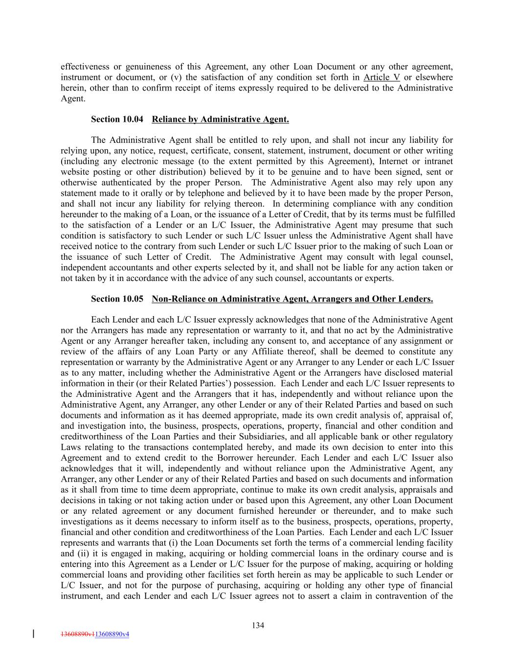 effectiveness or genuineness of this Agreement, any other Loan Document or any other agreement, instrument or document, or (v) the satisfaction of any condition set forth in Article V or elsewhere herein, other than to confirm receipt of items expressly required to be delivered to the Administrative Agent. Section 10.04 Reliance by Administrative Agent. The Administrative Agent shall be entitled to rely upon, and shall not incur any liability for relying upon, any notice, request, certificate, consent, statement, instrument, document or other writing (including any electronic message (to the extent permitted by this Agreement), Internet or intranet website posting or other distribution) believed by it to be genuine and to have been signed, sent or otherwise authenticated by the proper Person. The Administrative Agent also may rely upon any statement made to it orally or by telephone and believed by it to have been made by the proper Person, and shall not incur any liability for relying thereon. In determining compliance with any condition hereunder to the making of a Loan, or the issuance of a Letter of Credit, that by its terms must be fulfilled to the satisfaction of a Lender or an L/C Issuer, the Administrative Agent may presume that such condition is satisfactory to such Lender or such L/C Issuer unless the Administrative Agent shall have received notice to the contrary from such Lender or such L/C Issuer prior to the making of such Loan or the issuance of such Letter of Credit. The Administrative Agent may consult with legal counsel, independent accountants and other experts selected by it, and shall not be liable for any action taken or not taken by it in accordance with the advice of any such counsel, accountants or experts. Section 10.05 Non-Reliance on Administrative Agent, Arrangers and Other Lenders. Each Lender and each L/C Issuer expressly acknowledges that none of the Administrative Agent nor the Arrangers has made any representation or warranty to it, and that no act by the Administrative Agent or any Arranger hereafter taken, including any consent to, and acceptance of any assignment or review of the affairs of any Loan Party or any Affiliate thereof, shall be deemed to constitute any representation or warranty by the Administrative Agent or any Arranger to any Lender or each L/C Issuer as to any matter, including whether the Administrative Agent or the Arrangers have disclosed material information in their (or their Related Parties’) possession. Each Lender and each L/C Issuer represents to the Administrative Agent and the Arrangers that it has, independently and without reliance upon the Administrative Agent, any Arranger, any other Lender or any of their Related Parties and based on such documents and information as it has deemed appropriate, made its own credit analysis of, appraisal of, and investigation into, the business, prospects, operations, property, financial and other condition and creditworthiness of the Loan Parties and their Subsidiaries, and all applicable bank or other regulatory Laws relating to the transactions contemplated hereby, and made its own decision to enter into this Agreement and to extend credit to the Borrower hereunder. Each Lender and each L/C Issuer also acknowledges that it will, independently and without reliance upon the Administrative Agent, any Arranger, any other Lender or any of their Related Parties and based on such documents and information as it shall from time to time deem appropriate, continue to make its own credit analysis, appraisals and decisions in taking or not taking action under or based upon this Agreement, any other Loan Document or any related agreement or any document furnished hereunder or thereunder, and to make such investigations as it deems necessary to inform itself as to the business, prospects, operations, property, financial and other condition and creditworthiness of the Loan Parties. Each Lender and each L/C Issuer represents and warrants that (i) the Loan Documents set forth the terms of a commercial lending facility and (ii) it is engaged in making, acquiring or holding commercial loans in the ordinary course and is entering into this Agreement as a Lender or L/C Issuer for the purpose of making, acquiring or holding commercial loans and providing other facilities set forth herein as may be applicable to such Lender or L/C Issuer, and not for the purpose of purchasing, acquiring or holding any other type of financial instrument, and each Lender and each L/C Issuer agrees not to assert a claim in contravention of the 134 13608890v113608890v4