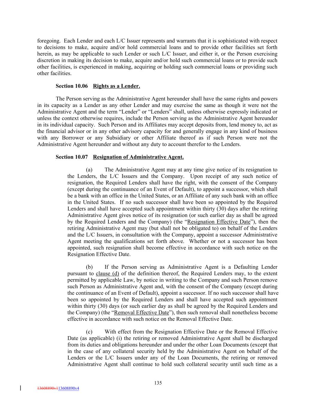 foregoing. Each Lender and each L/C Issuer represents and warrants that it is sophisticated with respect to decisions to make, acquire and/or hold commercial loans and to provide other facilities set forth herein, as may be applicable to such Lender or such L/C Issuer, and either it, or the Person exercising discretion in making its decision to make, acquire and/or hold such commercial loans or to provide such other facilities, is experienced in making, acquiring or holding such commercial loans or providing such other facilities. Section 10.06 Rights as a Lender. The Person serving as the Administrative Agent hereunder shall have the same rights and powers in its capacity as a Lender as any other Lender and may exercise the same as though it were not the Administrative Agent and the term “Lender” or “Lenders” shall, unless otherwise expressly indicated or unless the context otherwise requires, include the Person serving as the Administrative Agent hereunder in its individual capacity. Such Person and its Affiliates may accept deposits from, lend money to, act as the financial advisor or in any other advisory capacity for and generally engage in any kind of business with any Borrower or any Subsidiary or other Affiliate thereof as if such Person were not the Administrative Agent hereunder and without any duty to account therefor to the Lenders. Section 10.07 Resignation of Administrative Agent. (a) The Administrative Agent may at any time give notice of its resignation to the Lenders, the L/C Issuers and the Company. Upon receipt of any such notice of resignation, the Required Lenders shall have the right, with the consent of the Company (except during the continuance of an Event of Default), to appoint a successor, which shall be a bank with an office in the United States, or an Affiliate of any such bank with an office in the United States. If no such successor shall have been so appointed by the Required Lenders and shall have accepted such appointment within thirty (30) days after the retiring Administrative Agent gives notice of its resignation (or such earlier day as shall be agreed by the Required Lenders and the Company) (the “Resignation Effective Date”), then the retiring Administrative Agent may (but shall not be obligated to) on behalf of the Lenders and the L/C Issuers, in consultation with the Company, appoint a successor Administrative Agent meeting the qualifications set forth above. Whether or not a successor has been appointed, such resignation shall become effective in accordance with such notice on the Resignation Effective Date. (b) If the Person serving as Administrative Agent is a Defaulting Lender pursuant to clause (d) of the definition thereof, the Required Lenders may, to the extent permitted by applicable Law, by notice in writing to the Company and such Person remove such Person as Administrative Agent and, with the consent of the Company (except during the continuance of an Event of Default), appoint a successor. If no such successor shall have been so appointed by the Required Lenders and shall have accepted such appointment within thirty (30) days (or such earlier day as shall be agreed by the Required Lenders and the Company) (the “Removal Effective Date”), then such removal shall nonetheless become effective in accordance with such notice on the Removal Effective Date. (c) With effect from the Resignation Effective Date or the Removal Effective Date (as applicable) (i) the retiring or removed Administrative Agent shall be discharged from its duties and obligations hereunder and under the other Loan Documents (except that in the case of any collateral security held by the Administrative Agent on behalf of the Lenders or the L/C Issuers under any of the Loan Documents, the retiring or removed Administrative Agent shall continue to hold such collateral security until such time as a 135 13608890v113608890v4