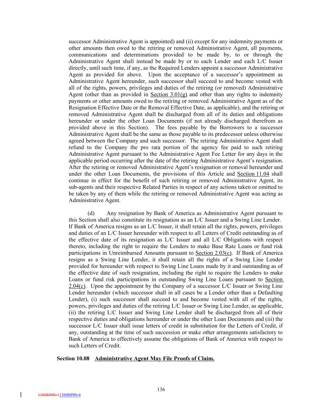 successor Administrative Agent is appointed) and (ii) except for any indemnity payments or other amounts then owed to the retiring or removed Administrative Agent, all payments, communications and determinations provided to be made by, to or through the Administrative Agent shall instead be made by or to each Lender and each L/C Issuer directly, until such time, if any, as the Required Lenders appoint a successor Administrative Agent as provided for above. Upon the acceptance of a successor’s appointment as Administrative Agent hereunder, such successor shall succeed to and become vested with all of the rights, powers, privileges and duties of the retiring (or removed) Administrative Agent (other than as provided in Section 3.01(g) and other than any rights to indemnity payments or other amounts owed to the retiring or removed Administrative Agent as of the Resignation Effective Date or the Removal Effective Date, as applicable), and the retiring or removed Administrative Agent shall be discharged from all of its duties and obligations hereunder or under the other Loan Documents (if not already discharged therefrom as provided above in this Section). The fees payable by the Borrowers to a successor Administrative Agent shall be the same as those payable to its predecessor unless otherwise agreed between the Company and such successor. The retiring Administrative Agent shall refund to the Company the pro rata portion of the agency fee paid to such retiring Administrative Agent pursuant to the Administrative Agent Fee Letter for any days in the applicable period occurring after the date of the retiring Administrative Agent’s resignation. After the retiring or removed Administrative Agent’s resignation or removal hereunder and under the other Loan Documents, the provisions of this Article and Section 11.04 shall continue in effect for the benefit of such retiring or removed Administrative Agent, its sub-agents and their respective Related Parties in respect of any actions taken or omitted to be taken by any of them while the retiring or removed Administrative Agent was acting as Administrative Agent. (d) Any resignation by Bank of America as Administrative Agent pursuant to this Section shall also constitute its resignation as an L/C Issuer and a Swing Line Lender. If Bank of America resigns as an L/C Issuer, it shall retain all the rights, powers, privileges and duties of an L/C Issuer hereunder with respect to all Letters of Credit outstanding as of the effective date of its resignation as L/C Issuer and all L/C Obligations with respect thereto, including the right to require the Lenders to make Base Rate Loans or fund risk participations in Unreimbursed Amounts pursuant to Section 2.03(c). If Bank of America resigns as a Swing Line Lender, it shall retain all the rights of a Swing Line Lender provided for hereunder with respect to Swing Line Loans made by it and outstanding as of the effective date of such resignation, including the right to require the Lenders to make Loans or fund risk participations in outstanding Swing Line Loans pursuant to Section 2.04(c). Upon the appointment by the Company of a successor L/C Issuer or Swing Line Lender hereunder (which successor shall in all cases be a Lender other than a Defaulting Lender), (i) such successor shall succeed to and become vested with all of the rights, powers, privileges and duties of the retiring L/C Issuer or Swing Line Lender, as applicable, (ii) the retiring L/C Issuer and Swing Line Lender shall be discharged from all of their respective duties and obligations hereunder or under the other Loan Documents and (iii) the successor L/C Issuer shall issue letters of credit in substitution for the Letters of Credit, if any, outstanding at the time of such succession or make other arrangements satisfactory to Bank of America to effectively assume the obligations of Bank of America with respect to such Letters of Credit. Section 10.08 Administrative Agent May File Proofs of Claim. 136 13608890v113608890v4