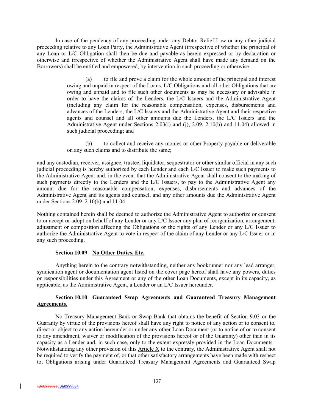 In case of the pendency of any proceeding under any Debtor Relief Law or any other judicial proceeding relative to any Loan Party, the Administrative Agent (irrespective of whether the principal of any Loan or L/C Obligation shall then be due and payable as herein expressed or by declaration or otherwise and irrespective of whether the Administrative Agent shall have made any demand on the Borrowers) shall be entitled and empowered, by intervention in such proceeding or otherwise (a) to file and prove a claim for the whole amount of the principal and interest owing and unpaid in respect of the Loans, L/C Obligations and all other Obligations that are owing and unpaid and to file such other documents as may be necessary or advisable in order to have the claims of the Lenders, the L/C Issuers and the Administrative Agent (including any claim for the reasonable compensation, expenses, disbursements and advances of the Lenders, the L/C Issuers and the Administrative Agent and their respective agents and counsel and all other amounts due the Lenders, the L/C Issuers and the Administrative Agent under Sections 2.03(i) and (j), 2.09, 2.10(b) and 11.04) allowed in such judicial proceeding; and (b) to collect and receive any monies or other Property payable or deliverable on any such claims and to distribute the same; and any custodian, receiver, assignee, trustee, liquidator, sequestrator or other similar official in any such judicial proceeding is hereby authorized by each Lender and each L/C Issuer to make such payments to the Administrative Agent and, in the event that the Administrative Agent shall consent to the making of such payments directly to the Lenders and the L/C Issuers, to pay to the Administrative Agent any amount due for the reasonable compensation, expenses, disbursements and advances of the Administrative Agent and its agents and counsel, and any other amounts due the Administrative Agent under Sections 2.09, 2.10(b) and 11.04. Nothing contained herein shall be deemed to authorize the Administrative Agent to authorize or consent to or accept or adopt on behalf of any Lender or any L/C Issuer any plan of reorganization, arrangement, adjustment or composition affecting the Obligations or the rights of any Lender or any L/C Issuer to authorize the Administrative Agent to vote in respect of the claim of any Lender or any L/C Issuer or in any such proceeding. Section 10.09 No Other Duties, Etc. Anything herein to the contrary notwithstanding, neither any bookrunner nor any lead arranger, syndication agent or documentation agent listed on the cover page hereof shall have any powers, duties or responsibilities under this Agreement or any of the other Loan Documents, except in its capacity, as applicable, as the Administrative Agent, a Lender or an L/C Issuer hereunder. Section 10.10 Guaranteed Swap Agreements and Guaranteed Treasury Management Agreements. No Treasury Management Bank or Swap Bank that obtains the benefit of Section 9.03 or the Guaranty by virtue of the provisions hereof shall have any right to notice of any action or to consent to, direct or object to any action hereunder or under any other Loan Document (or to notice of or to consent to any amendment, waiver or modification of the provisions hereof or of the Guaranty) other than in its capacity as a Lender and, in such case, only to the extent expressly provided in the Loan Documents. Notwithstanding any other provision of this Article X to the contrary, the Administrative Agent shall not be required to verify the payment of, or that other satisfactory arrangements have been made with respect to, Obligations arising under Guaranteed Treasury Management Agreements and Guaranteed Swap 137 13608890v113608890v4
