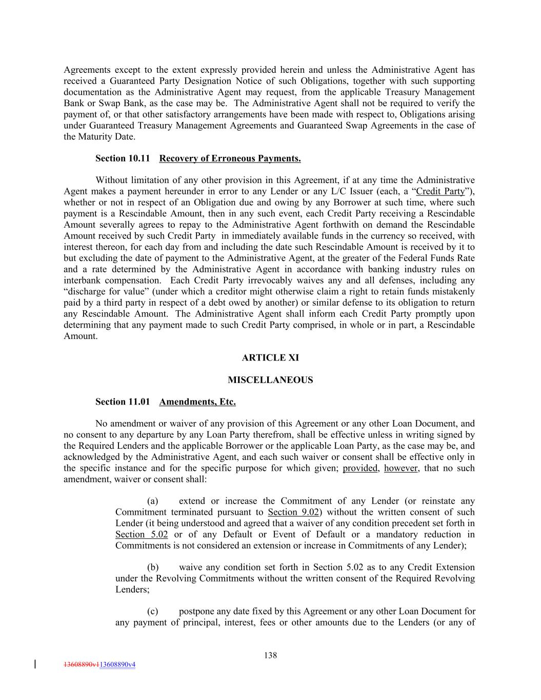 Agreements except to the extent expressly provided herein and unless the Administrative Agent has received a Guaranteed Party Designation Notice of such Obligations, together with such supporting documentation as the Administrative Agent may request, from the applicable Treasury Management Bank or Swap Bank, as the case may be. The Administrative Agent shall not be required to verify the payment of, or that other satisfactory arrangements have been made with respect to, Obligations arising under Guaranteed Treasury Management Agreements and Guaranteed Swap Agreements in the case of the Maturity Date. Section 10.11 Recovery of Erroneous Payments. Without limitation of any other provision in this Agreement, if at any time the Administrative Agent makes a payment hereunder in error to any Lender or any L/C Issuer (each, a “Credit Party”), whether or not in respect of an Obligation due and owing by any Borrower at such time, where such payment is a Rescindable Amount, then in any such event, each Credit Party receiving a Rescindable Amount severally agrees to repay to the Administrative Agent forthwith on demand the Rescindable Amount received by such Credit Party in immediately available funds in the currency so received, with interest thereon, for each day from and including the date such Rescindable Amount is received by it to but excluding the date of payment to the Administrative Agent, at the greater of the Federal Funds Rate and a rate determined by the Administrative Agent in accordance with banking industry rules on interbank compensation. Each Credit Party irrevocably waives any and all defenses, including any “discharge for value” (under which a creditor might otherwise claim a right to retain funds mistakenly paid by a third party in respect of a debt owed by another) or similar defense to its obligation to return any Rescindable Amount. The Administrative Agent shall inform each Credit Party promptly upon determining that any payment made to such Credit Party comprised, in whole or in part, a Rescindable Amount. ARTICLE XI MISCELLANEOUS Section 11.01 Amendments, Etc. No amendment or waiver of any provision of this Agreement or any other Loan Document, and no consent to any departure by any Loan Party therefrom, shall be effective unless in writing signed by the Required Lenders and the applicable Borrower or the applicable Loan Party, as the case may be, and acknowledged by the Administrative Agent, and each such waiver or consent shall be effective only in the specific instance and for the specific purpose for which given; provided, however, that no such amendment, waiver or consent shall: (a) extend or increase the Commitment of any Lender (or reinstate any Commitment terminated pursuant to Section 9.02) without the written consent of such Lender (it being understood and agreed that a waiver of any condition precedent set forth in Section 5.02 or of any Default or Event of Default or a mandatory reduction in Commitments is not considered an extension or increase in Commitments of any Lender); (b) waive any condition set forth in Section 5.02 as to any Credit Extension under the Revolving Commitments without the written consent of the Required Revolving Lenders; (c) postpone any date fixed by this Agreement or any other Loan Document for any payment of principal, interest, fees or other amounts due to the Lenders (or any of 138 13608890v113608890v4