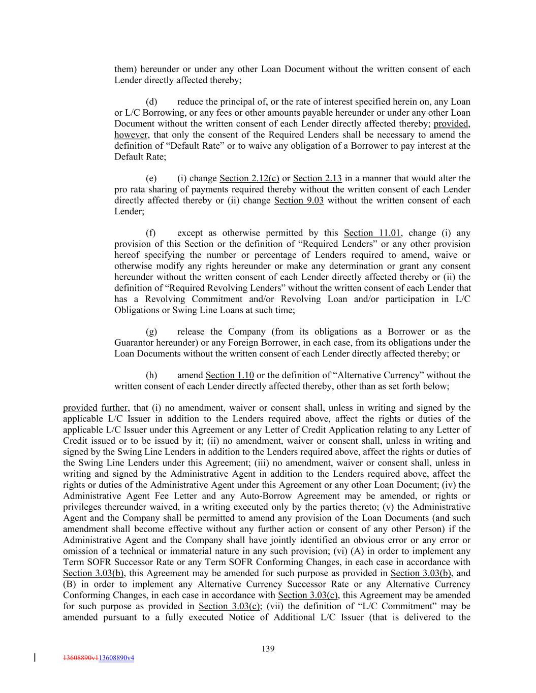 them) hereunder or under any other Loan Document without the written consent of each Lender directly affected thereby; (d) reduce the principal of, or the rate of interest specified herein on, any Loan or L/C Borrowing, or any fees or other amounts payable hereunder or under any other Loan Document without the written consent of each Lender directly affected thereby; provided, however, that only the consent of the Required Lenders shall be necessary to amend the definition of “Default Rate” or to waive any obligation of a Borrower to pay interest at the Default Rate; (e) (i) change Section 2.12(c) or Section 2.13 in a manner that would alter the pro rata sharing of payments required thereby without the written consent of each Lender directly affected thereby or (ii) change Section 9.03 without the written consent of each Lender; (f) except as otherwise permitted by this Section 11.01, change (i) any provision of this Section or the definition of “Required Lenders” or any other provision hereof specifying the number or percentage of Lenders required to amend, waive or otherwise modify any rights hereunder or make any determination or grant any consent hereunder without the written consent of each Lender directly affected thereby or (ii) the definition of “Required Revolving Lenders” without the written consent of each Lender that has a Revolving Commitment and/or Revolving Loan and/or participation in L/C Obligations or Swing Line Loans at such time; (g) release the Company (from its obligations as a Borrower or as the Guarantor hereunder) or any Foreign Borrower, in each case, from its obligations under the Loan Documents without the written consent of each Lender directly affected thereby; or (h) amend Section 1.10 or the definition of “Alternative Currency” without the written consent of each Lender directly affected thereby, other than as set forth below; provided further, that (i) no amendment, waiver or consent shall, unless in writing and signed by the applicable L/C Issuer in addition to the Lenders required above, affect the rights or duties of the applicable L/C Issuer under this Agreement or any Letter of Credit Application relating to any Letter of Credit issued or to be issued by it; (ii) no amendment, waiver or consent shall, unless in writing and signed by the Swing Line Lenders in addition to the Lenders required above, affect the rights or duties of the Swing Line Lenders under this Agreement; (iii) no amendment, waiver or consent shall, unless in writing and signed by the Administrative Agent in addition to the Lenders required above, affect the rights or duties of the Administrative Agent under this Agreement or any other Loan Document; (iv) the Administrative Agent Fee Letter and any Auto-Borrow Agreement may be amended, or rights or privileges thereunder waived, in a writing executed only by the parties thereto; (v) the Administrative Agent and the Company shall be permitted to amend any provision of the Loan Documents (and such amendment shall become effective without any further action or consent of any other Person) if the Administrative Agent and the Company shall have jointly identified an obvious error or any error or omission of a technical or immaterial nature in any such provision; (vi) (A) in order to implement any Term SOFR Successor Rate or any Term SOFR Conforming Changes, in each case in accordance with Section 3.03(b), this Agreement may be amended for such purpose as provided in Section 3.03(b), and (B) in order to implement any Alternative Currency Successor Rate or any Alternative Currency Conforming Changes, in each case in accordance with Section 3.03(c), this Agreement may be amended for such purpose as provided in Section 3.03(c); (vii) the definition of “L/C Commitment” may be amended pursuant to a fully executed Notice of Additional L/C Issuer (that is delivered to the 139 13608890v113608890v4