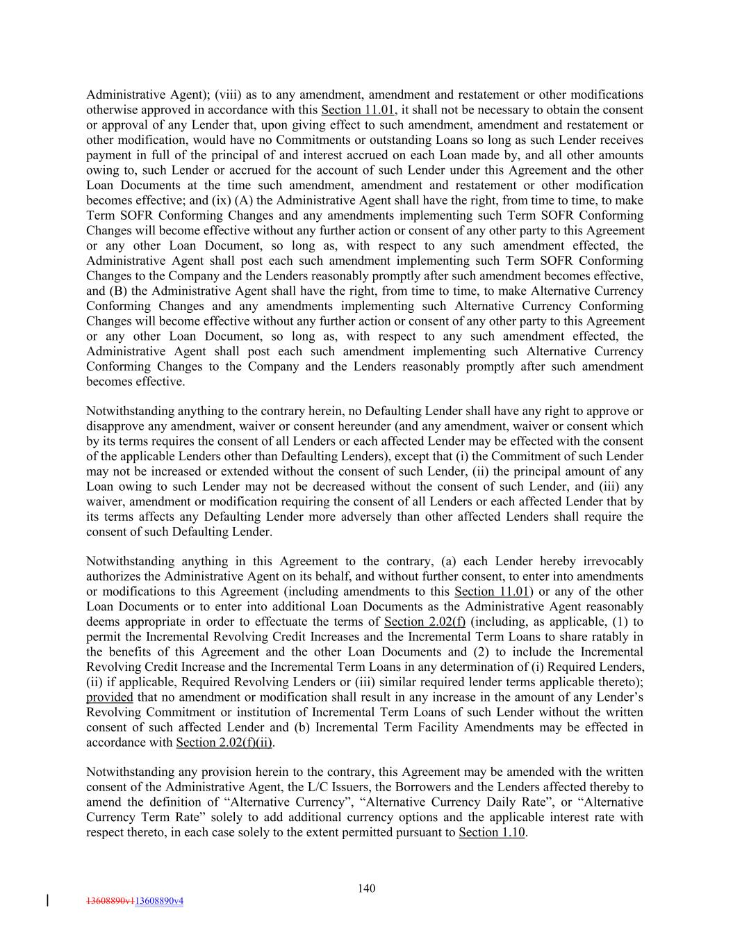 Administrative Agent); (viii) as to any amendment, amendment and restatement or other modifications otherwise approved in accordance with this Section 11.01, it shall not be necessary to obtain the consent or approval of any Lender that, upon giving effect to such amendment, amendment and restatement or other modification, would have no Commitments or outstanding Loans so long as such Lender receives payment in full of the principal of and interest accrued on each Loan made by, and all other amounts owing to, such Lender or accrued for the account of such Lender under this Agreement and the other Loan Documents at the time such amendment, amendment and restatement or other modification becomes effective; and (ix) (A) the Administrative Agent shall have the right, from time to time, to make Term SOFR Conforming Changes and any amendments implementing such Term SOFR Conforming Changes will become effective without any further action or consent of any other party to this Agreement or any other Loan Document, so long as, with respect to any such amendment effected, the Administrative Agent shall post each such amendment implementing such Term SOFR Conforming Changes to the Company and the Lenders reasonably promptly after such amendment becomes effective, and (B) the Administrative Agent shall have the right, from time to time, to make Alternative Currency Conforming Changes and any amendments implementing such Alternative Currency Conforming Changes will become effective without any further action or consent of any other party to this Agreement or any other Loan Document, so long as, with respect to any such amendment effected, the Administrative Agent shall post each such amendment implementing such Alternative Currency Conforming Changes to the Company and the Lenders reasonably promptly after such amendment becomes effective. Notwithstanding anything to the contrary herein, no Defaulting Lender shall have any right to approve or disapprove any amendment, waiver or consent hereunder (and any amendment, waiver or consent which by its terms requires the consent of all Lenders or each affected Lender may be effected with the consent of the applicable Lenders other than Defaulting Lenders), except that (i) the Commitment of such Lender may not be increased or extended without the consent of such Lender, (ii) the principal amount of any Loan owing to such Lender may not be decreased without the consent of such Lender, and (iii) any waiver, amendment or modification requiring the consent of all Lenders or each affected Lender that by its terms affects any Defaulting Lender more adversely than other affected Lenders shall require the consent of such Defaulting Lender. Notwithstanding anything in this Agreement to the contrary, (a) each Lender hereby irrevocably authorizes the Administrative Agent on its behalf, and without further consent, to enter into amendments or modifications to this Agreement (including amendments to this Section 11.01) or any of the other Loan Documents or to enter into additional Loan Documents as the Administrative Agent reasonably deems appropriate in order to effectuate the terms of Section 2.02(f) (including, as applicable, (1) to permit the Incremental Revolving Credit Increases and the Incremental Term Loans to share ratably in the benefits of this Agreement and the other Loan Documents and (2) to include the Incremental Revolving Credit Increase and the Incremental Term Loans in any determination of (i) Required Lenders, (ii) if applicable, Required Revolving Lenders or (iii) similar required lender terms applicable thereto); provided that no amendment or modification shall result in any increase in the amount of any Lender’s Revolving Commitment or institution of Incremental Term Loans of such Lender without the written consent of such affected Lender and (b) Incremental Term Facility Amendments may be effected in accordance with Section 2.02(f)(ii). Notwithstanding any provision herein to the contrary, this Agreement may be amended with the written consent of the Administrative Agent, the L/C Issuers, the Borrowers and the Lenders affected thereby to amend the definition of “Alternative Currency”, “Alternative Currency Daily Rate”, or “Alternative Currency Term Rate” solely to add additional currency options and the applicable interest rate with respect thereto, in each case solely to the extent permitted pursuant to Section 1.10. 140 13608890v113608890v4