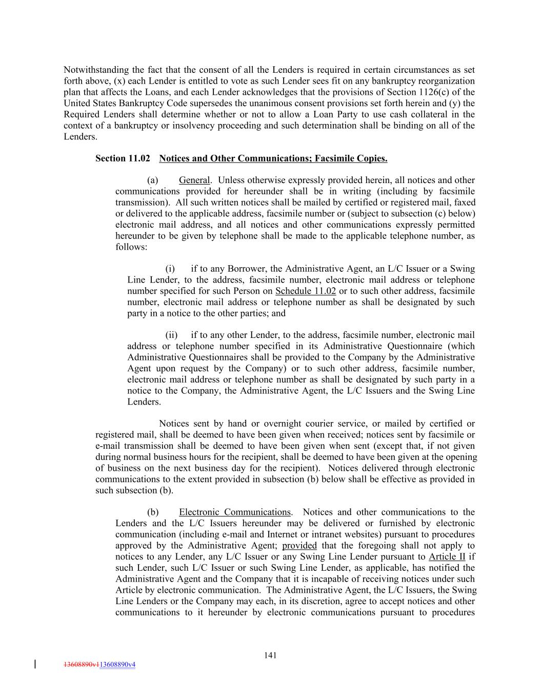 Notwithstanding the fact that the consent of all the Lenders is required in certain circumstances as set forth above, (x) each Lender is entitled to vote as such Lender sees fit on any bankruptcy reorganization plan that affects the Loans, and each Lender acknowledges that the provisions of Section 1126(c) of the United States Bankruptcy Code supersedes the unanimous consent provisions set forth herein and (y) the Required Lenders shall determine whether or not to allow a Loan Party to use cash collateral in the context of a bankruptcy or insolvency proceeding and such determination shall be binding on all of the Lenders. Section 11.02 Notices and Other Communications; Facsimile Copies. (a) General. Unless otherwise expressly provided herein, all notices and other communications provided for hereunder shall be in writing (including by facsimile transmission). All such written notices shall be mailed by certified or registered mail, faxed or delivered to the applicable address, facsimile number or (subject to subsection (c) below) electronic mail address, and all notices and other communications expressly permitted hereunder to be given by telephone shall be made to the applicable telephone number, as follows: (i) if to any Borrower, the Administrative Agent, an L/C Issuer or a Swing Line Lender, to the address, facsimile number, electronic mail address or telephone number specified for such Person on Schedule 11.02 or to such other address, facsimile number, electronic mail address or telephone number as shall be designated by such party in a notice to the other parties; and (ii) if to any other Lender, to the address, facsimile number, electronic mail address or telephone number specified in its Administrative Questionnaire (which Administrative Questionnaires shall be provided to the Company by the Administrative Agent upon request by the Company) or to such other address, facsimile number, electronic mail address or telephone number as shall be designated by such party in a notice to the Company, the Administrative Agent, the L/C Issuers and the Swing Line Lenders. Notices sent by hand or overnight courier service, or mailed by certified or registered mail, shall be deemed to have been given when received; notices sent by facsimile or e-mail transmission shall be deemed to have been given when sent (except that, if not given during normal business hours for the recipient, shall be deemed to have been given at the opening of business on the next business day for the recipient). Notices delivered through electronic communications to the extent provided in subsection (b) below shall be effective as provided in such subsection (b). (b) Electronic Communications. Notices and other communications to the Lenders and the L/C Issuers hereunder may be delivered or furnished by electronic communication (including e-mail and Internet or intranet websites) pursuant to procedures approved by the Administrative Agent; provided that the foregoing shall not apply to notices to any Lender, any L/C Issuer or any Swing Line Lender pursuant to Article II if such Lender, such L/C Issuer or such Swing Line Lender, as applicable, has notified the Administrative Agent and the Company that it is incapable of receiving notices under such Article by electronic communication. The Administrative Agent, the L/C Issuers, the Swing Line Lenders or the Company may each, in its discretion, agree to accept notices and other communications to it hereunder by electronic communications pursuant to procedures 141 13608890v113608890v4
