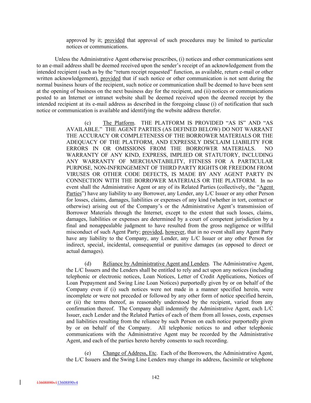approved by it; provided that approval of such procedures may be limited to particular notices or communications. Unless the Administrative Agent otherwise prescribes, (i) notices and other communications sent to an e-mail address shall be deemed received upon the sender’s receipt of an acknowledgement from the intended recipient (such as by the “return receipt requested” function, as available, return e-mail or other written acknowledgement), provided that if such notice or other communication is not sent during the normal business hours of the recipient, such notice or communication shall be deemed to have been sent at the opening of business on the next business day for the recipient, and (ii) notices or communications posted to an Internet or intranet website shall be deemed received upon the deemed receipt by the intended recipient at its e-mail address as described in the foregoing clause (i) of notification that such notice or communication is available and identifying the website address therefor. (c) The Platform. THE PLATFORM IS PROVIDED “AS IS” AND “AS AVAILABLE.” THE AGENT PARTIES (AS DEFINED BELOW) DO NOT WARRANT THE ACCURACY OR COMPLETENESS OF THE BORROWER MATERIALS OR THE ADEQUACY OF THE PLATFORM, AND EXPRESSLY DISCLAIM LIABILITY FOR ERRORS IN OR OMISSIONS FROM THE BORROWER MATERIALS. NO WARRANTY OF ANY KIND, EXPRESS, IMPLIED OR STATUTORY, INCLUDING ANY WARRANTY OF MERCHANTABILITY, FITNESS FOR A PARTICULAR PURPOSE, NON-INFRINGEMENT OF THIRD PARTY RIGHTS OR FREEDOM FROM VIRUSES OR OTHER CODE DEFECTS, IS MADE BY ANY AGENT PARTY IN CONNECTION WITH THE BORROWER MATERIALS OR THE PLATFORM. In no event shall the Administrative Agent or any of its Related Parties (collectively, the “Agent Parties”) have any liability to any Borrower, any Lender, any L/C Issuer or any other Person for losses, claims, damages, liabilities or expenses of any kind (whether in tort, contract or otherwise) arising out of the Company’s or the Administrative Agent’s transmission of Borrower Materials through the Internet, except to the extent that such losses, claims, damages, liabilities or expenses are determined by a court of competent jurisdiction by a final and nonappealable judgment to have resulted from the gross negligence or willful misconduct of such Agent Party; provided, however, that in no event shall any Agent Party have any liability to the Company, any Lender, any L/C Issuer or any other Person for indirect, special, incidental, consequential or punitive damages (as opposed to direct or actual damages). (d) Reliance by Administrative Agent and Lenders. The Administrative Agent, the L/C Issuers and the Lenders shall be entitled to rely and act upon any notices (including telephonic or electronic notices, Loan Notices, Letter of Credit Applications, Notices of Loan Prepayment and Swing Line Loan Notices) purportedly given by or on behalf of the Company even if (i) such notices were not made in a manner specified herein, were incomplete or were not preceded or followed by any other form of notice specified herein, or (ii) the terms thereof, as reasonably understood by the recipient, varied from any confirmation thereof. The Company shall indemnify the Administrative Agent, each L/C Issuer, each Lender and the Related Parties of each of them from all losses, costs, expenses and liabilities resulting from the reliance by such Person on each notice purportedly given by or on behalf of the Company. All telephonic notices to and other telephonic communications with the Administrative Agent may be recorded by the Administrative Agent, and each of the parties hereto hereby consents to such recording. (e) Change of Address, Etc. Each of the Borrowers, the Administrative Agent, the L/C Issuers and the Swing Line Lenders may change its address, facsimile or telephone 142 13608890v113608890v4