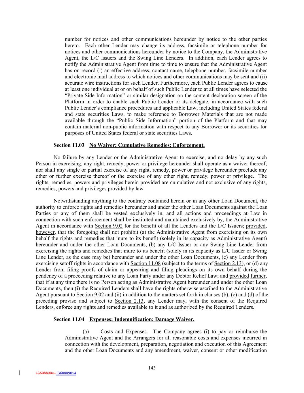 number for notices and other communications hereunder by notice to the other parties hereto. Each other Lender may change its address, facsimile or telephone number for notices and other communications hereunder by notice to the Company, the Administrative Agent, the L/C Issuers and the Swing Line Lenders. In addition, each Lender agrees to notify the Administrative Agent from time to time to ensure that the Administrative Agent has on record (i) an effective address, contact name, telephone number, facsimile number and electronic mail address to which notices and other communications may be sent and (ii) accurate wire instructions for such Lender. Furthermore, each Public Lender agrees to cause at least one individual at or on behalf of such Public Lender to at all times have selected the “Private Side Information” or similar designation on the content declaration screen of the Platform in order to enable such Public Lender or its delegate, in accordance with such Public Lender’s compliance procedures and applicable Law, including United States federal and state securities Laws, to make reference to Borrower Materials that are not made available through the “Public Side Information” portion of the Platform and that may contain material non-public information with respect to any Borrower or its securities for purposes of United States federal or state securities Laws. Section 11.03 No Waiver; Cumulative Remedies; Enforcement. No failure by any Lender or the Administrative Agent to exercise, and no delay by any such Person in exercising, any right, remedy, power or privilege hereunder shall operate as a waiver thereof; nor shall any single or partial exercise of any right, remedy, power or privilege hereunder preclude any other or further exercise thereof or the exercise of any other right, remedy, power or privilege. The rights, remedies, powers and privileges herein provided are cumulative and not exclusive of any rights, remedies, powers and privileges provided by law. Notwithstanding anything to the contrary contained herein or in any other Loan Document, the authority to enforce rights and remedies hereunder and under the other Loan Documents against the Loan Parties or any of them shall be vested exclusively in, and all actions and proceedings at Law in connection with such enforcement shall be instituted and maintained exclusively by, the Administrative Agent in accordance with Section 9.02 for the benefit of all the Lenders and the L/C Issuers; provided, however, that the foregoing shall not prohibit (a) the Administrative Agent from exercising on its own behalf the rights and remedies that inure to its benefit (solely in its capacity as Administrative Agent) hereunder and under the other Loan Documents, (b) any L/C Issuer or any Swing Line Lender from exercising the rights and remedies that inure to its benefit (solely in its capacity as L/C Issuer or Swing Line Lender, as the case may be) hereunder and under the other Loan Documents, (c) any Lender from exercising setoff rights in accordance with Section 11.08 (subject to the terms of Section 2.13), or (d) any Lender from filing proofs of claim or appearing and filing pleadings on its own behalf during the pendency of a proceeding relative to any Loan Party under any Debtor Relief Law; and provided further, that if at any time there is no Person acting as Administrative Agent hereunder and under the other Loan Documents, then (i) the Required Lenders shall have the rights otherwise ascribed to the Administrative Agent pursuant to Section 9.02 and (ii) in addition to the matters set forth in clauses (b), (c) and (d) of the preceding proviso and subject to Section 2.13, any Lender may, with the consent of the Required Lenders, enforce any rights and remedies available to it and as authorized by the Required Lenders. Section 11.04 Expenses; Indemnification; Damage Waiver. (a) Costs and Expenses. The Company agrees (i) to pay or reimburse the Administrative Agent and the Arrangers for all reasonable costs and expenses incurred in connection with the development, preparation, negotiation and execution of this Agreement and the other Loan Documents and any amendment, waiver, consent or other modification 143 13608890v113608890v4